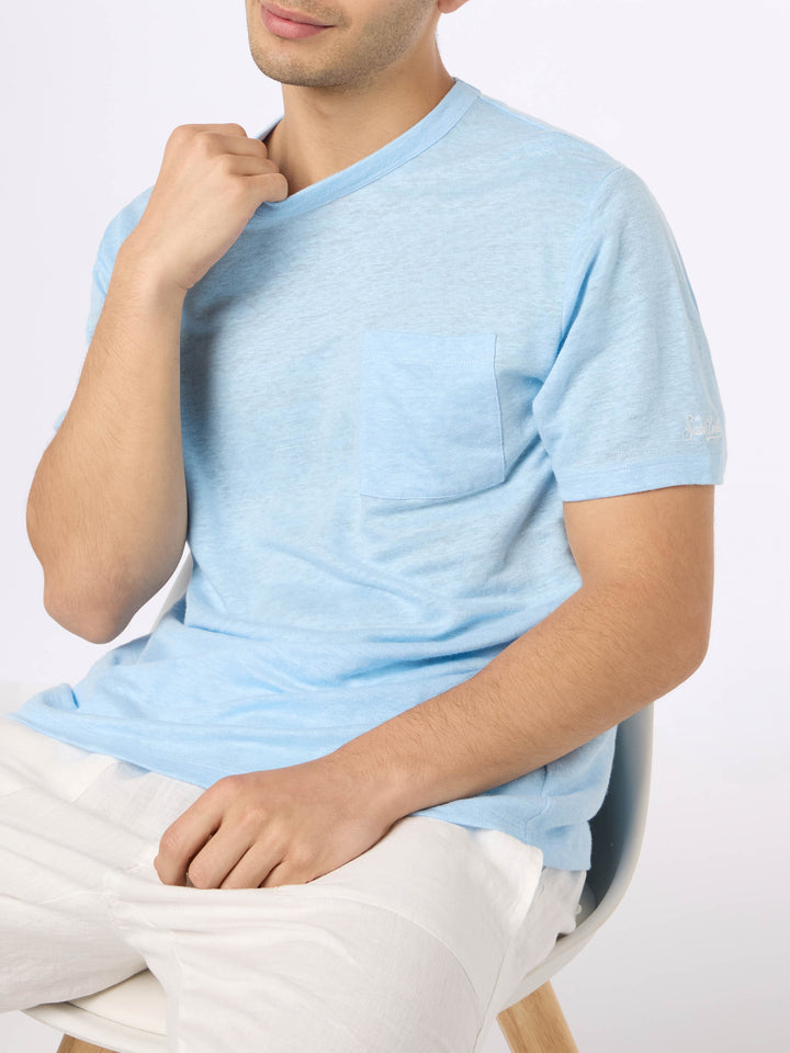 • Man light blue linen jersey t-shirt Ecstasea with pocket - MC2 Saint Barth Man light blue linen jersey t-shirt Ecstasea with pocket - MC2 Saint Barth