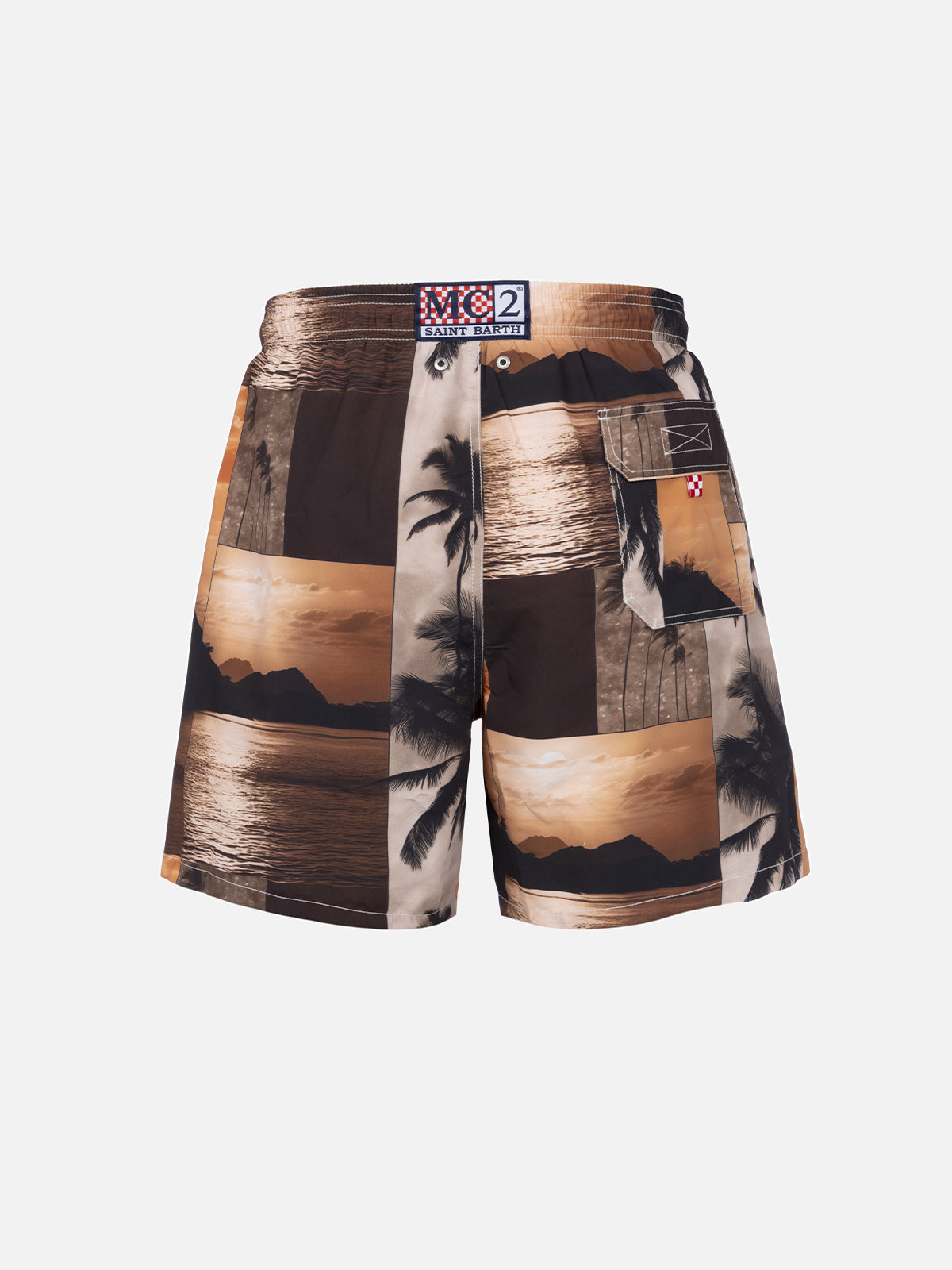 Costume da bagno da uomo Gustavia lunghezza media con stampa foto tramonto | AI CO-CREATED DESIGN BY RICKDICK - POWERED BY RED-EYE