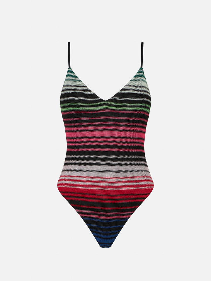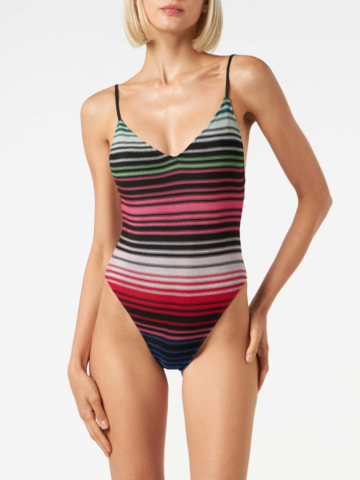 • Woman light blue and bluette striped print one piece swimsuit - MC2 Saint Barth Woman light blue and bluette striped print one piece swimsuit - MC2 Saint Barth