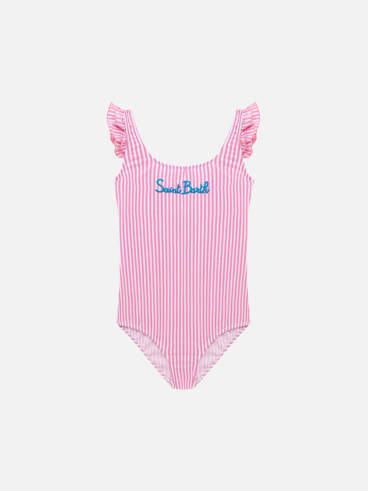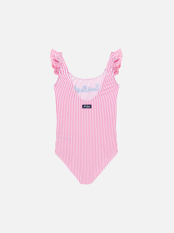 • Girl seersucker cotton one piece swimsuit Tilda with ruffled straps - MC2 Saint Barth Girl seersucker cotton one piece swimsuit Tilda with ruffled straps - MC2 Saint Barth