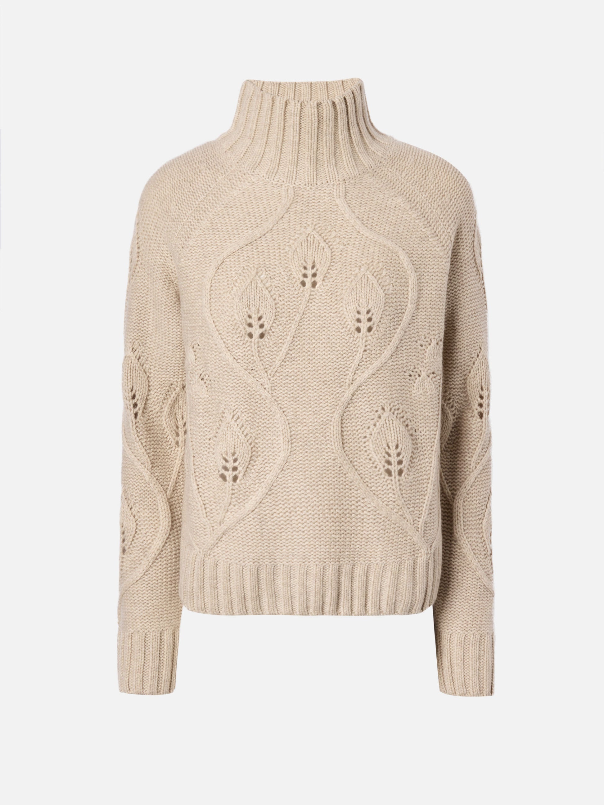 Beigefarbener Alais-Pullover mit Stehkragen aus Kaschmirmischung mit 3D-Blumen