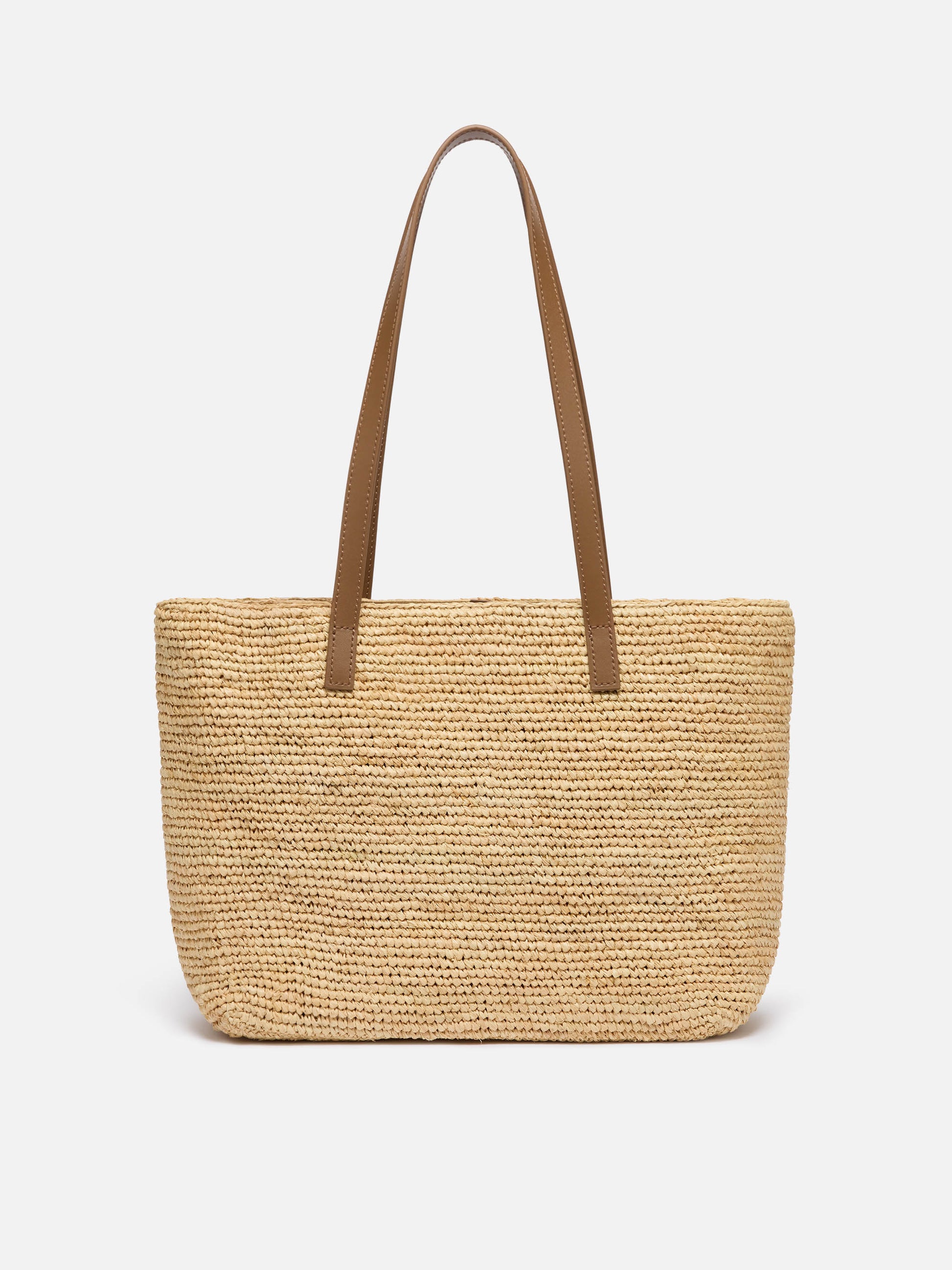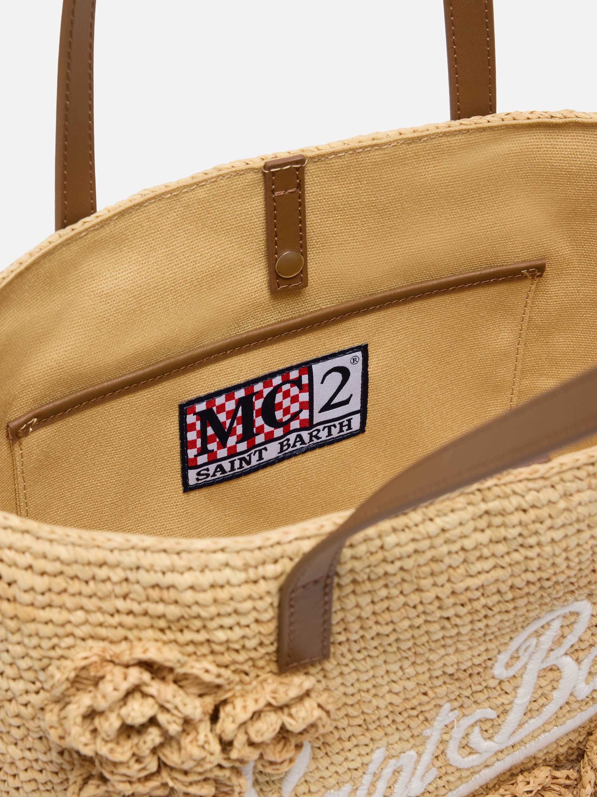 Beigefarbene Tasche City Mid aus Raffiabast mit Blumen-Applikationen