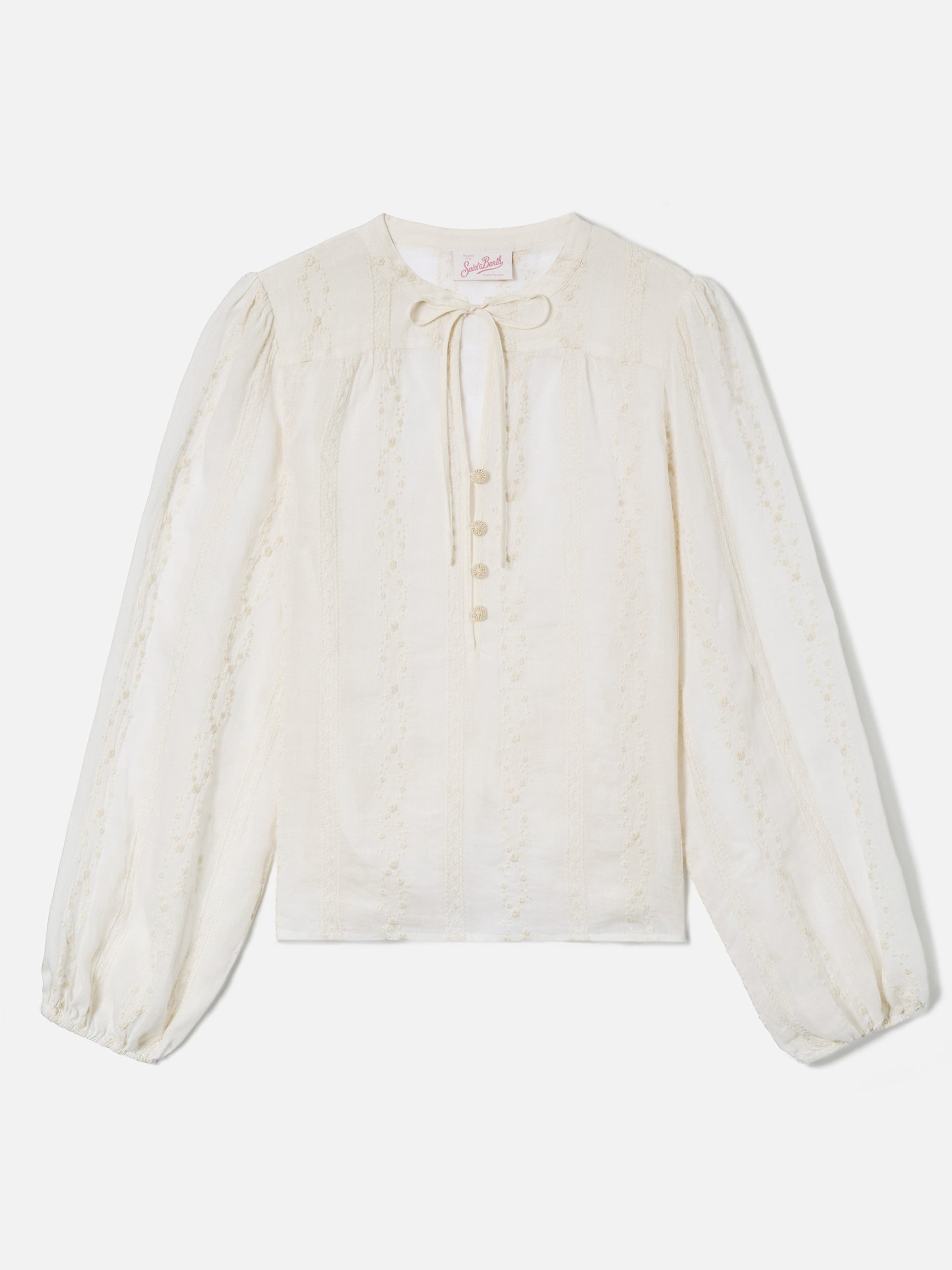 https://it.mc2saintbarth.com/de/products/beige-ramie-harper-blouse-with-embroidered-motif10781306454362Blusa Harper in ramie beige con motivo ricamato169,00https:files/UID_HRP00100218L-WOMAN-SHIRT-WHITE-MC2-MC2_2.jpghttps:files/UID_HRP00100218L-WOMAN-SHIRT-WHITE-MC2-MC2_2.jpgEUROutOfStockSHIRT650948313434Alle Produkte – nur für Frauen649134276954AVADA - Bestseller623513403738Damen Sets672324419930New In - Woman647269351770Tops - Damen654980481370Upselling_DamenhemdenLa blusa Harper è realizzata in ramie, un tessuto leggero e traspirante pensato per offrire comfort e freschezza. Il design beige con motivo ricamato tono su tono a righe verticali definisce il capo con un’estetica delicata e raffinata. Il modello presenta collo alla coreana e scollo a V con laccetto che valorizzano la linea con naturalezza. Il capo è completato da maniche lunghe con polsi elasticizzati che definiscono la struttura del modello. La linea relaxed garantisce una vestibilità comoda e naturale.