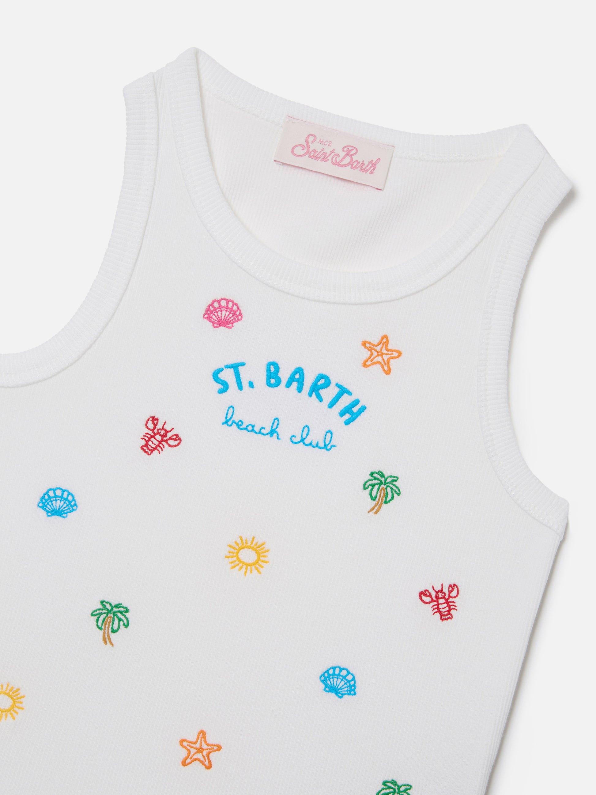 Top Blue Jr in cotone elasticizzato bianco con ricami multicolor