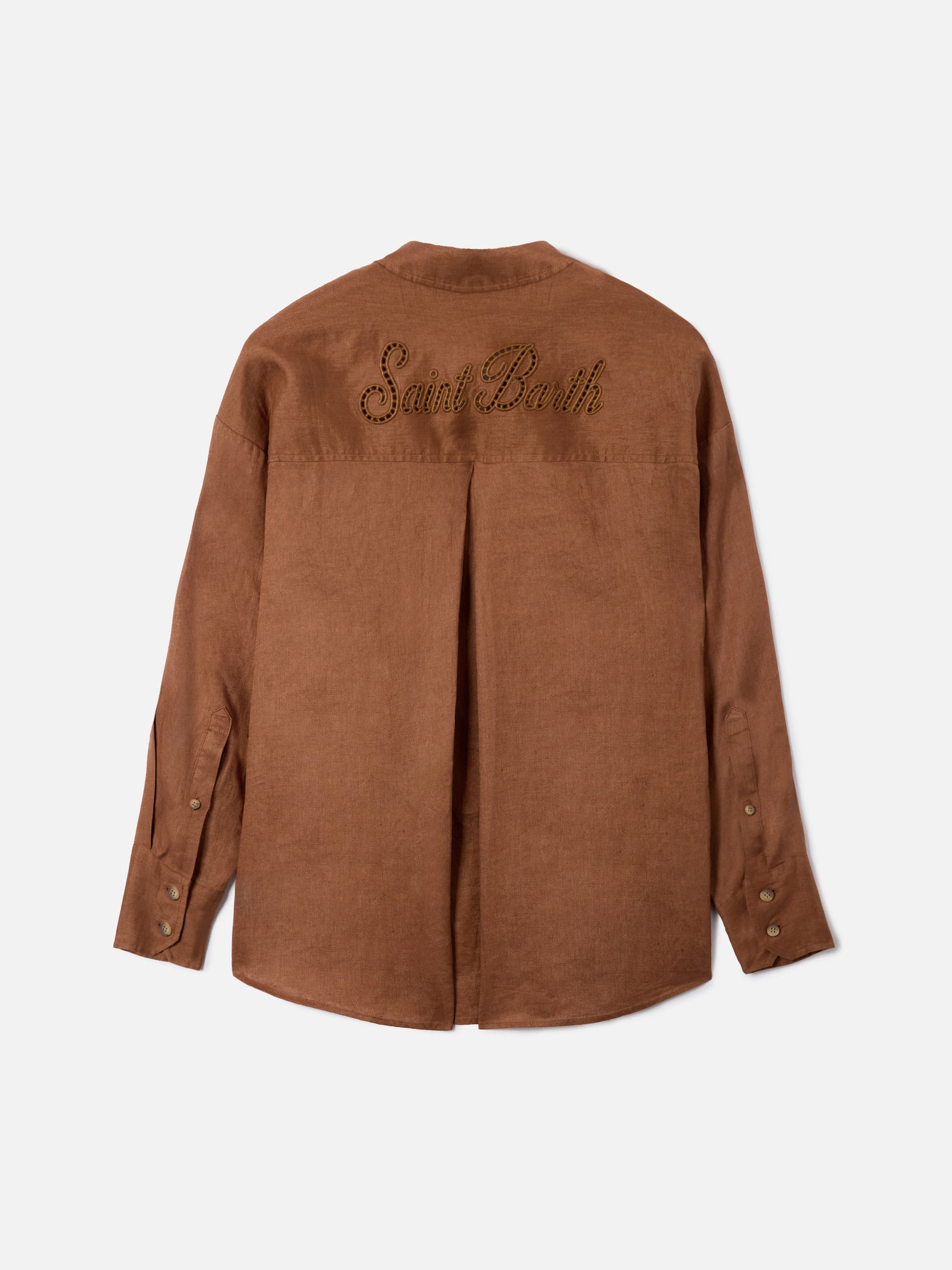 Camicia Cristal in lino marrone con ricamo Saint Barth traforato
