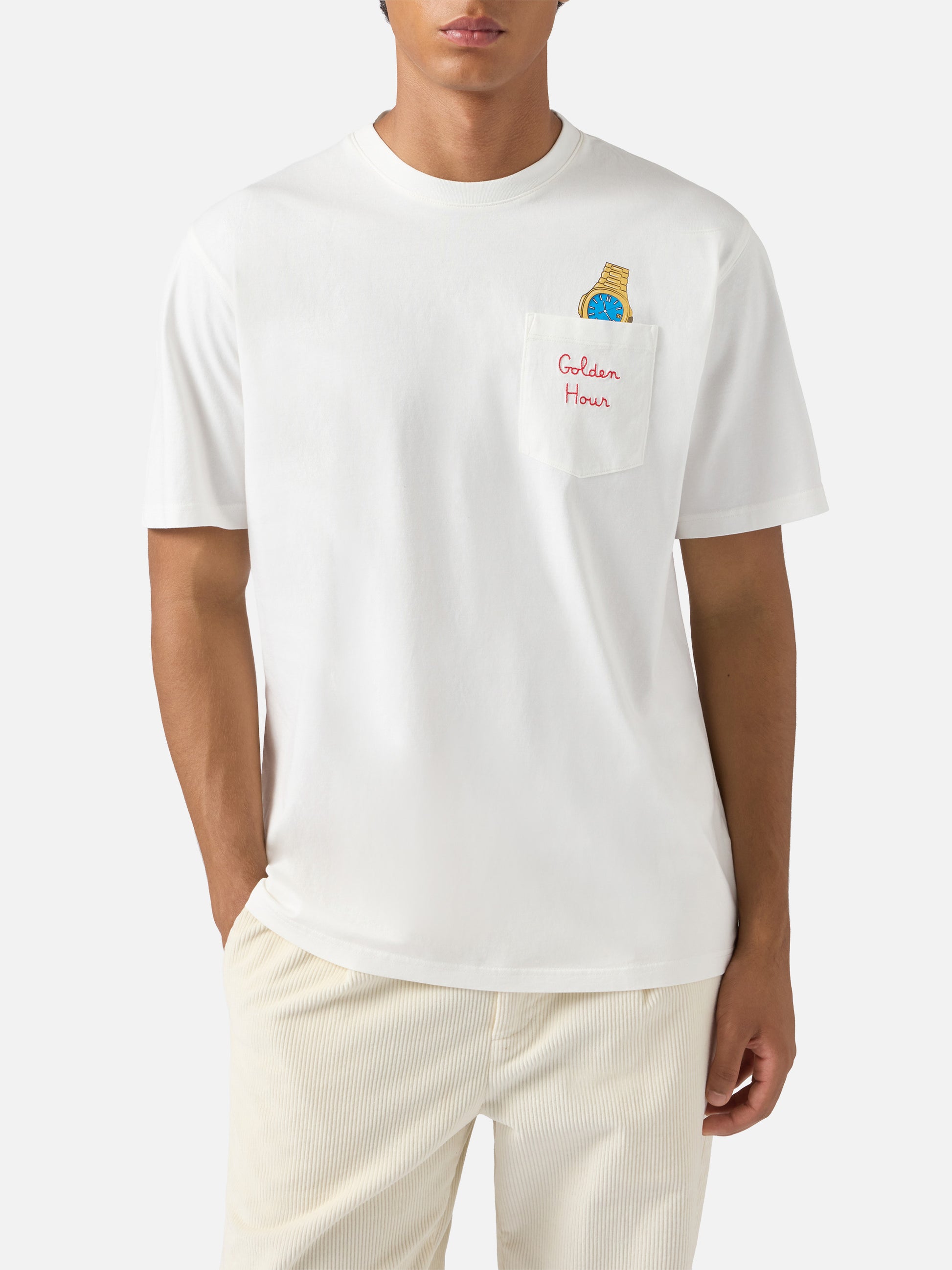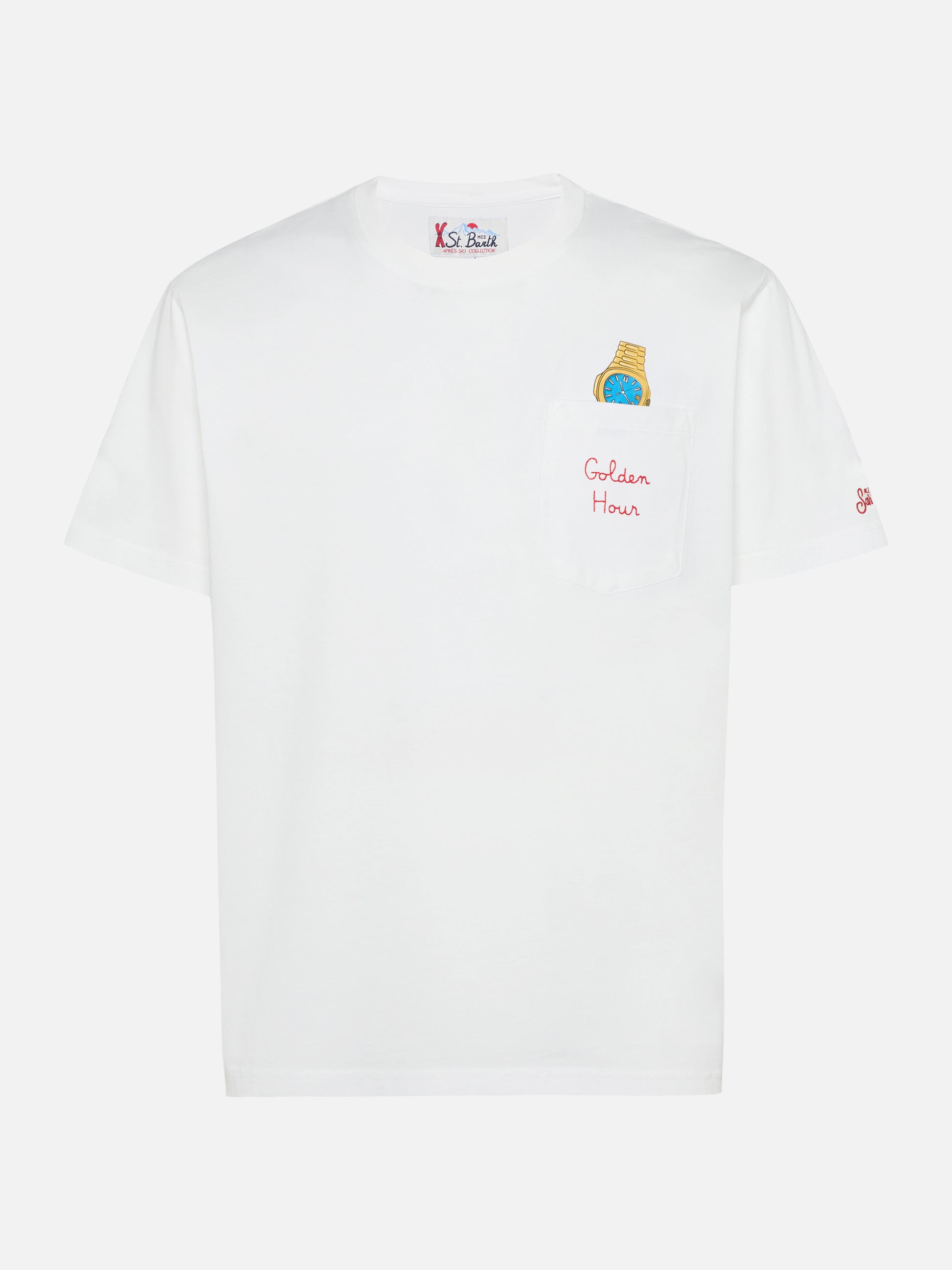 Connor Baumwoll-T-Shirt in Weiß mit goldener Stundenstickerei an der Brusttasche