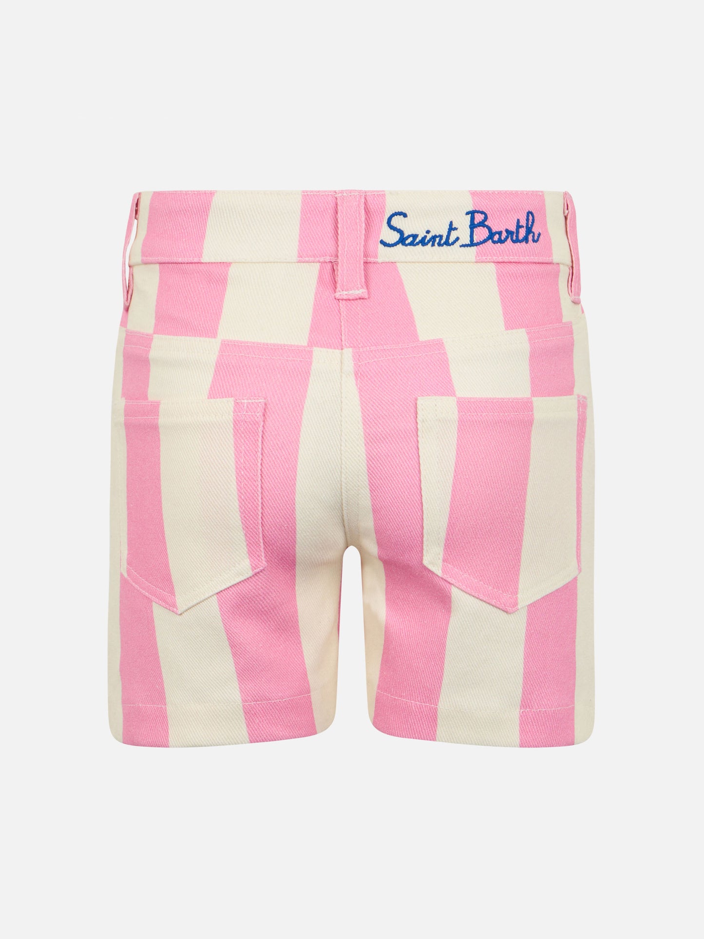 Dieses Design im Retro-Stil zeichnet sich durch eine einzigartige Konstruktion aus und passt zum Mama-Outfit Denim-Bermuda für Mädchen Bequemer Schnitt an Hüfte und Oberschenkeln Gerades kurzes Bein Mittlere Taille Verdeckter Reißverschluss Rosa gestreifter Allover-Druck Zusammensetzung: 98 % Baumwolle, 2 % Elasthan
