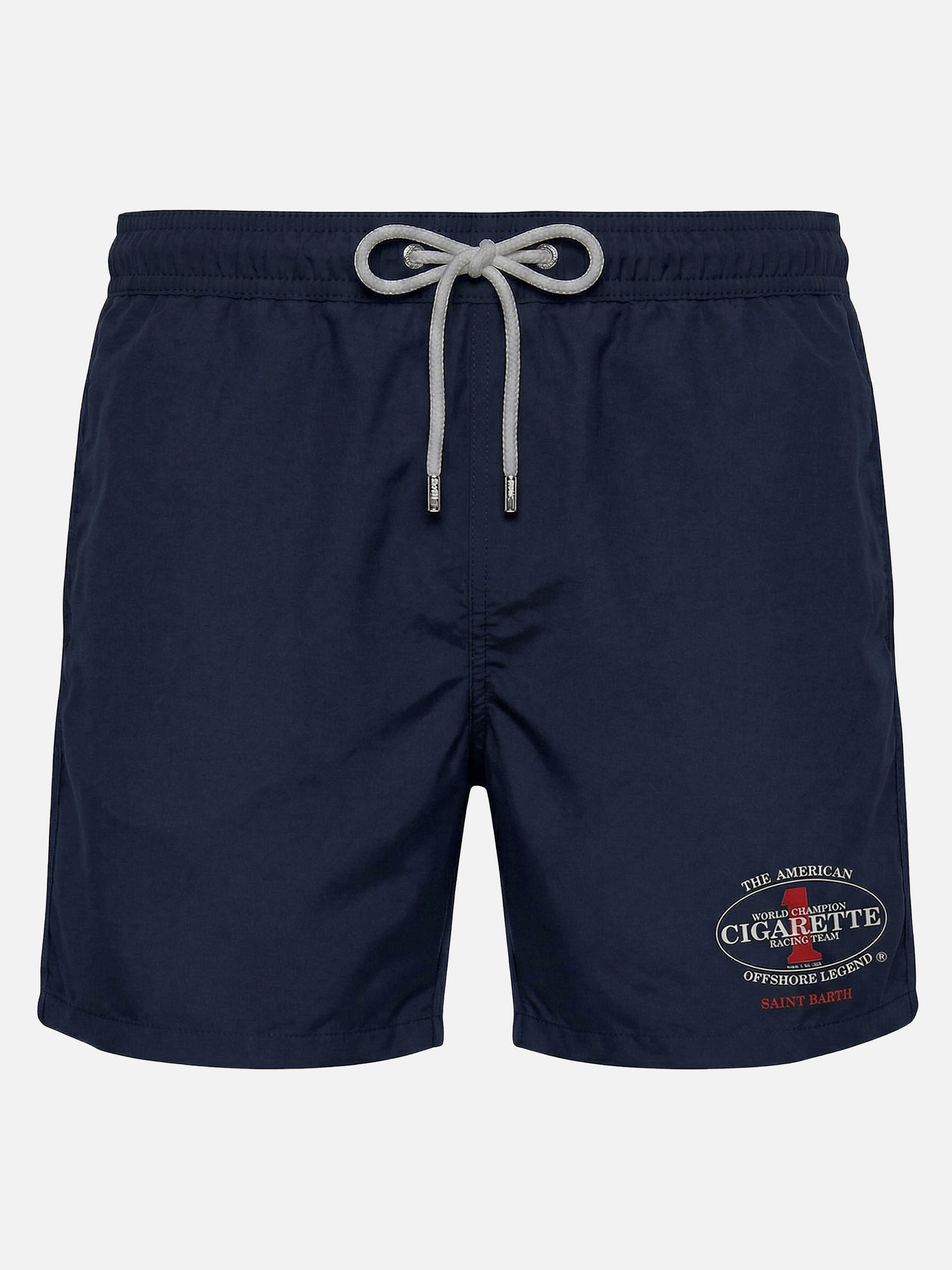 Il costume mare Gustavia è realizzato in Edizione speciale con Cigarette. Il modello è realizzato in tessuto leggero elasticizzato ad asciugatura rapida, pensato per offrire comfort e libertà di movimento. Il blu tinta unita è arricchito dal ricamo Cigarette Racing Team sulla gamba, che caratterizza il design con un dettaglio grafico distintivo. La lunghezza media e la vita elasticizzata con coulisse regolabile assicurano una vestibilità confortevole, mentre la retina interna elasticizzata antibatterica garantisce comfort e traspirabilità.