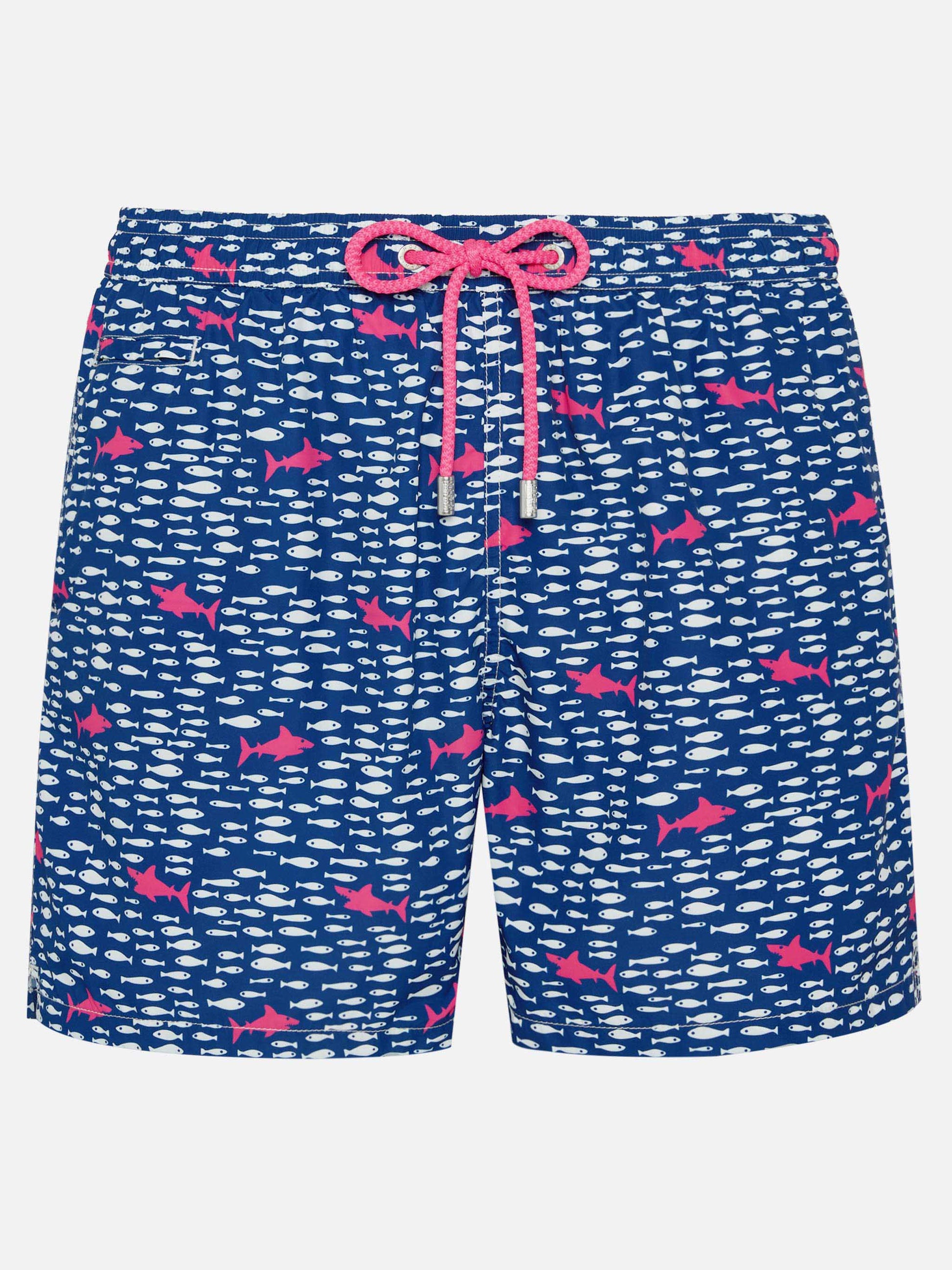 Herren-Badeshorts aus leichtem Stoff mit Fisch- und Hai-Aufdruck