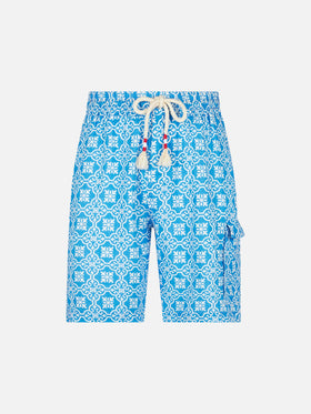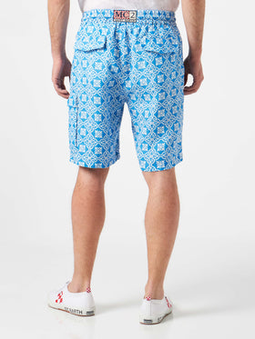 Herren-Bermudashorts aus Leinen mit weißem und hellblauem Majolika-Print