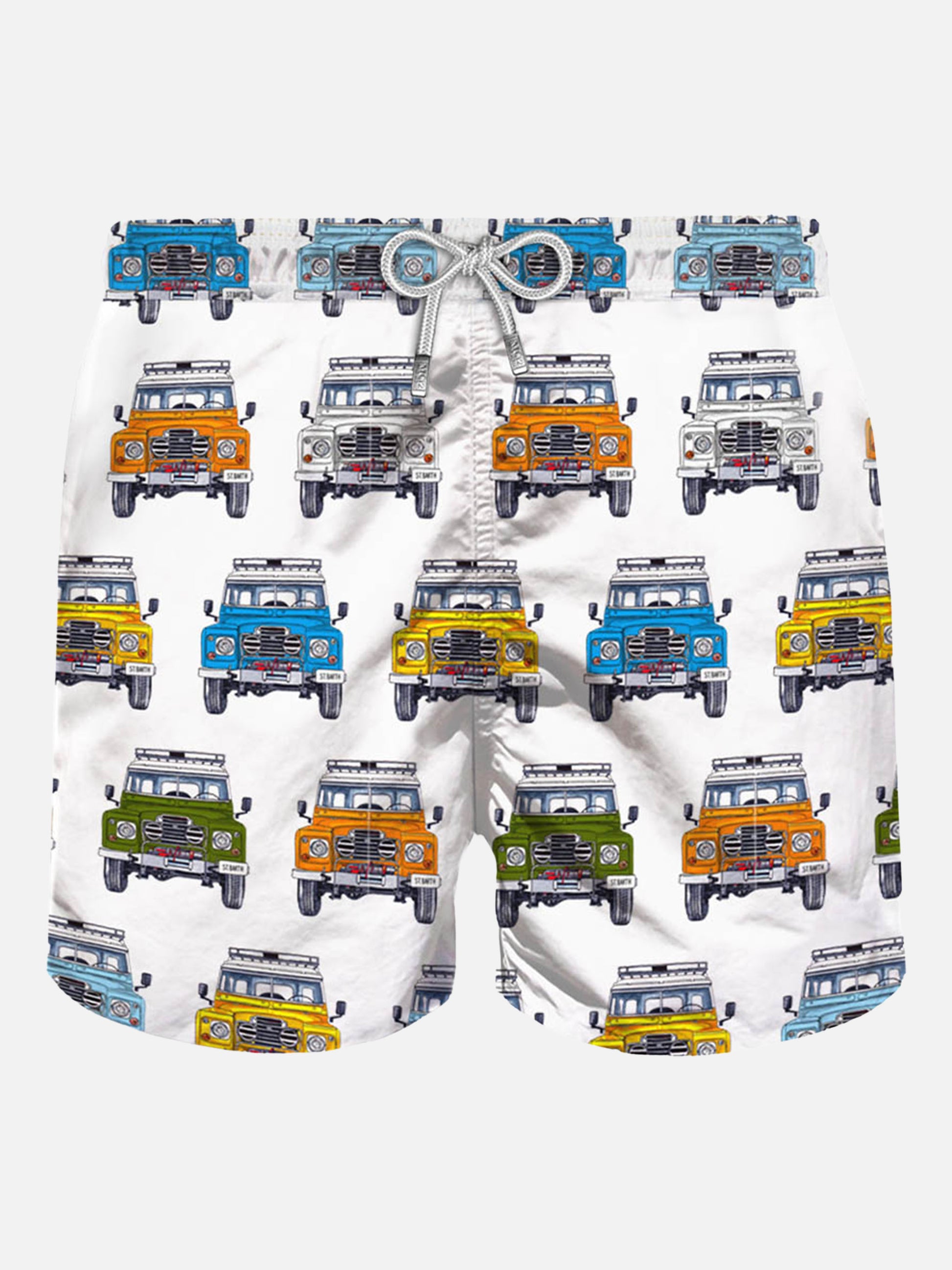 Mittellange Badeshorts mit Aufdruck „Safari Cars“, normale Passform, mit weißer Mikrofaser, bequemer Kordelzug in der Taille, innenliegender ergonomischer Slip, Taschen auf beiden Seiten, klassische Tasche auf der Rückseite mit Klettverschluss.