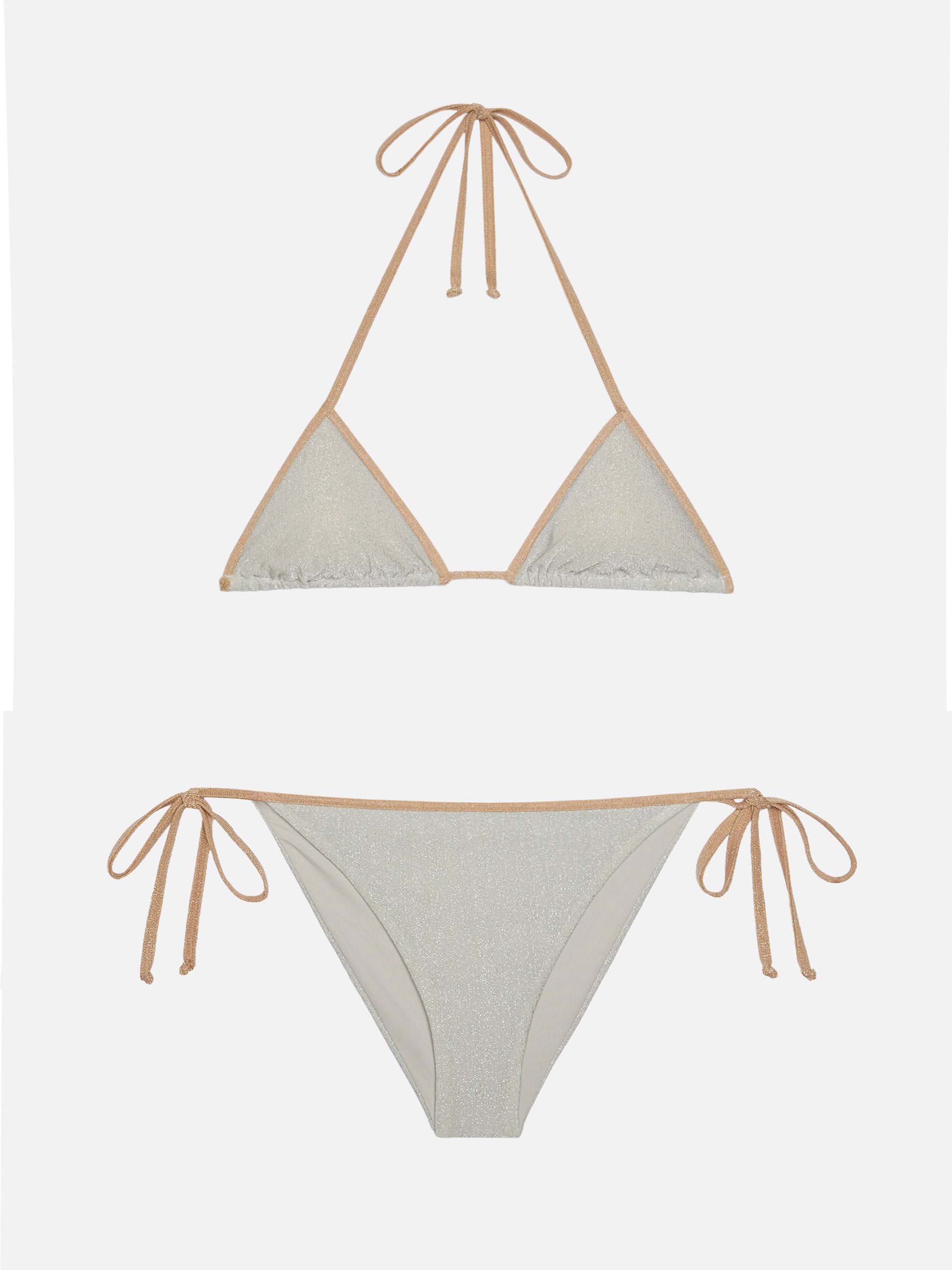 Klassischer Triangel-Bikini von Leah Marielle aus silbernem Lurex mit goldenem Besatz