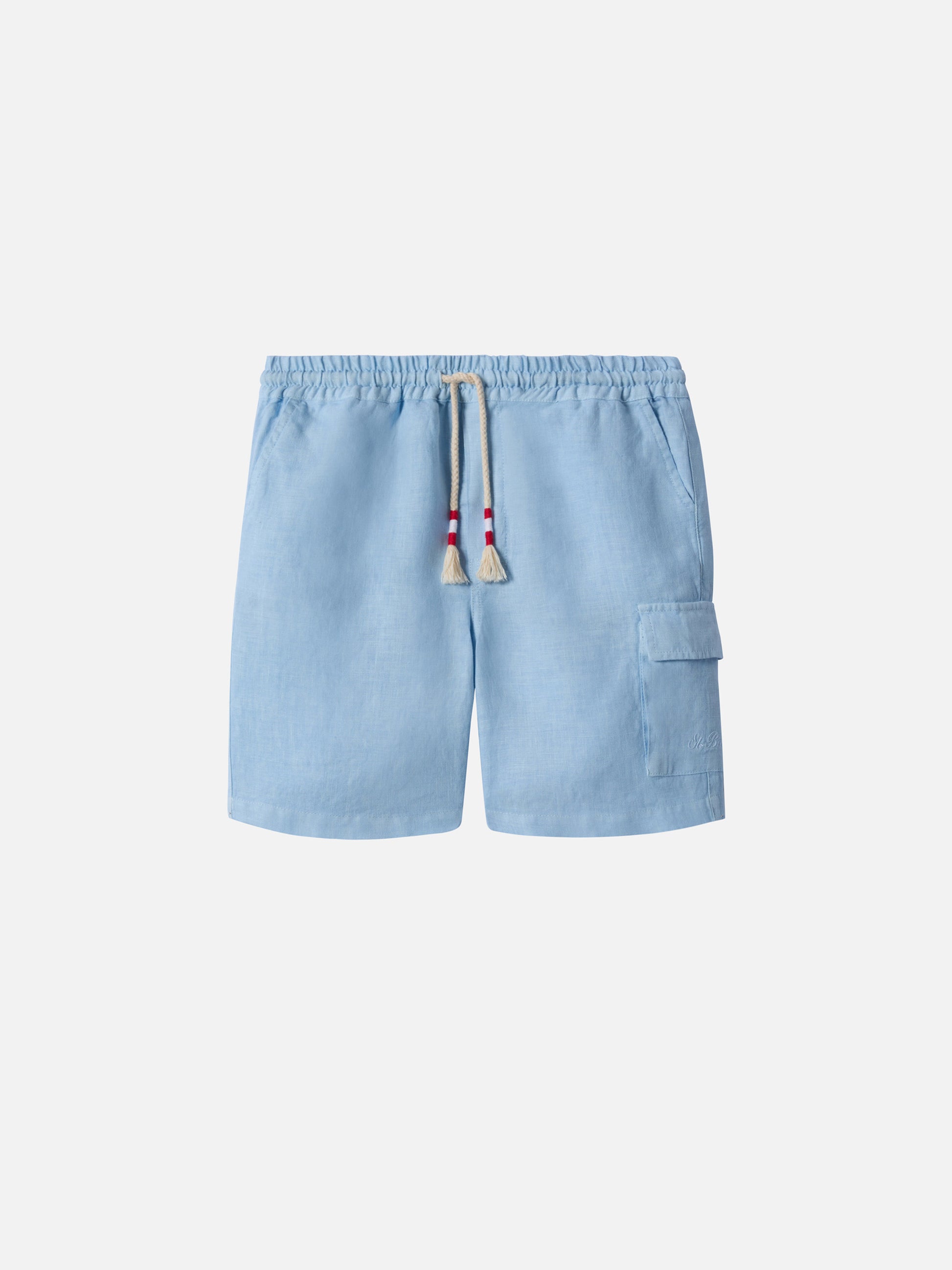 Gli shorts Marseille Jr da bambino sono realizzati in puro lino, un tessuto leggero e traspirante. Il colore azzurro tinta unita definisce uno stile pulito e fresco. Il modello presenta vita elasticizzata con coulisse in corda intrecciata con dettaglio a contrasto, tasche laterali sul davanti e tasche posteriori con aletta e bottone logato. Sul lato è applicata una tasca cargo con ricamo St. Barth tono su tono. Completa il capo l’etichetta logata applicata sul retro della cintura. La costruzione garantisce una vestibilità regolare.