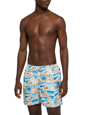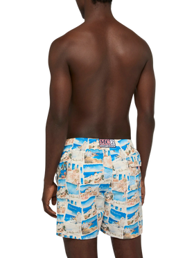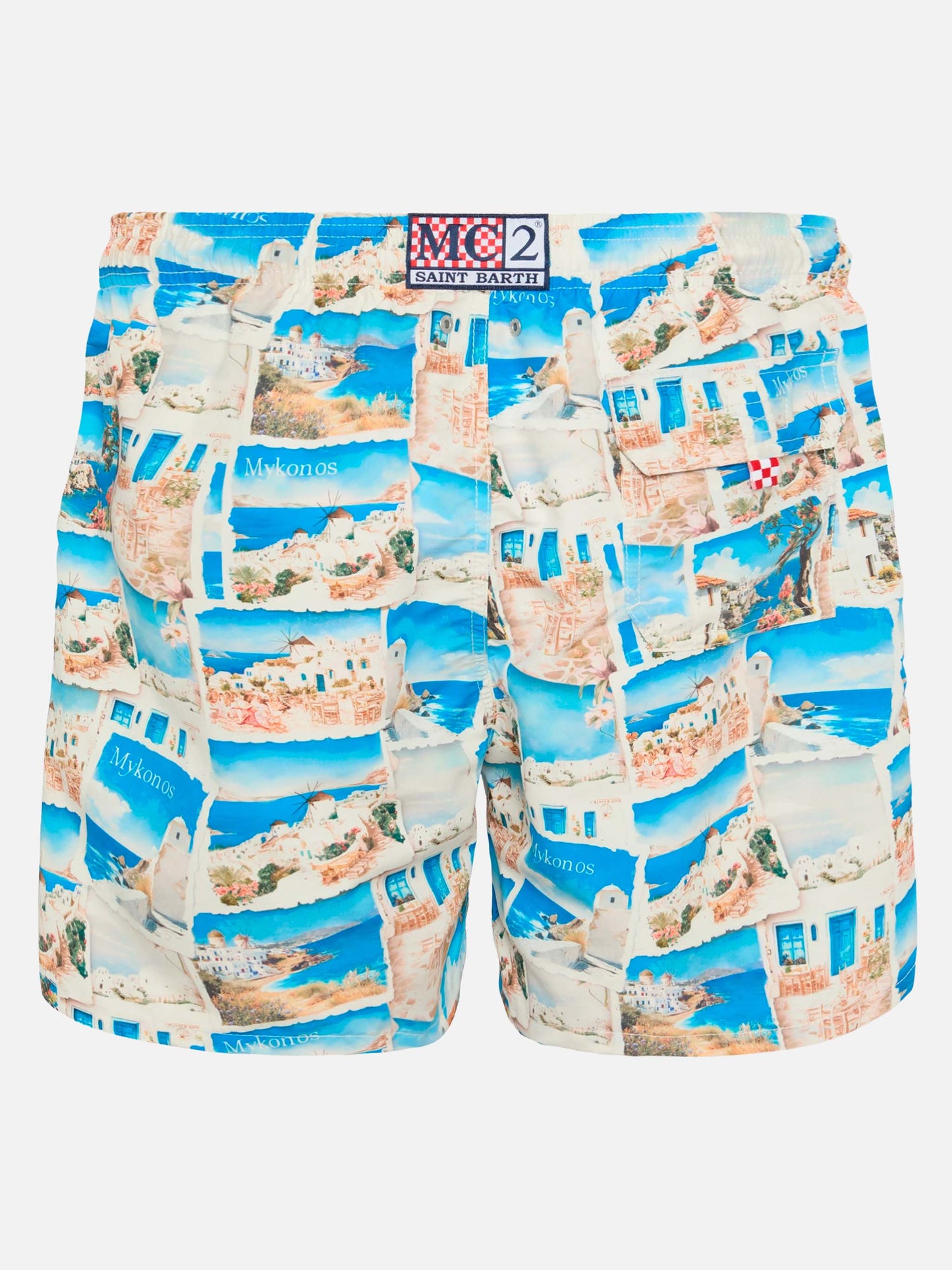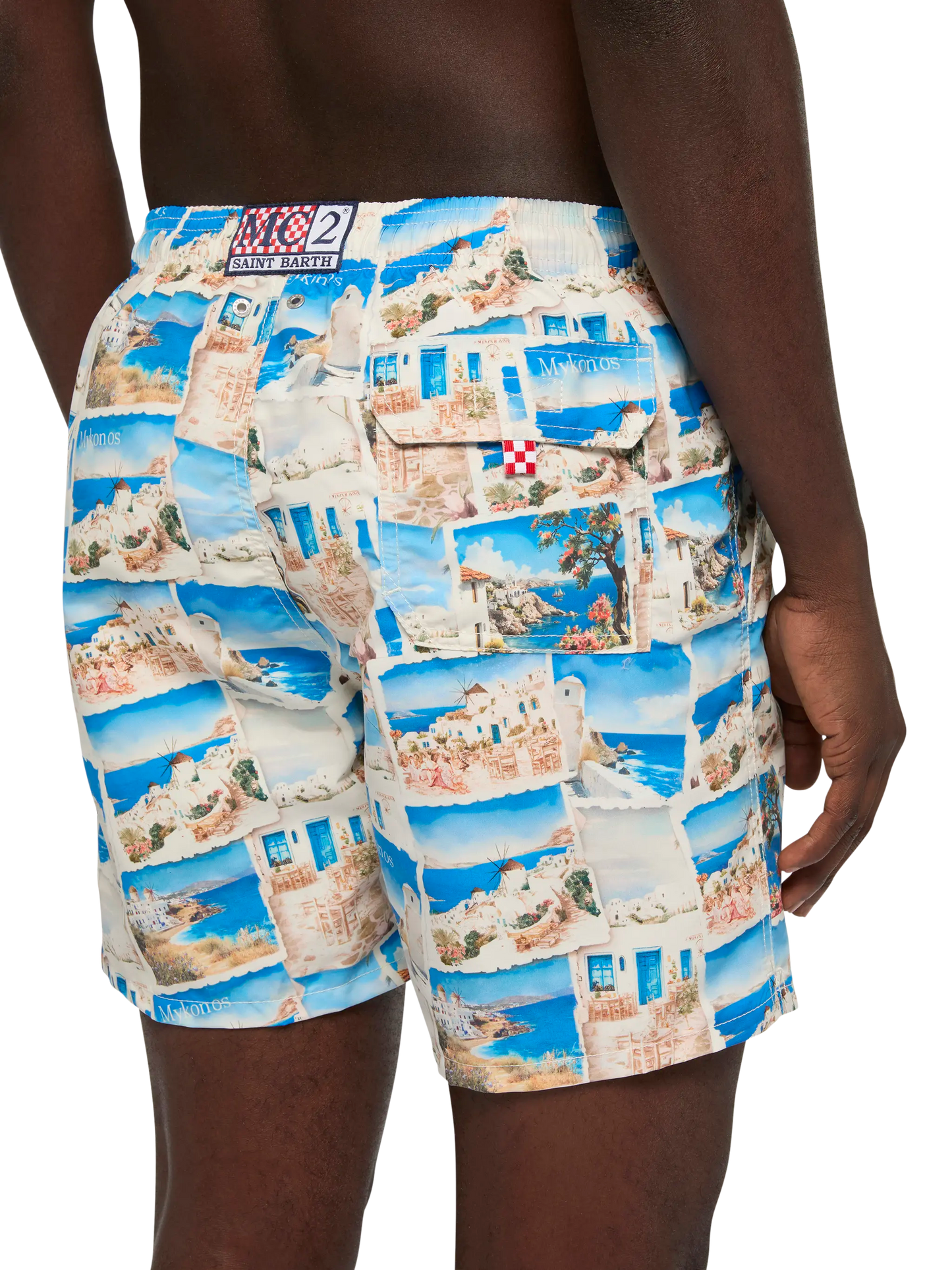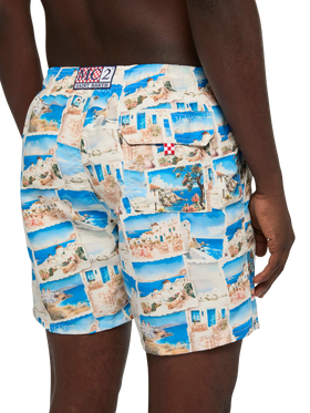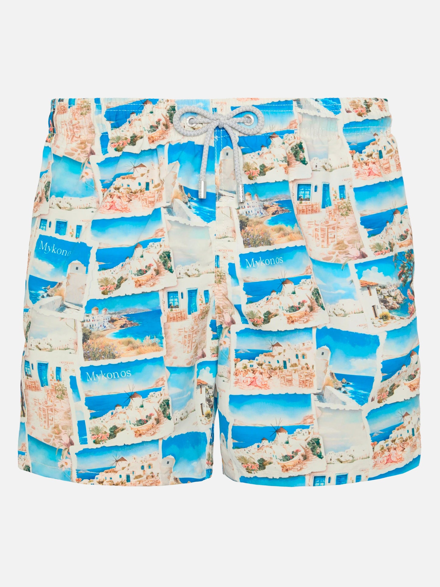 Gustavia Badeshorts in Mittellänge mit Mykonos-Postkartenmotiv | KI-GEMEINSAM ENTWICKELTES DESIGN VON RICKDICK – ENTWICKELT VON RED-EYE