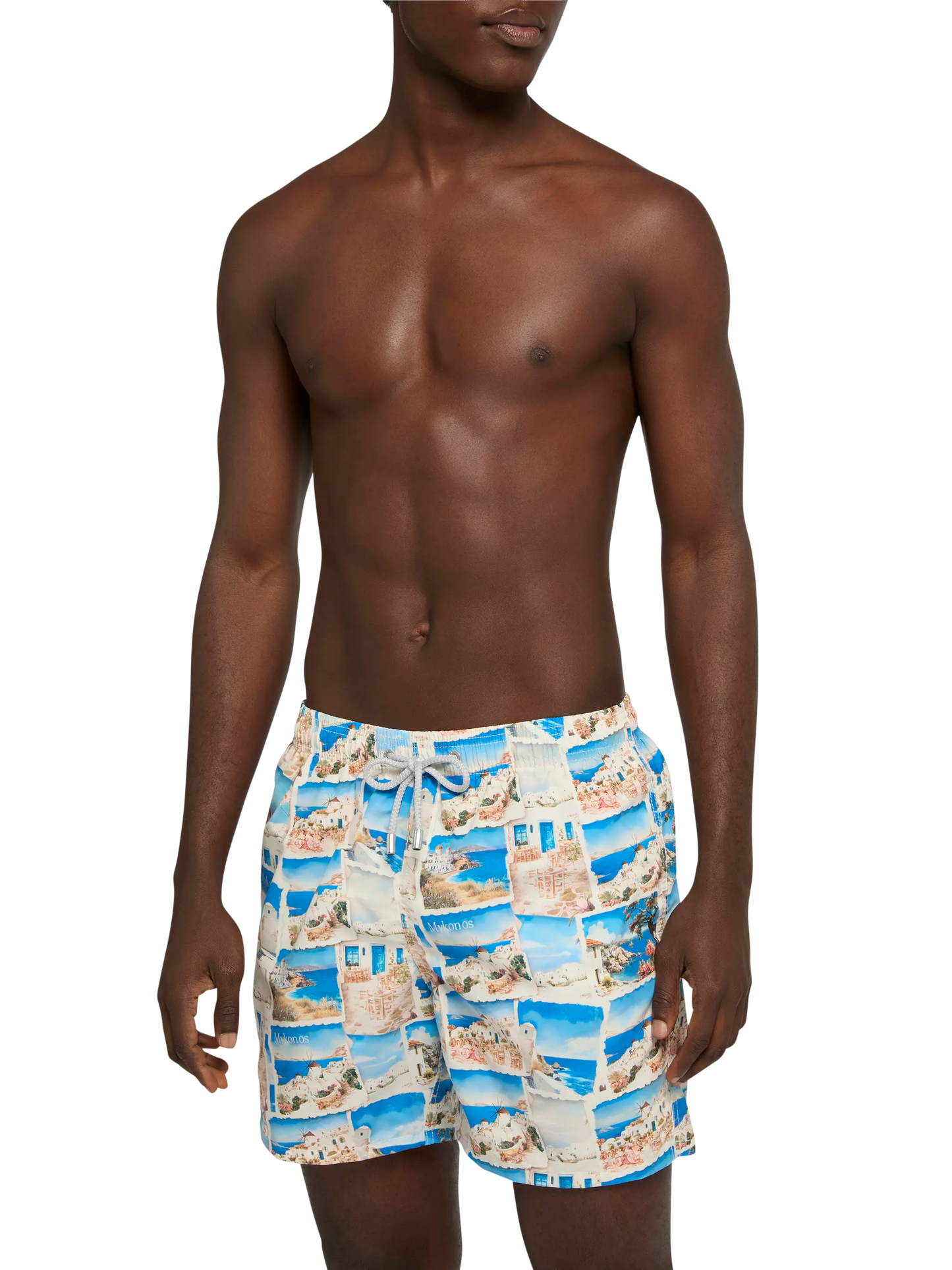 Mittellange Badeshorts für Herren Gustavia Stoff mit Pfirsich-Touch-Effekt Mykonos-Postkarte im Allover-Druck Elastischer Bund für mehr Komfort Verstellbarer Kordelzug mit Markenanschlüssen Inneres Netzfutter Seitentaschen mit französischen Nähten Aufgesetzte Gesäßtasche mit Klettverschluss Markenösen zum Ableiten von Wasser und zur Vermeidung des Balloneffekts Exklusives MC2 Saint Barth-Etikett auf der Rückseite Klassische Passform Zusammensetzung: 100% recyceltes Polyester Größe L hat eine halbe Bundweite von 52 cm (gedehnt) und variiert bei jeder Größe um 2 cm; Seitenlänge inkl. Bund 41,5 cm Bitte beachten Sie, dass alle angegebenen Maße ungefähre Angaben sind und aufgrund manueller Messung eine Toleranz von 1-2 cm aufweisen. Dieser Toleranzbereich ist normal und zu erwarten. Das Model ist 185 cm groß und trägt Größe L Pflegehinweise: Kaltwäsche unter fließendem Wasser und neutraler Seife. Zum Trocknen aufhängen. Nicht einweichen lassen und nicht in Kontakt mit anderer Kleidung trocknen. Das Kleidungsstück nicht in Kontakt mit anderer Kleidung im nassen Zustand liegen lassen.