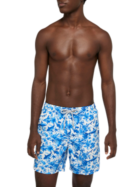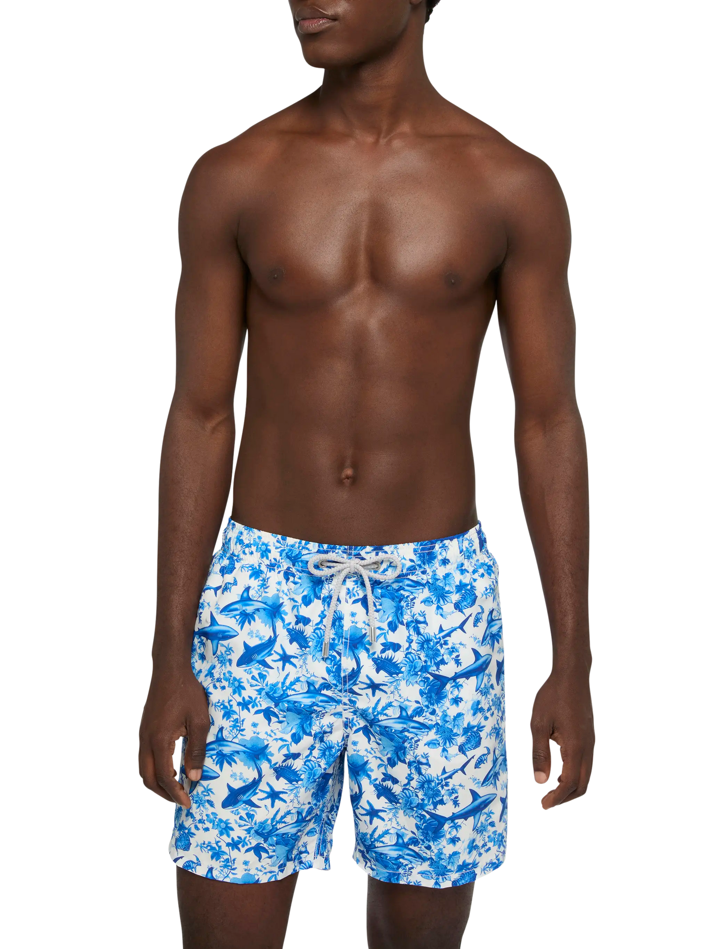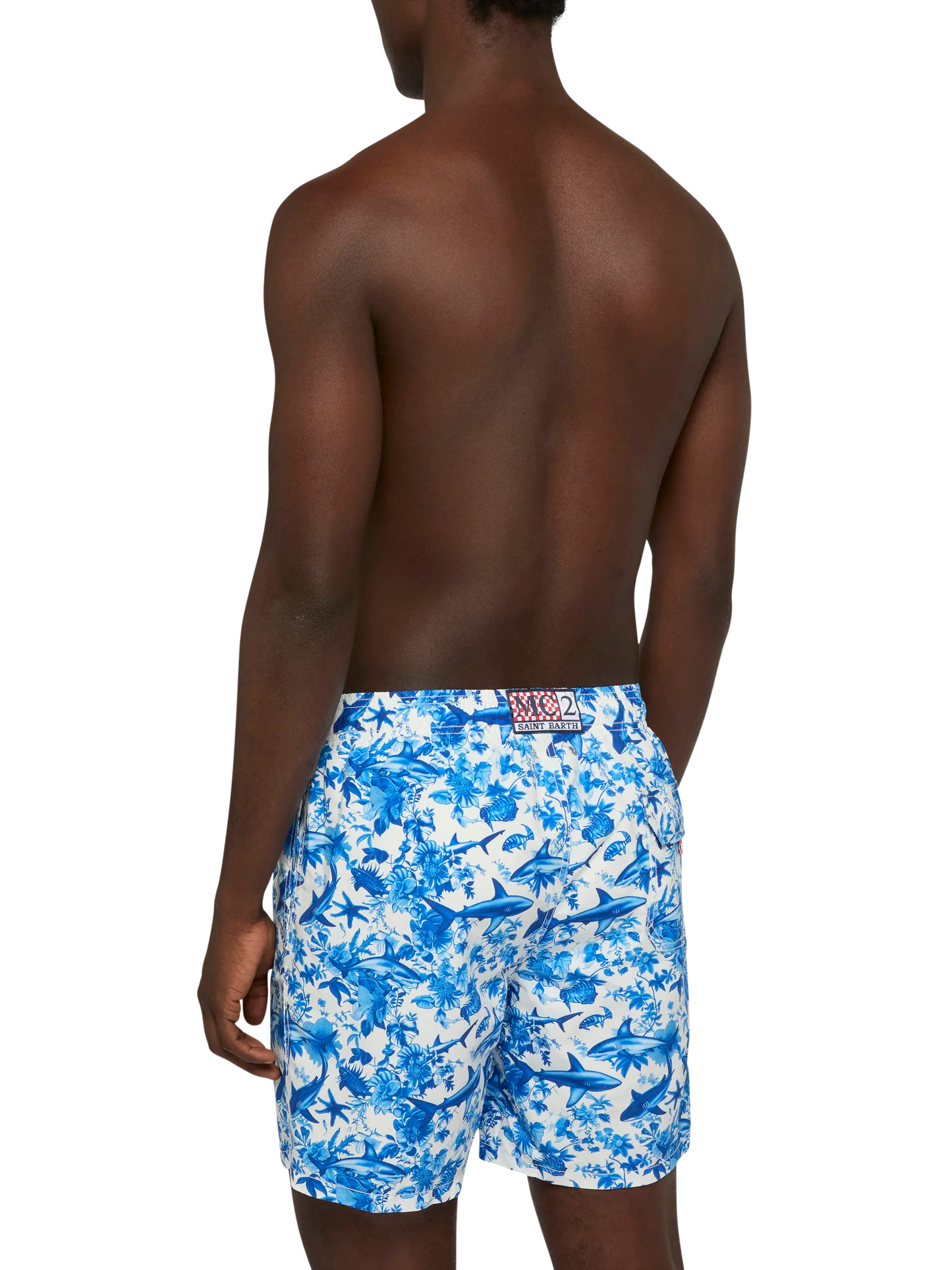Mittellange Badeshorts für Herren Gustavia Stoff mit Pfirsich-Touch-Effekt Hai-Allover-Print Weißer Hintergrund Elastischer Bund für mehr Komfort Verstellbarer Kordelzug mit Markenanschlüssen Inneres Netzfutter Seitentaschen mit französischen Nähten Aufgesetzte Gesäßtasche mit Klettverschluss Markenösen zum Ableiten von Wasser und zur Vermeidung des Balloneffekts Exklusives MC2 Saint Barth-Etikett auf der Rückseite Klassische Passform Zusammensetzung: 100% recyceltes Polyester Größe L hat eine halbe Bundweite von 52 cm (gedehnt) und variiert bei jeder Größe um 2 cm; Seitenlänge inkl. Bund 41,5 cm Bitte beachten Sie, dass alle angegebenen Maße ungefähre Angaben sind und aufgrund manueller Messung eine Toleranz von 1-2 cm aufweisen. Dieser Toleranzbereich ist normal und zu erwarten. Das Model ist 185 cm groß und trägt Größe L Pflegehinweise: Kaltwäsche unter fließendem Wasser und neutraler Seife. Zum Trocknen aufhängen. Nicht einweichen lassen und nicht in Kontakt mit anderer Kleidung trocknen. Das Kleidungsstück nicht in Kontakt mit anderer Kleidung im nassen Zustand liegen lassen.