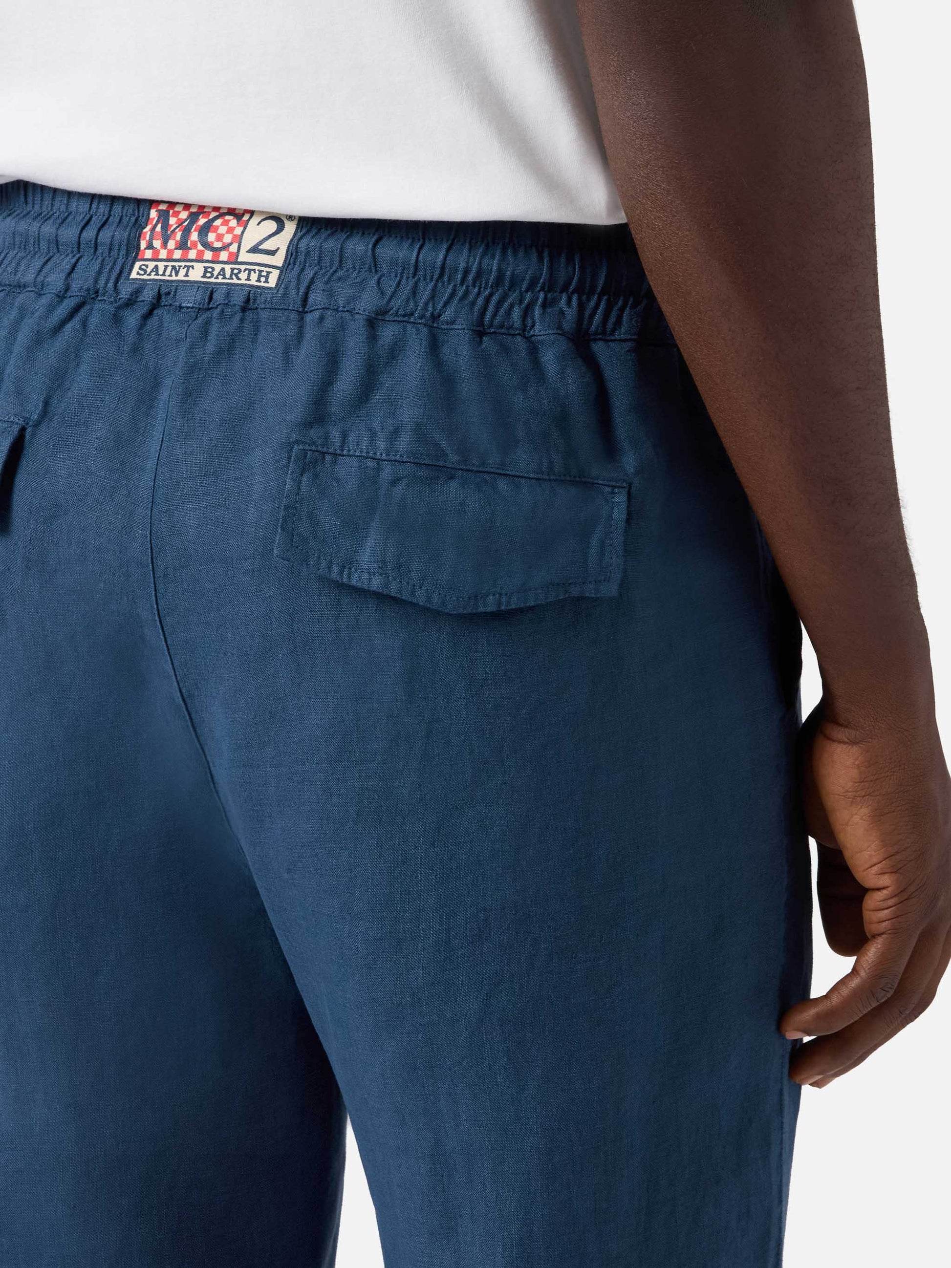 https://it.mc2saintbarth.com/de/products/navy-blue-brown-calais-long-pants-in-pure-linen10781194518874Pantalone Calais lungo blu navy in puro lino189,00https:files/UID_CAA000109931L-MAN-PANT-BLUE-MC2-MC2_2.jpghttps:files/UID_CAA000109931L-MAN-PANT-BLUE-MC2-MC2_2.jpgEURInStockPANT650948215130Alle Produkte – nur von Man649134276954AVADA - Bestseller278947365048Bermudashorts und Hosen für Herren293962940600Herren-Leinenkollektion654690877786Upselling_Man_PantsIl pantalone lungo Calais è realizzato in puro lino, un tessuto leggero e traspirante pensato per offrire comfort e naturalezza. Il design tinta unita valorizza l’estetica essenziale del modello. La cintura elasticizzata con coulisse in corda intrecciata con legatura bianco-rossa consente di regolare facilmente la vestibilità. Il modello è completato da tasche oblique sul davanti, tasche posteriori con aletta e bottoni logati ed etichetta logata applicata al centro sul retro della cintura. La gamba dritta e la vestibilità relaxed assicurano comfort e libertà di movimento.