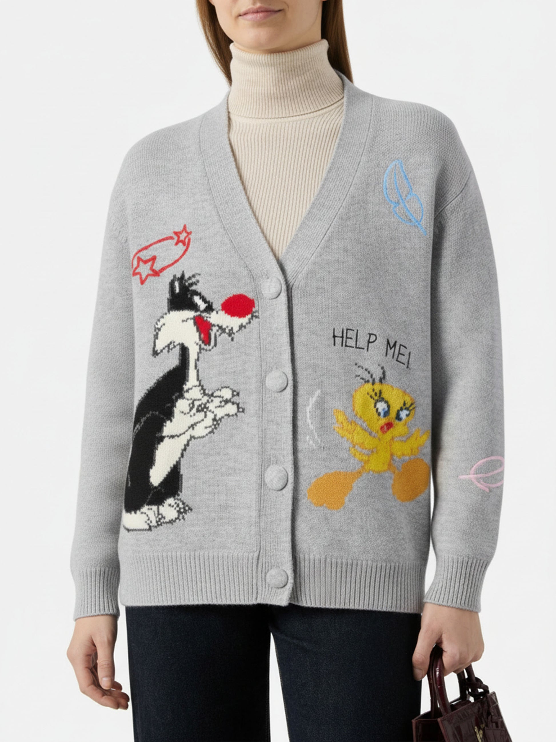Sasi Strickjacke aus Donegal-Wollmischung mit Titti e Silvestro Jacquardmuster | WARNER BROS. SPECIAL EDITION