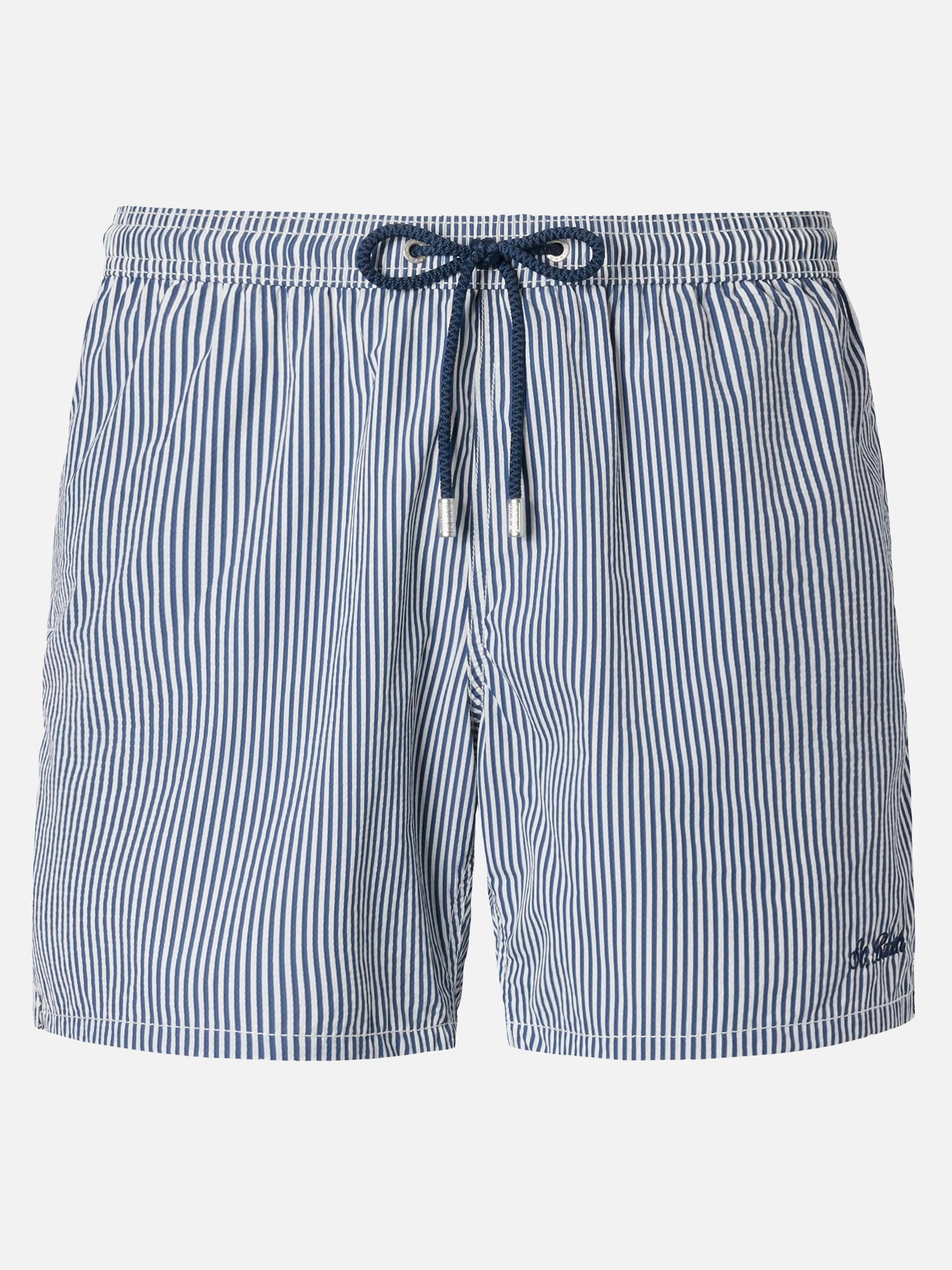 Marineblaue, gestreifte, klassische leichte Badeshorts aus Seersucker von Patmos