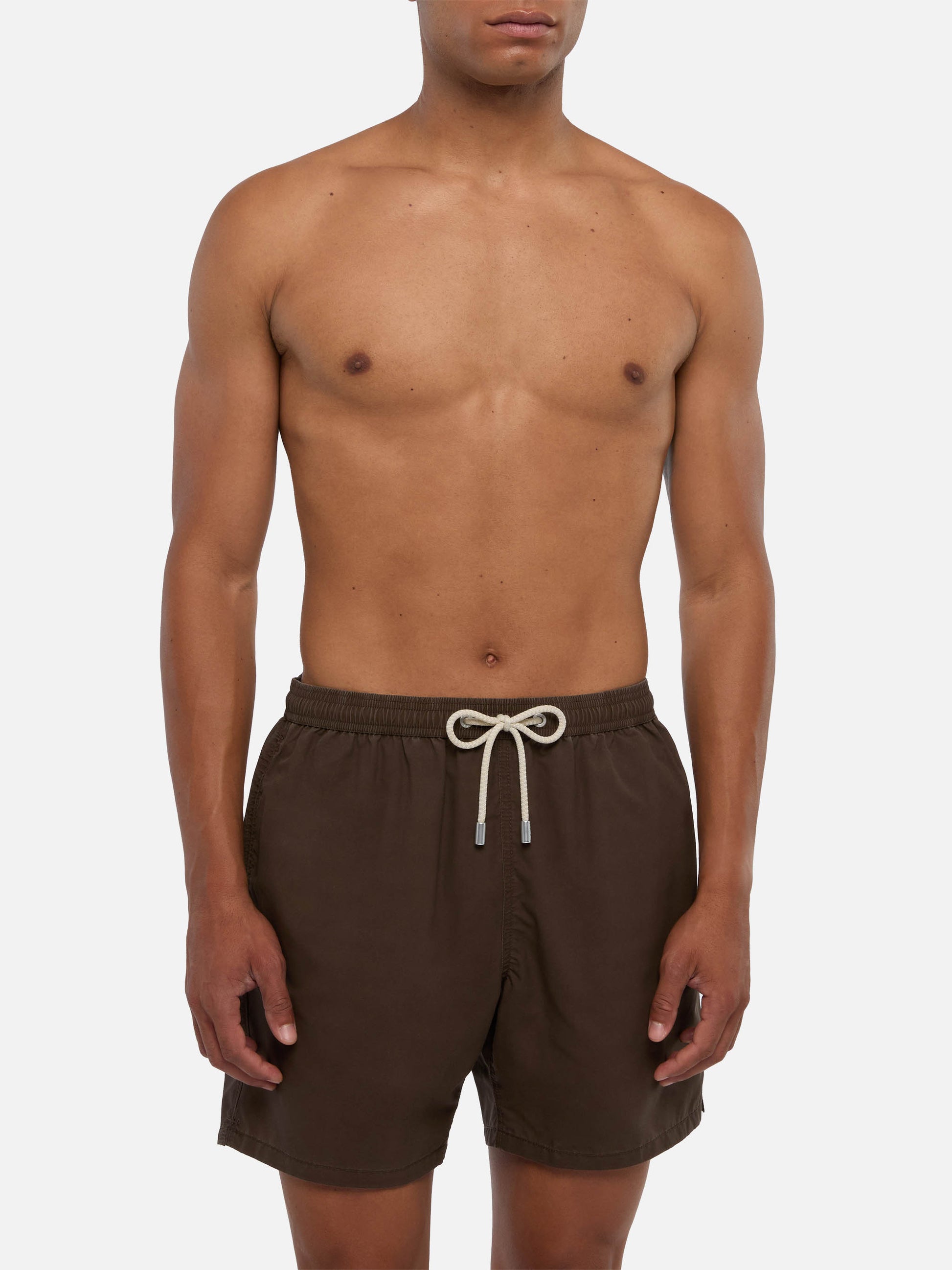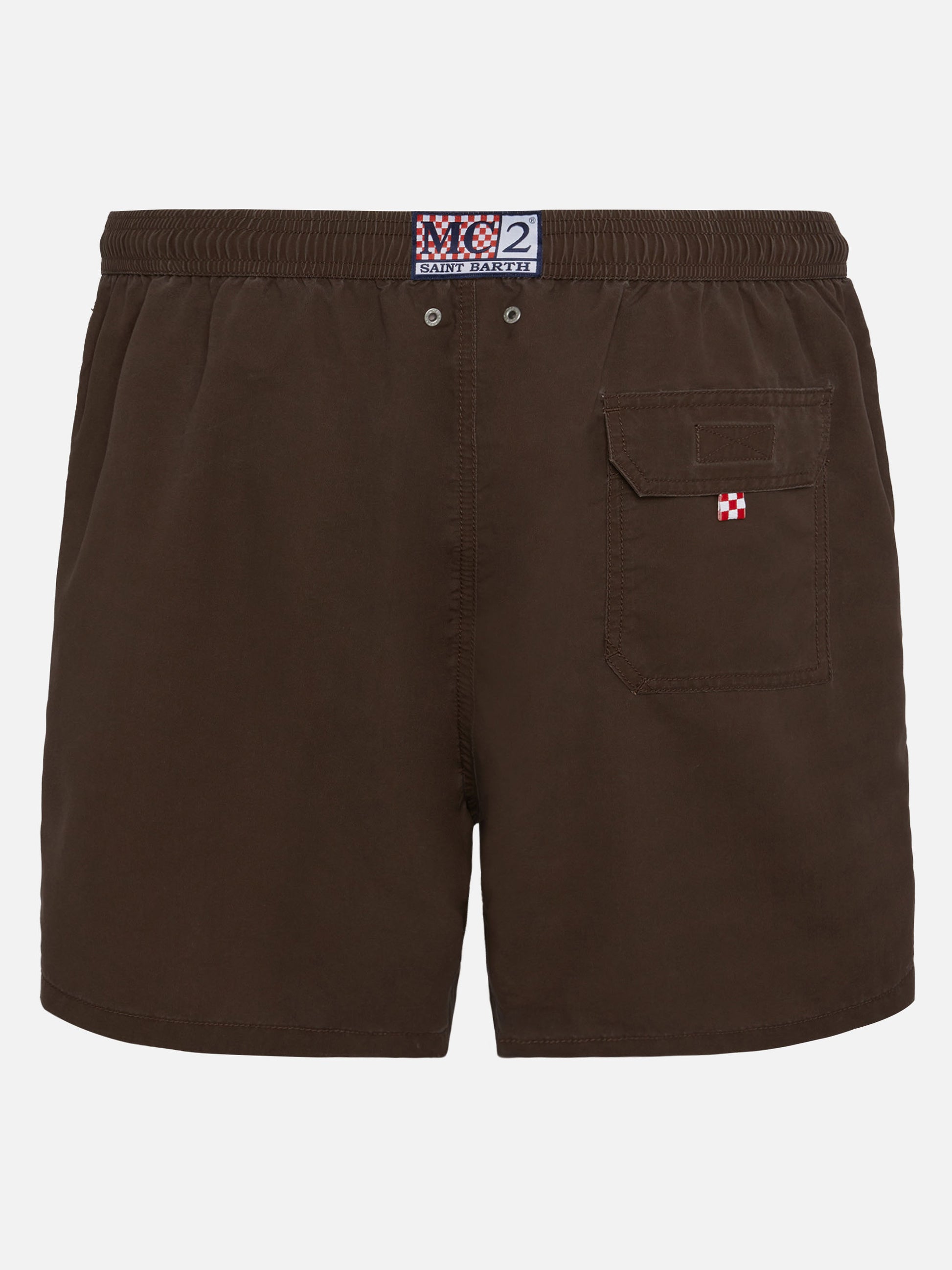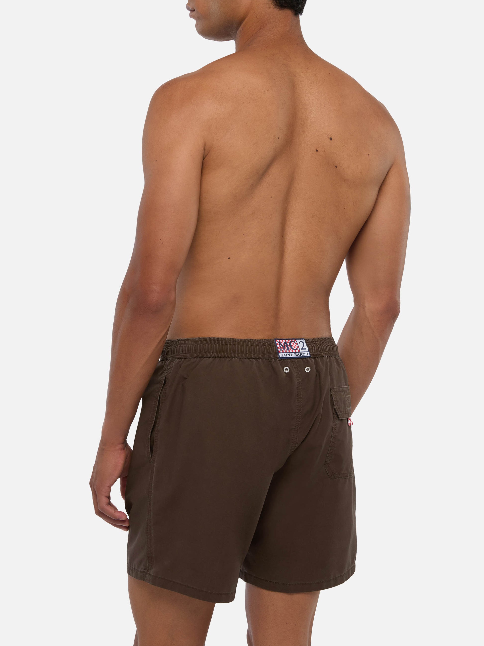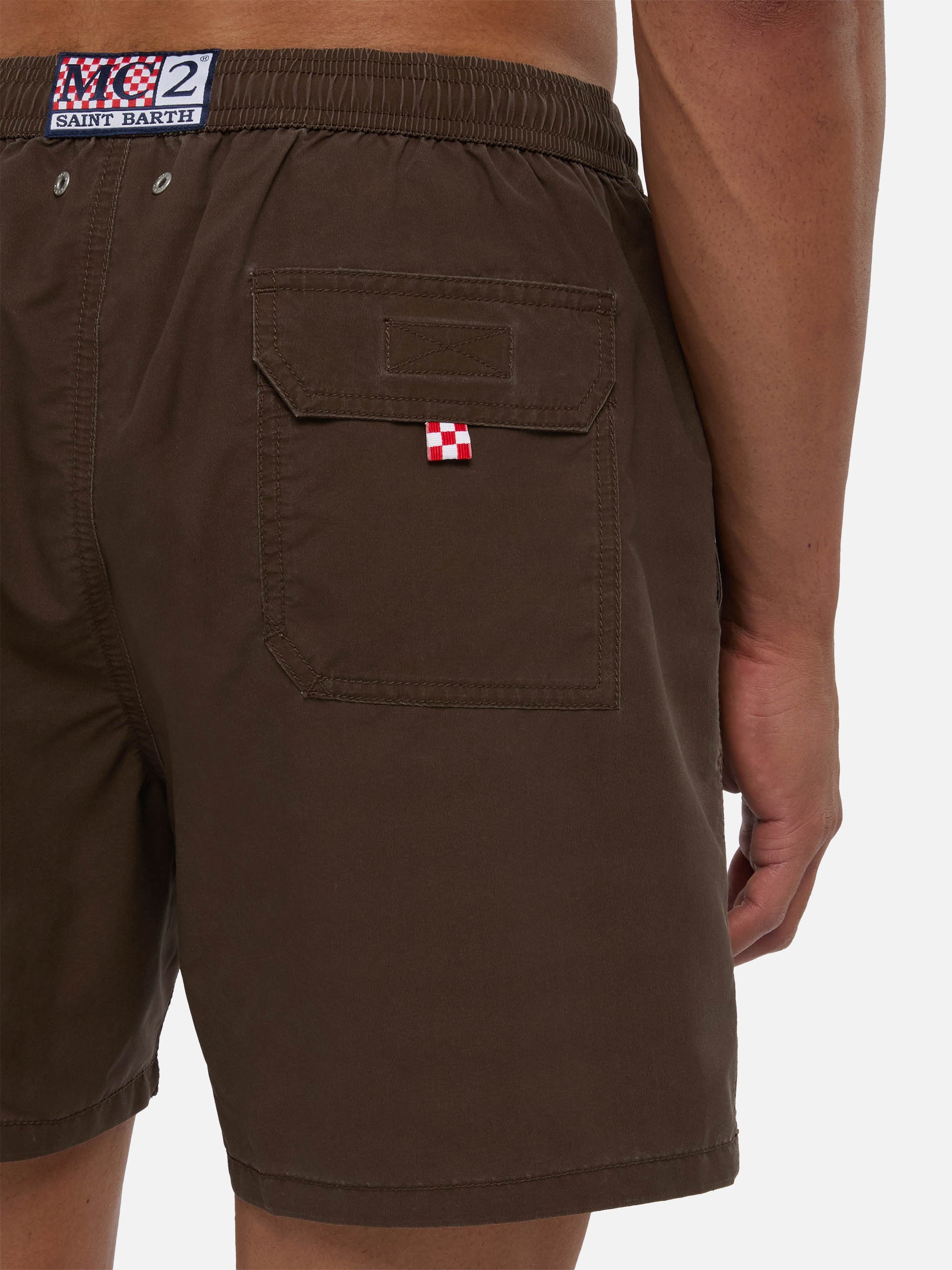 Wir präsentieren unsere Patmos-Badeshorts aus strukturiertem Polyestergewebe mit baumwollähnlichem Griff. Veredelt mit Kontrastnähten und Kordelzug sowie dem aufgestickten exklusiven Saint Barth-Logodetail am unteren Bein. Verfügt über eine Gesäßtasche mit Klappe und Klettverschluss. Diese Version ist aus schnelltrocknendem Stoff gefertigt. Die Schönheit dieses Kleidungsstücks liegt in der einzigartigen Stoffverarbeitungstechnik, die mit einer ersten Stoffbeschichtung beginnt, gefolgt von einer sanften Waschbehandlung nach der Herstellung des Kleidungsstücks. Dieser Prozess erzeugt einen einzigartigen Vintage-Effekt, insbesondere bei den Nähten. Jede Unvollkommenheit wird als Merkmal betrachtet, was jedes Stück wirklich einzigartig macht. Mittellange Badeshorts Man Patmos Vintage braune Farbe Strukturierte Baumwollhaptik Exklusives Saint Barth-Logodetail am unteren Beinabschluss Bequemer Gummibund Verstellbarer Kordelzug mit Markenanschlüssen Antibakterielles Netz-Innenfutter Seitentaschen mit französischen Nähten Aufgesetzte Gesäßtasche mit Klettverschluss Markenösen zum Ableiten von Wasser und zur Vermeidung eines Balloneffekts Exklusives MC2 Saint Barth-Etikett auf der Rückseite Klassische Passform Zusammensetzung: 100% Polyester Größe L hat eine halbe Bundweite von 52,5 cm (gedehnt) und variiert bei jeder Größe um 2 cm