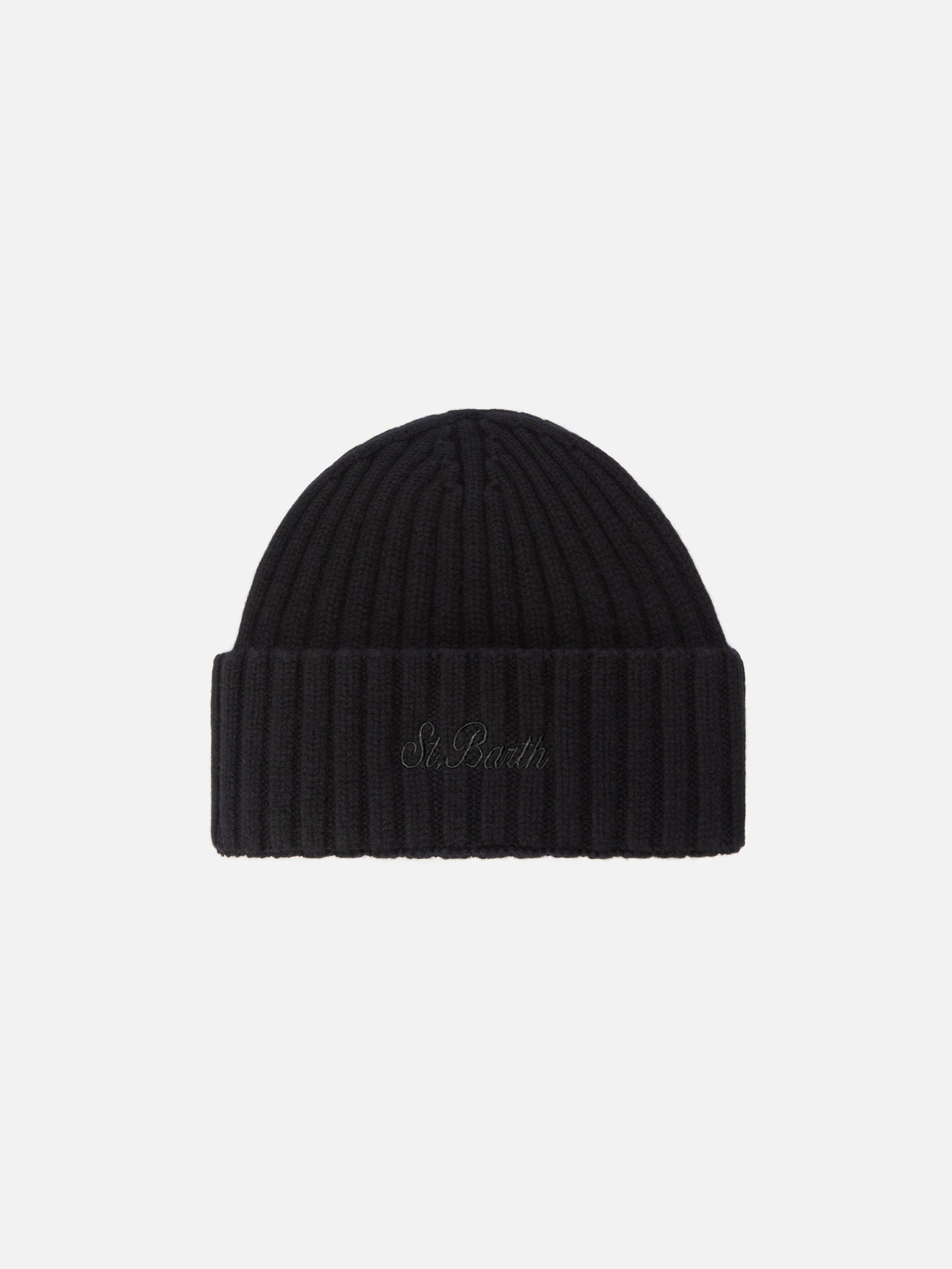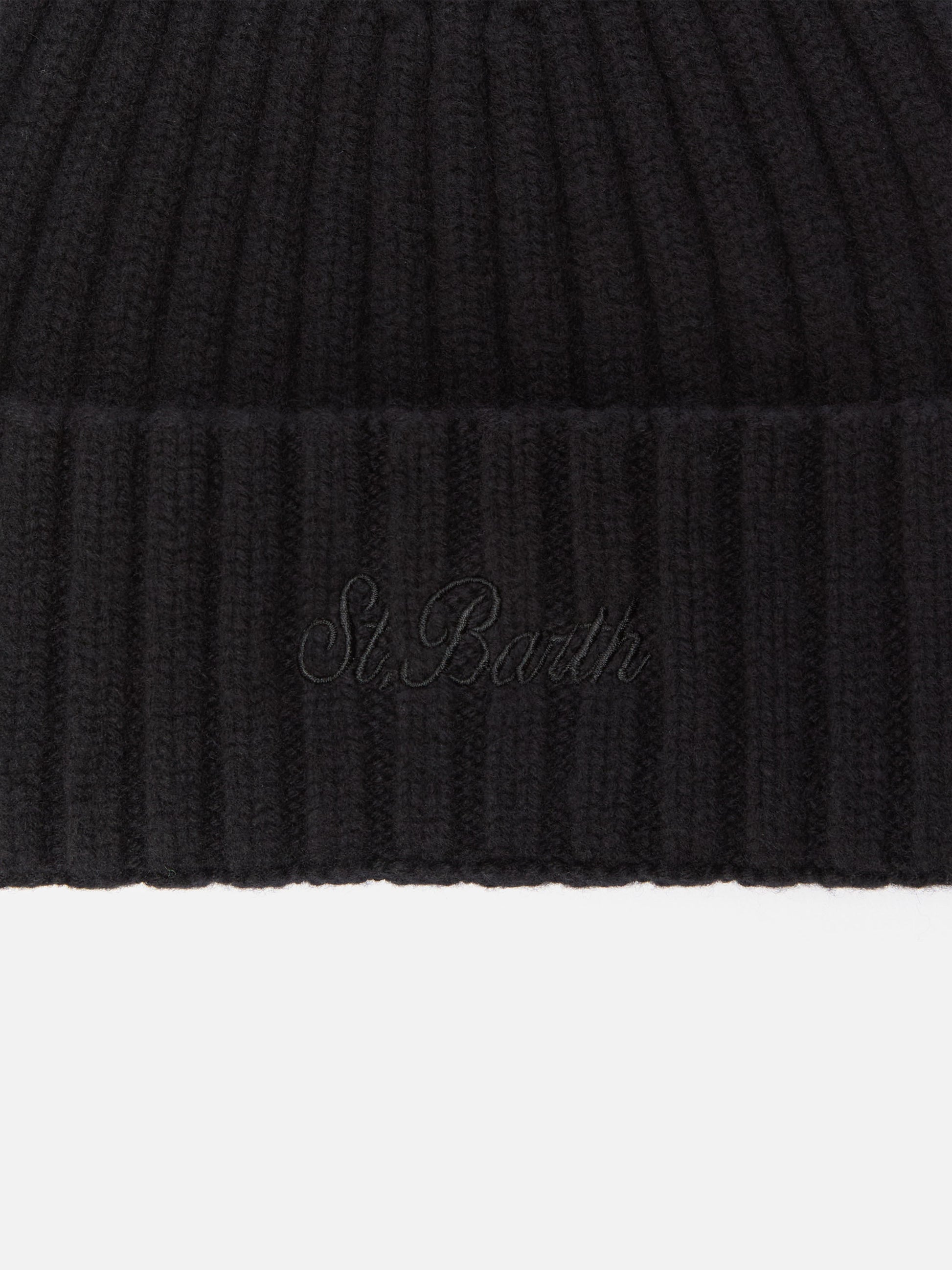 Wengen-Mütze aus schwarzer Wolle mit St.-Barth-Stickerei am Umschlag