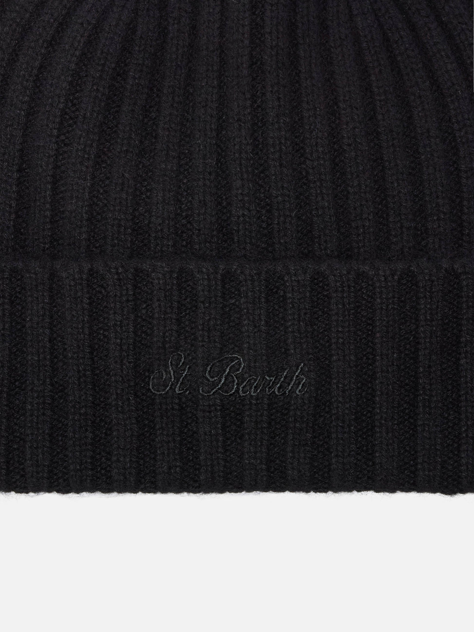 Wengen-Mütze aus schwarzem Kaschmir mit St.-Barth-Stickerei am Umschlag