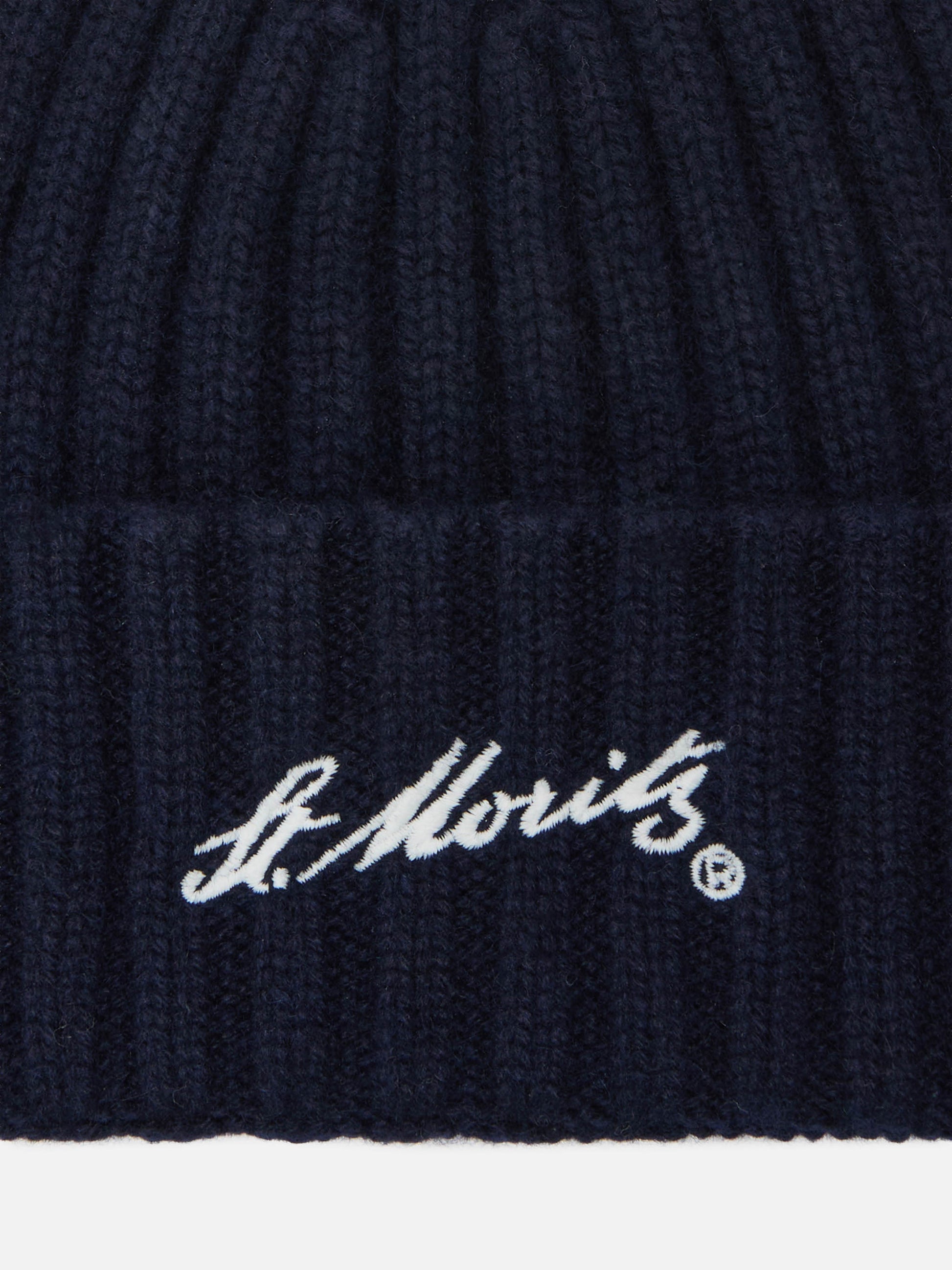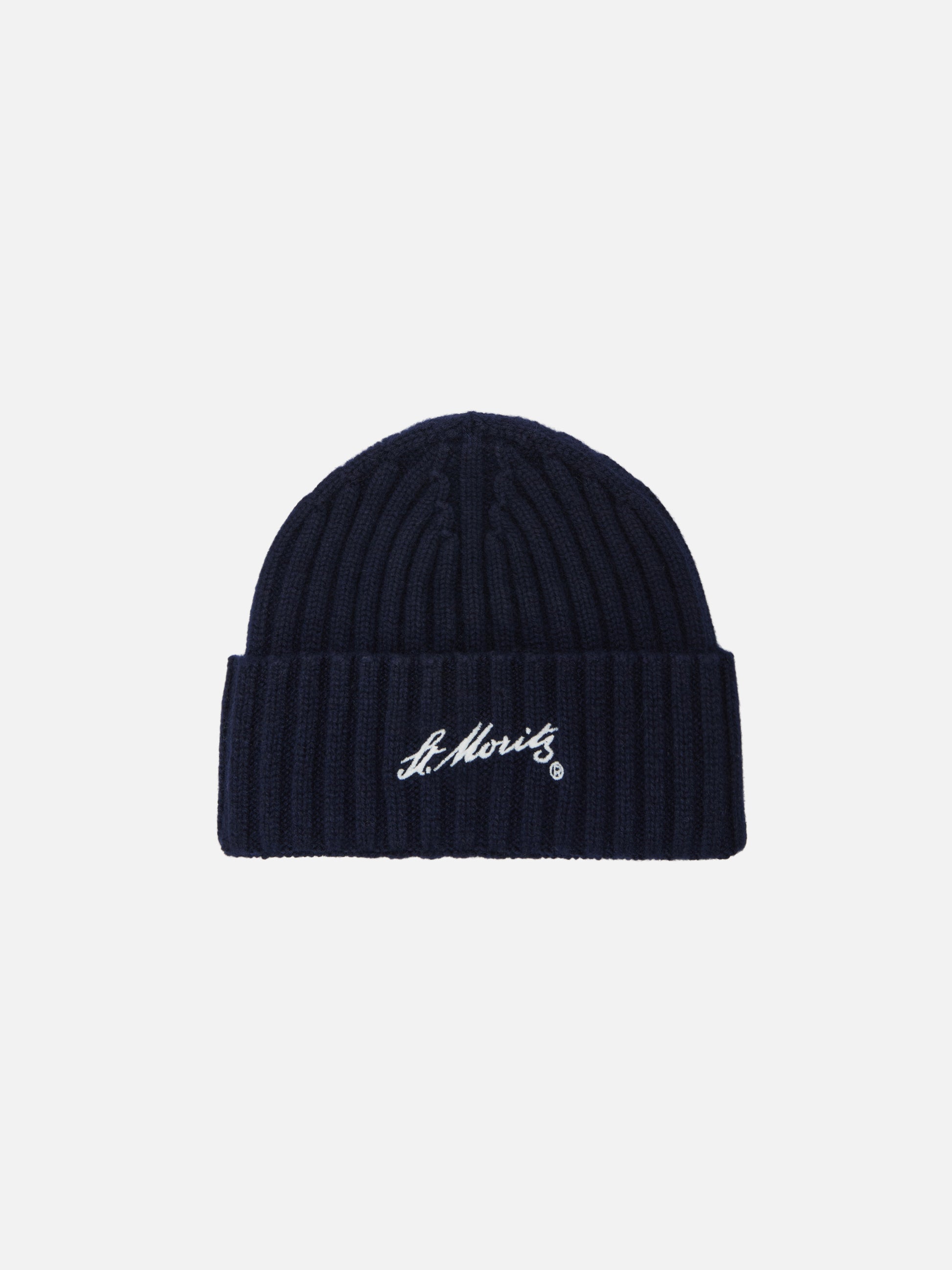 Wengen-Mütze aus blauem Kaschmir mit St. Moritz-Stickerei