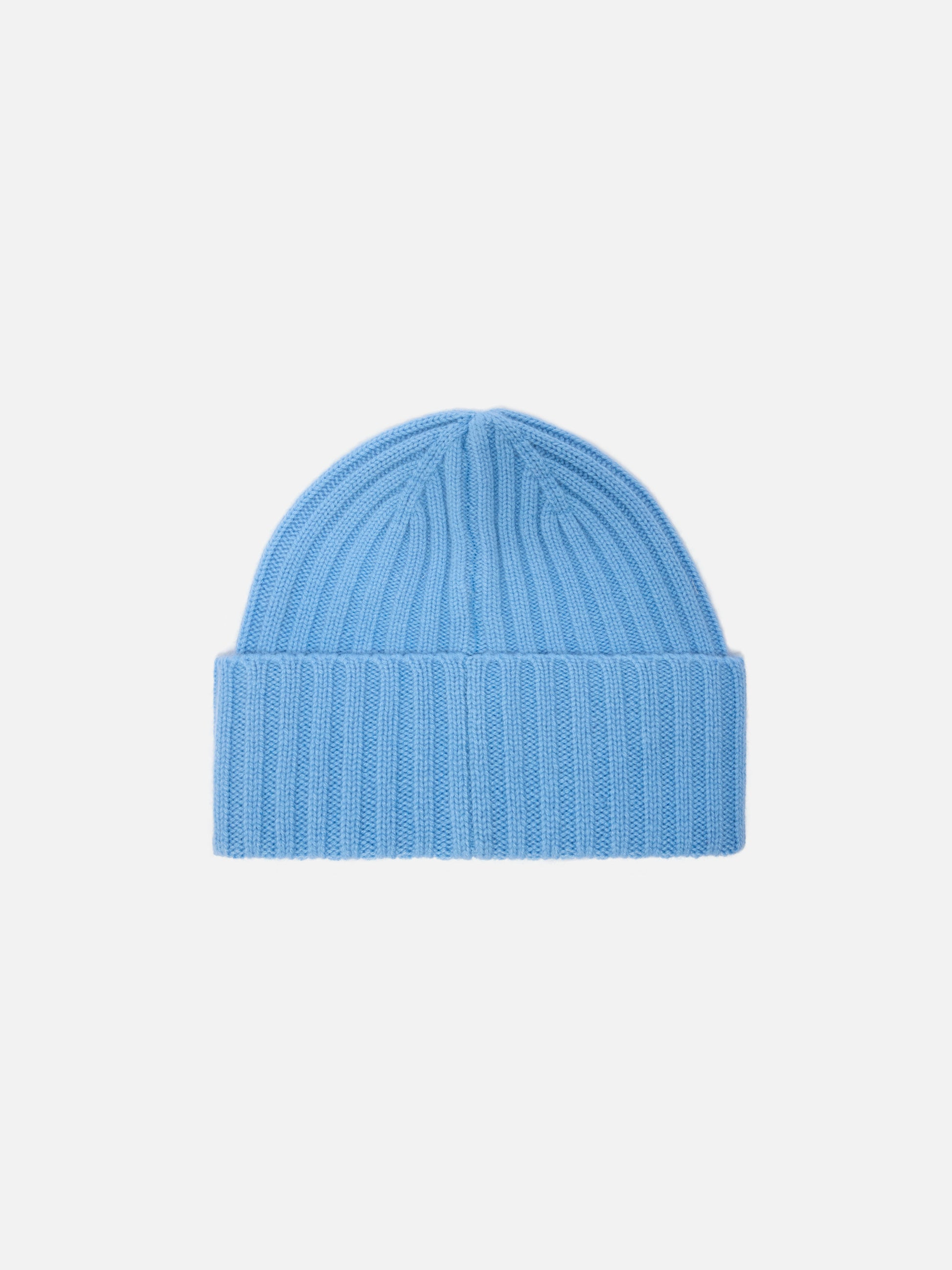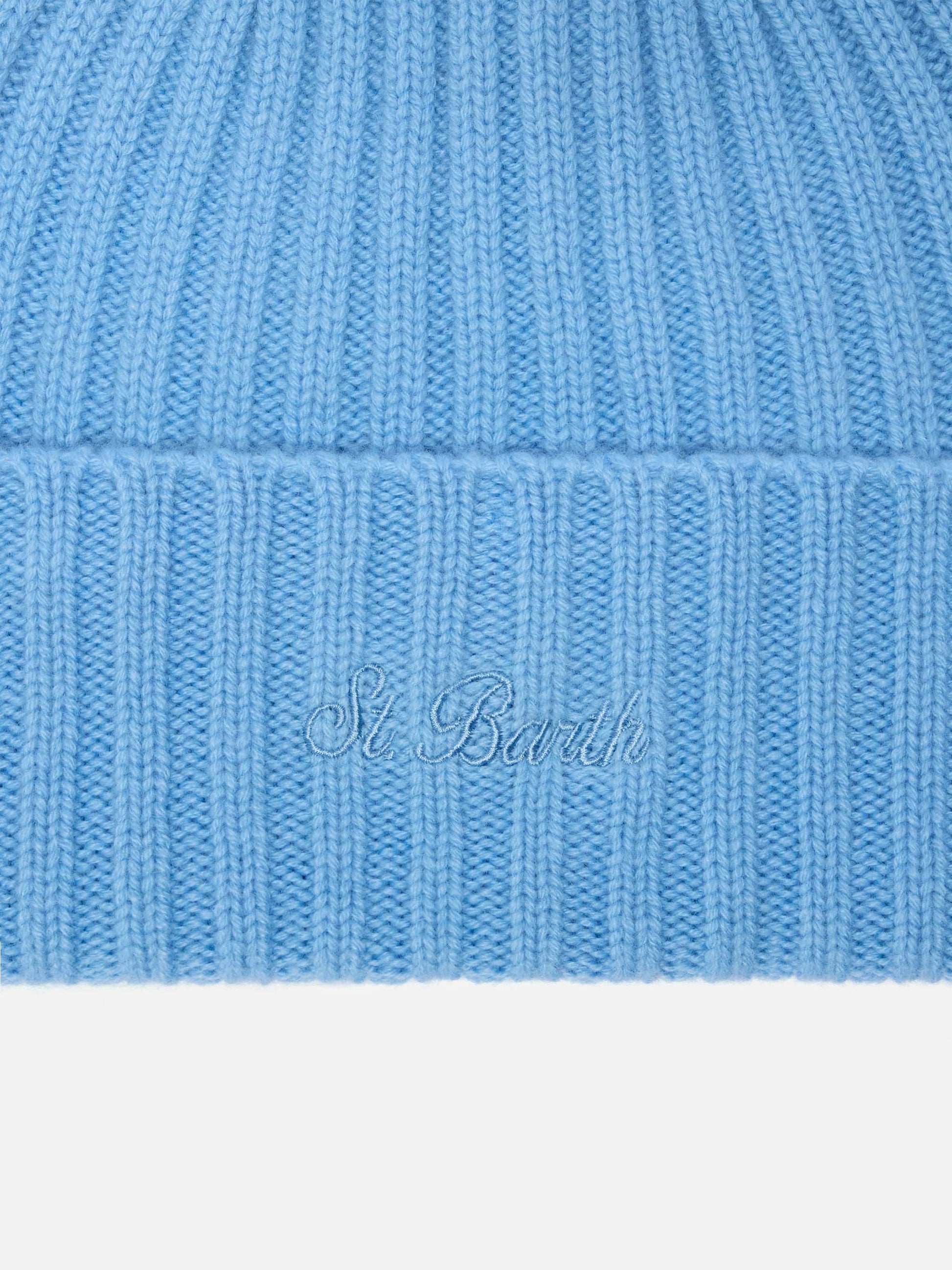 Wengen-Mütze aus hellblauem Kaschmir mit St.-Barth-Stickerei am Umschlag