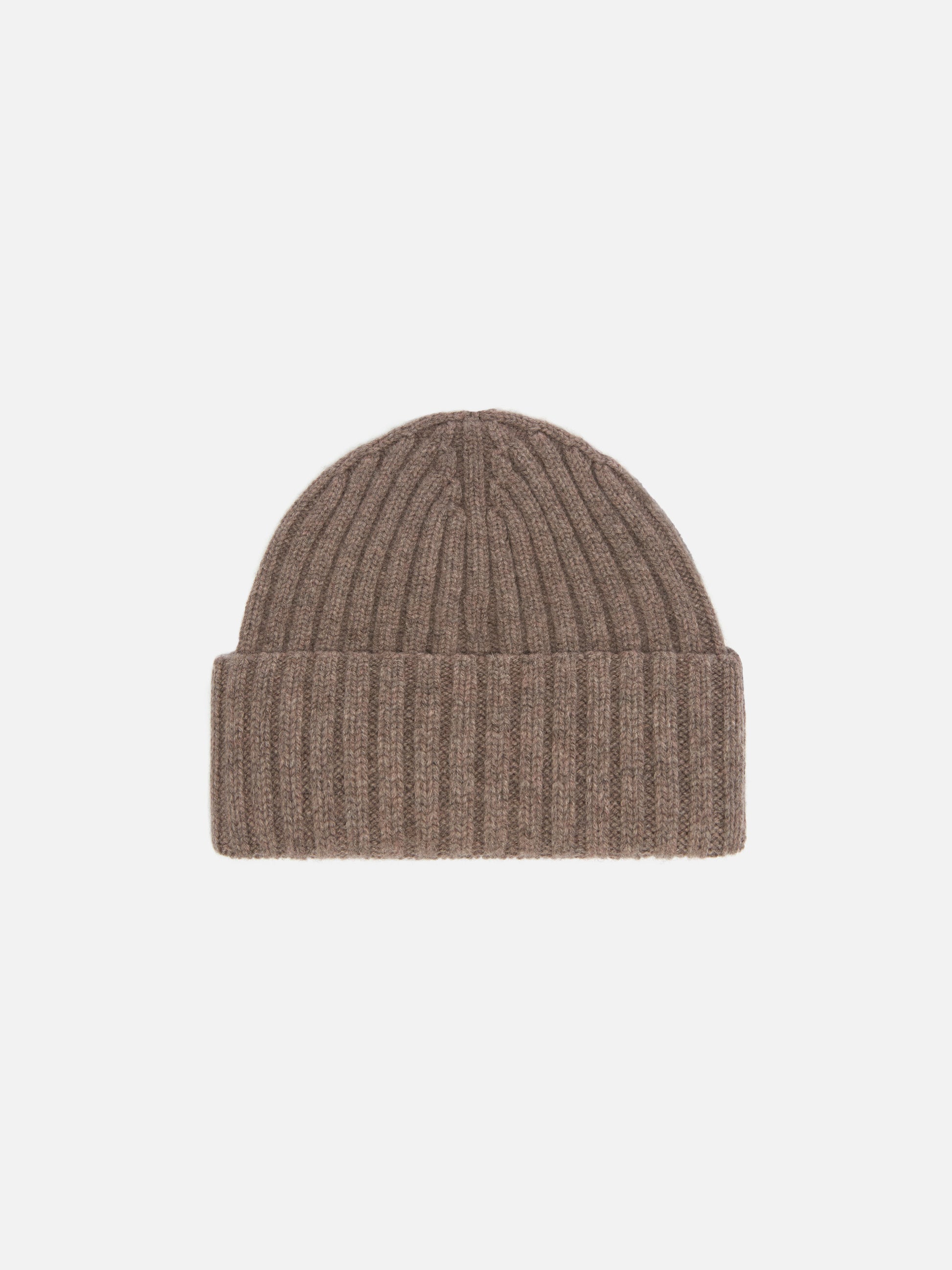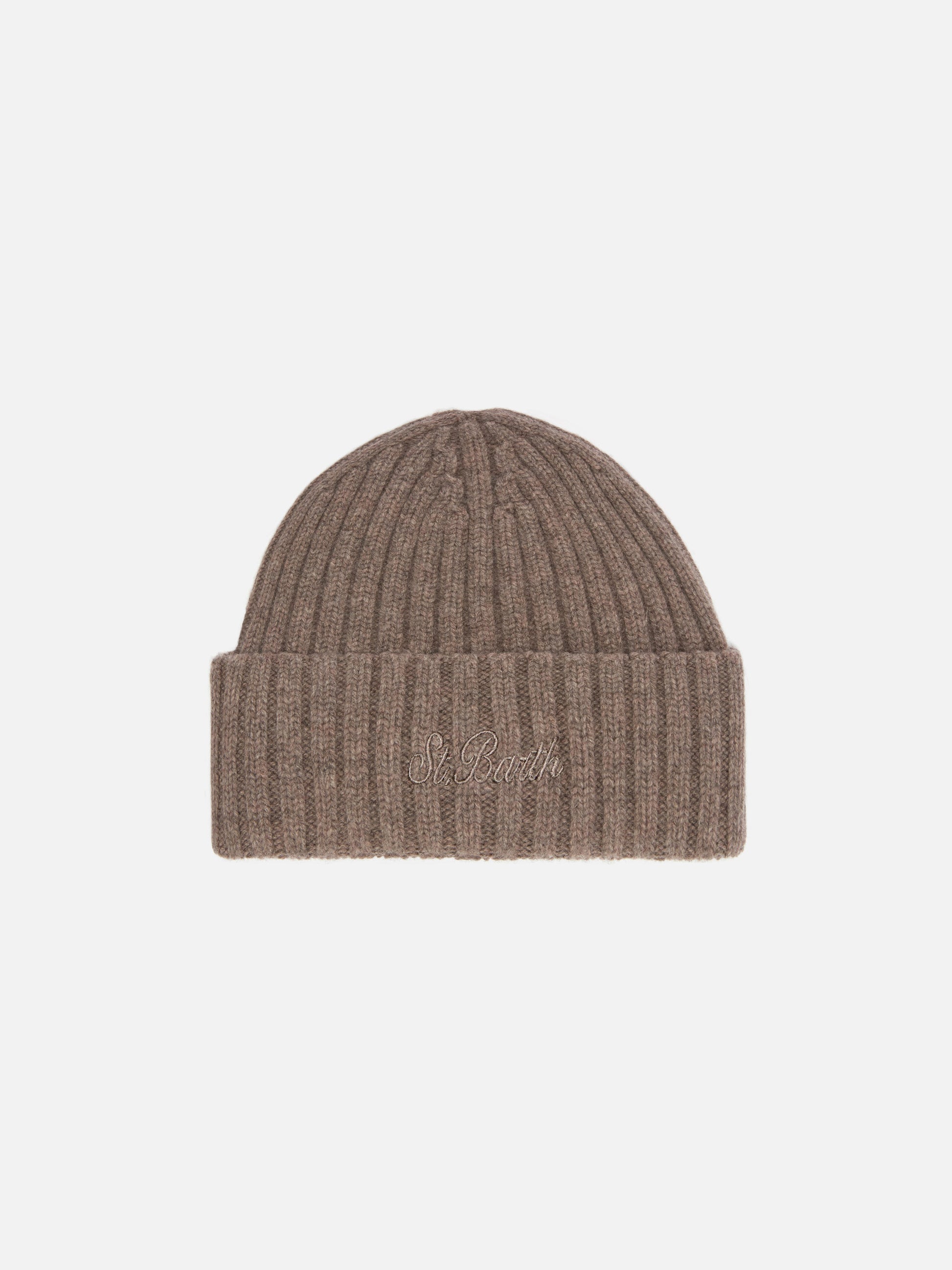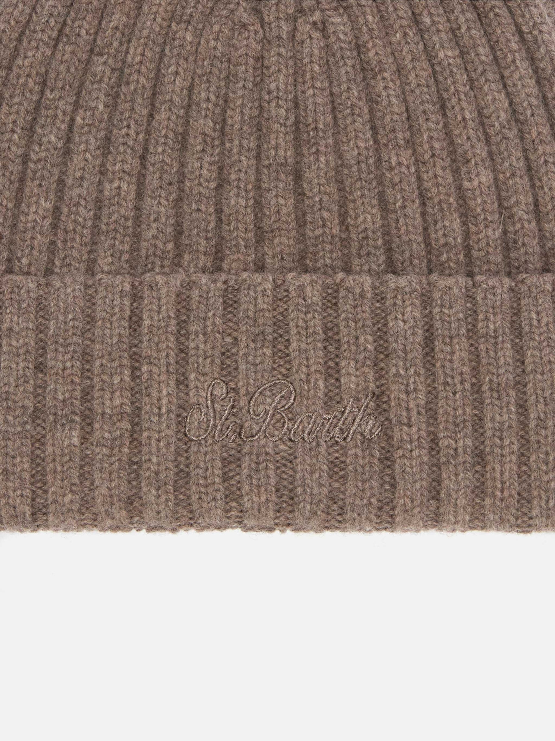 Wengen-Mütze aus haselnussbrauner Wolle mit St.-Barth-Stickerei am Umschlag