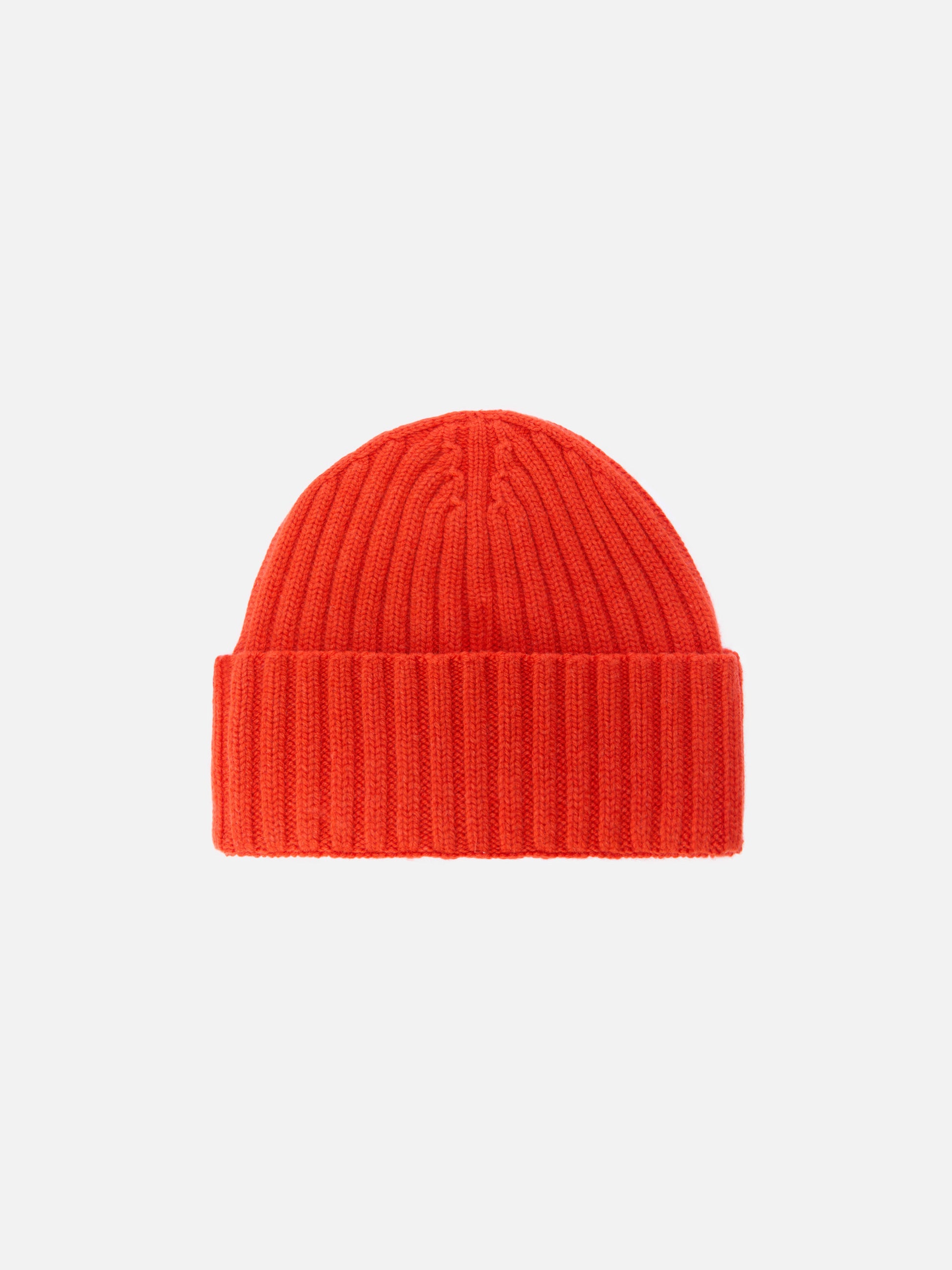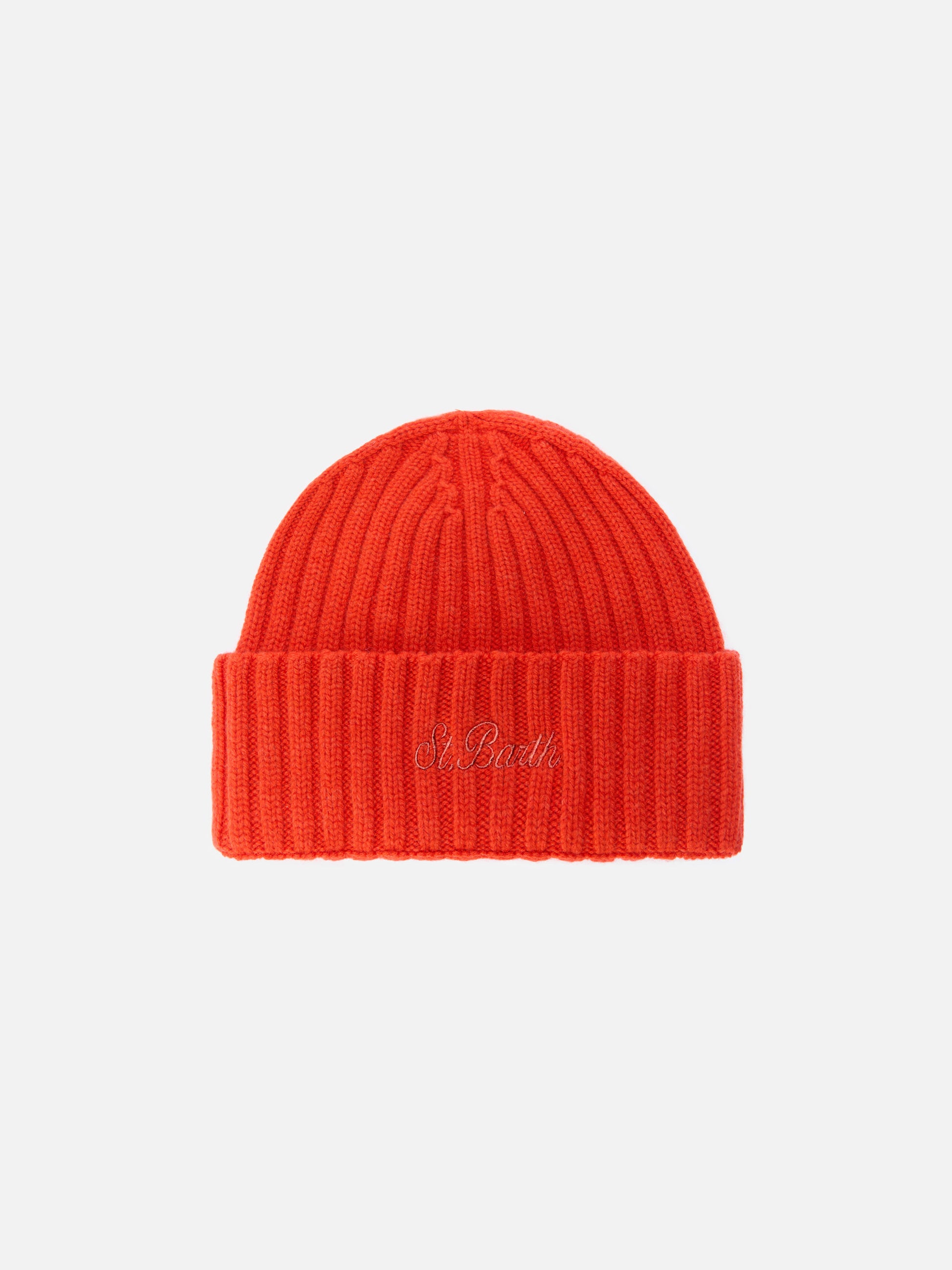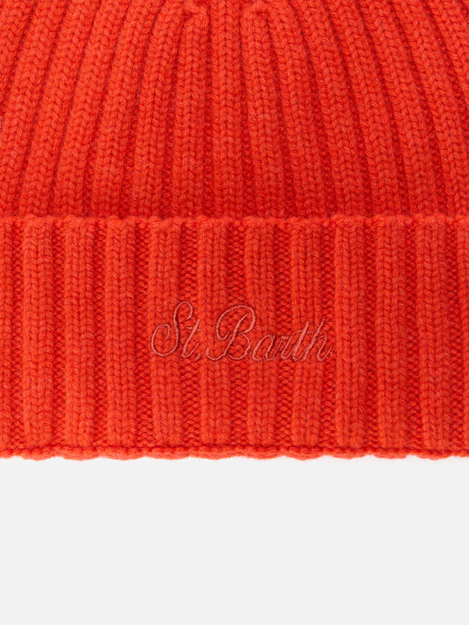Wengen-Mütze aus orangefarbener Wolle mit St.-Barth-Stickerei am Umschlag