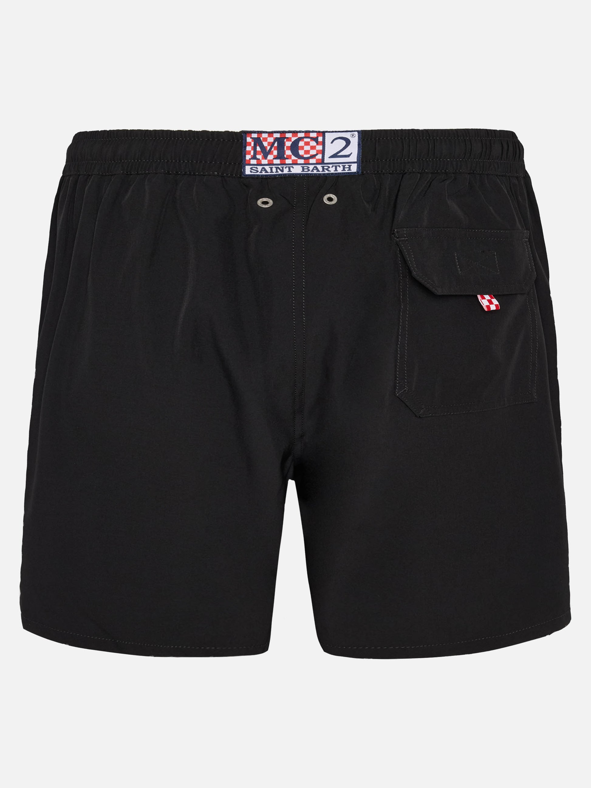 Man Comfort swim shorts Black plain color Relaxed fit Side on-seam pockets Back right velcro pocket Signature embroidered St. Barth on the left hem MC2 Saint Barth label on the back Mesh inner briefs for additional support Branded back eyelets to drain water Composition: 92% RPET, 8% spandex Size large has a 55 cm half waist, a 42,5 cm total length (belt included) and a 31,5 cm of inseam width Elastic drawstring waistband Model is 185 cm and wears a size large Care Instructions: cold wash by running water and neutral soap. Hang to dry. Do not leave to soak and do not dry in contact with other clothing. Do not leave the garment wet in contact with other clothing.