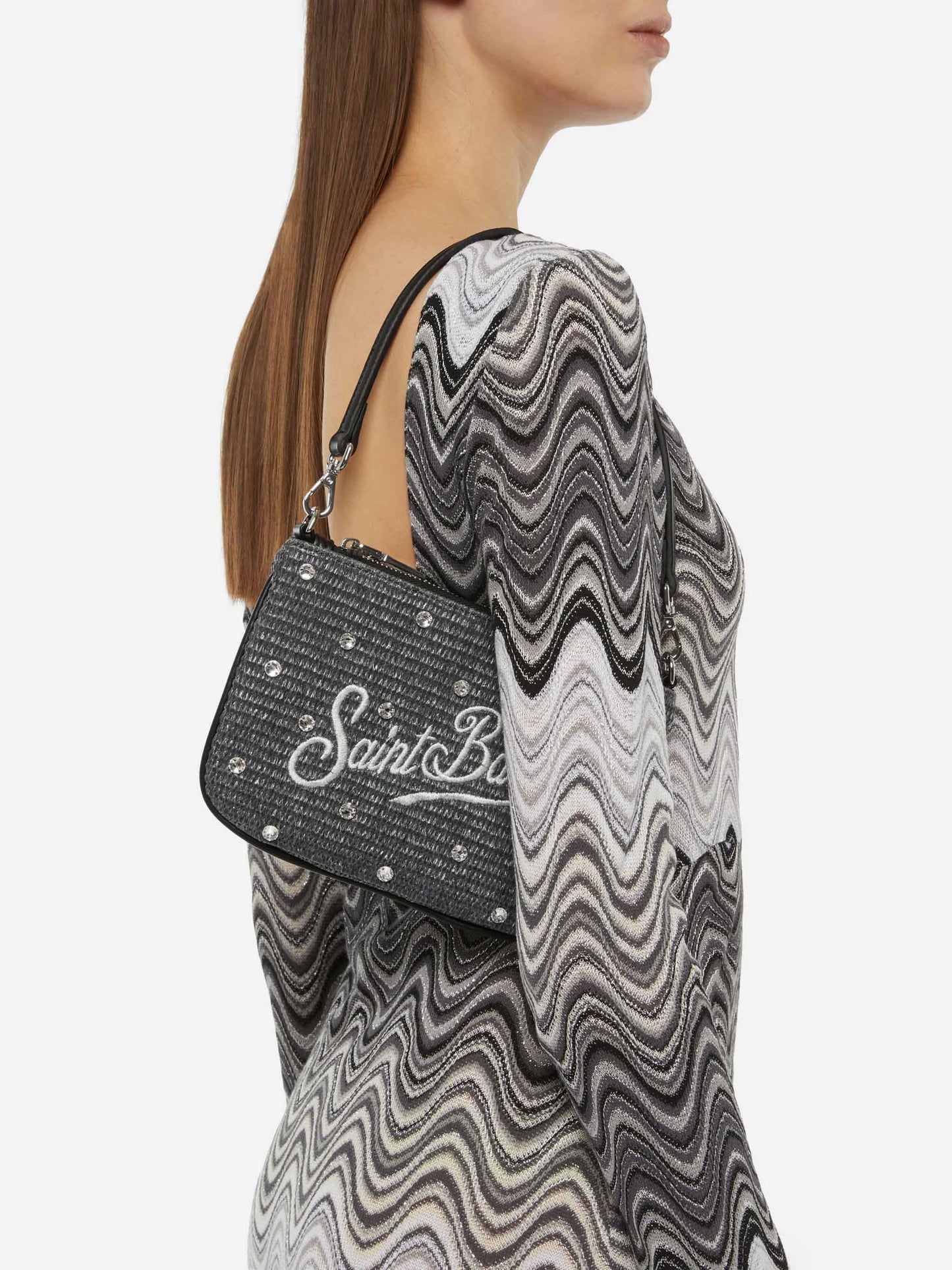 Black Parisienne Straw mini pouch bag with rhinestone embellishment