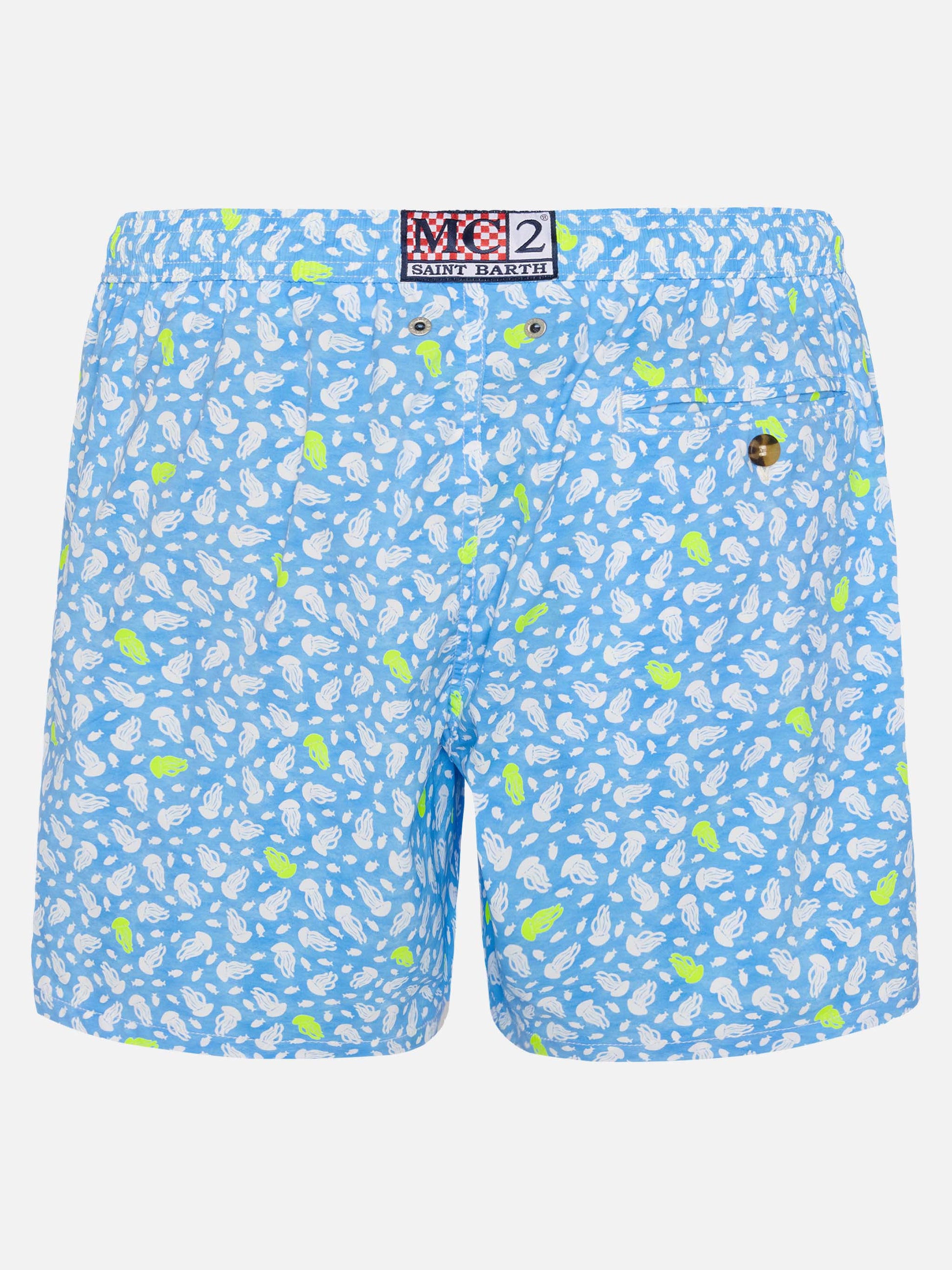 Man Comfort swim shorts Jelly fish all-over print on bluette backcloth Mechanical stretch fabric Relaxed fit Side on-seam pockets Back right velcro pocket Signature embroidered MC2 Saint Barth on the left hem MC2 Saint Barth label on the back Mesh inner briefs for additional support Branded back eyelets to drain water Composition: 100% polyestere Size large has a 55 cm half waist, a 42,5 cm total length (belt included) and a 31,5 cm of inseam width Elastic drawstring waistband Model is 185 cm and wears a size large Care Instructions: cold wash by running water and neutral soap. Hang to dry. Do not leave to soak and do not dry in contact with other clothing. Do not leave the garment wet in contact with other clothing.