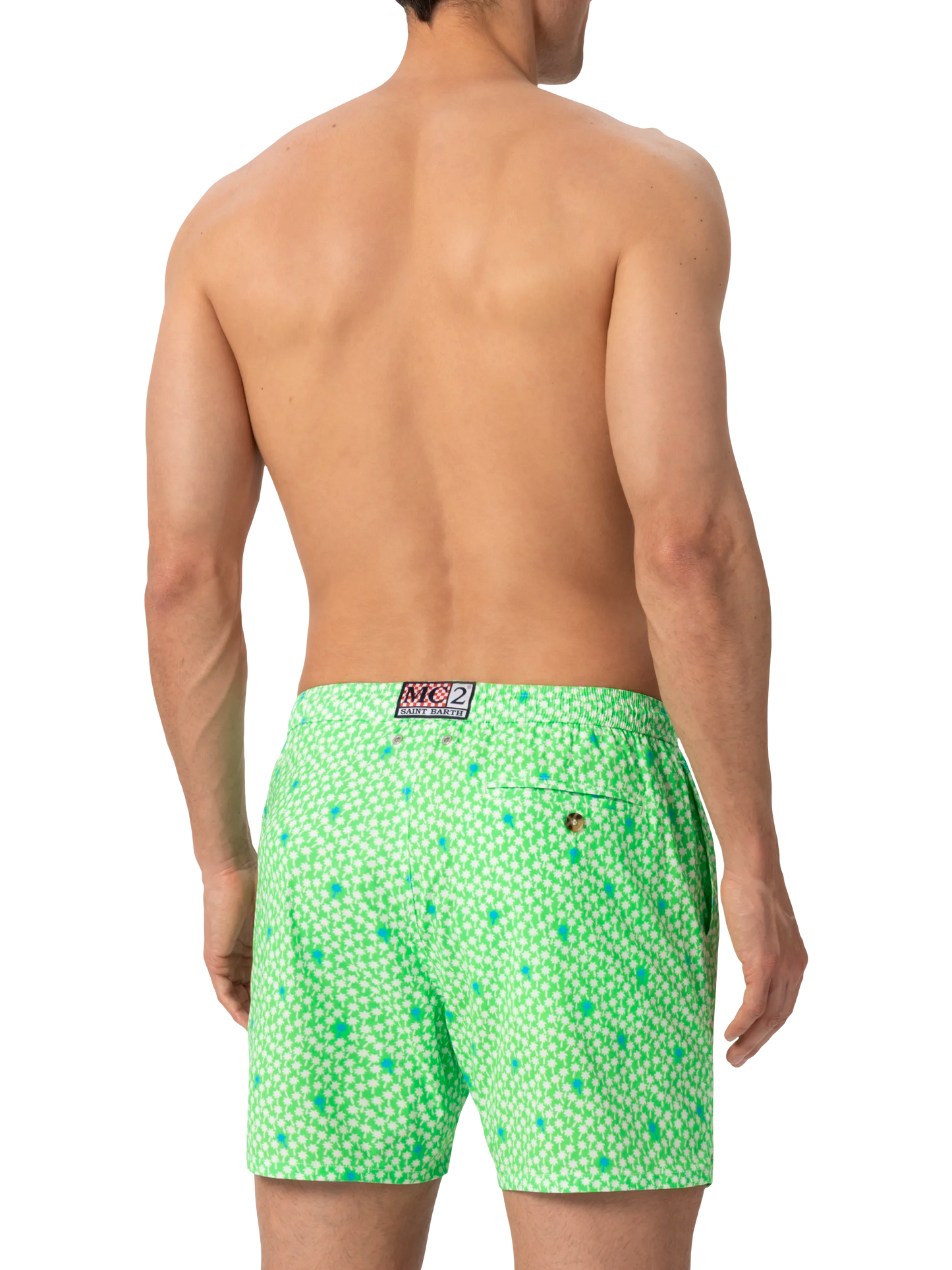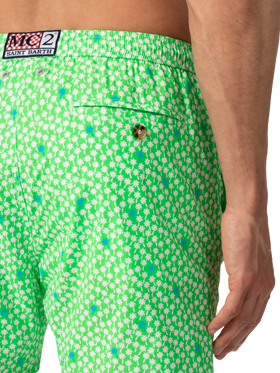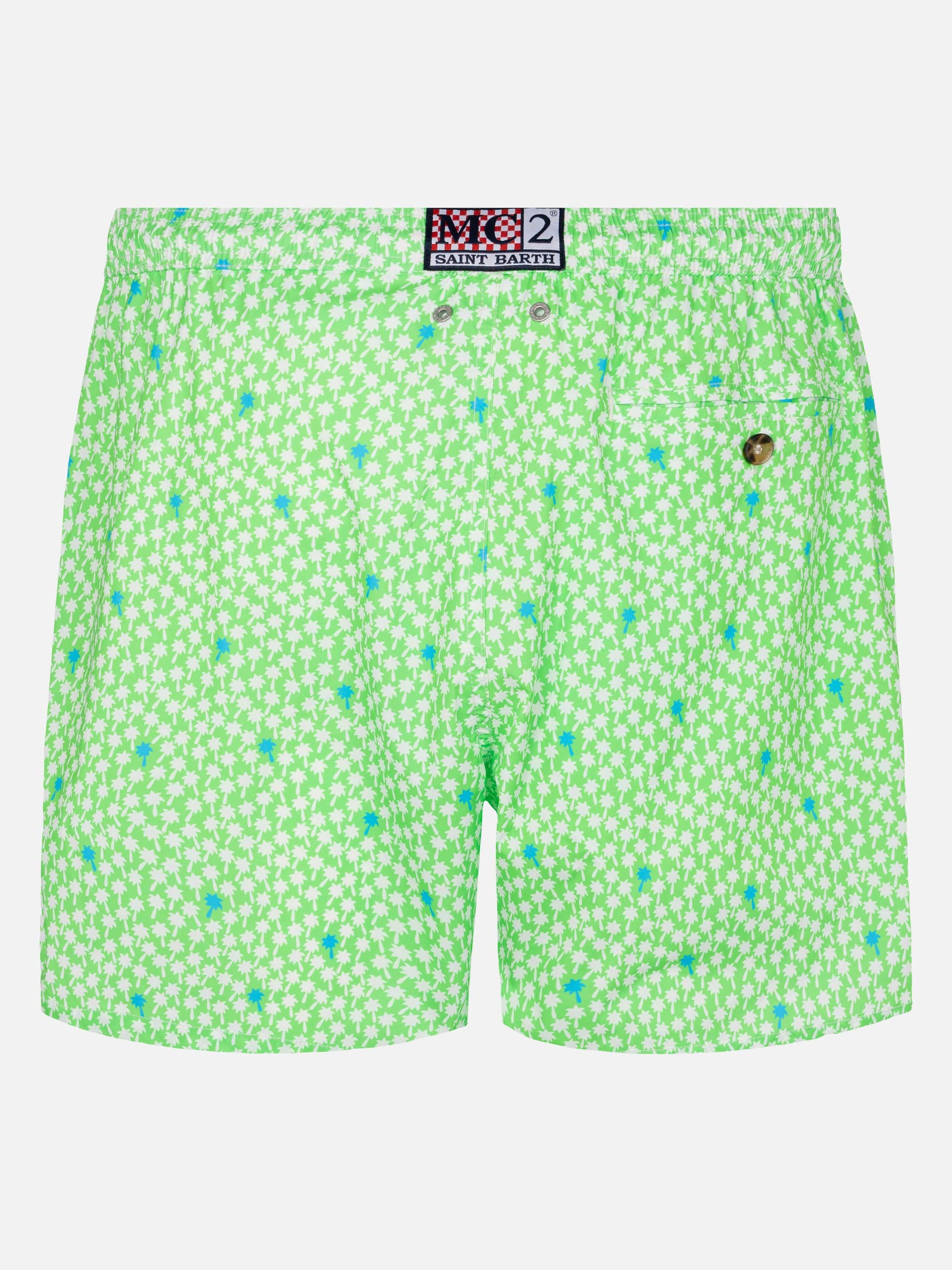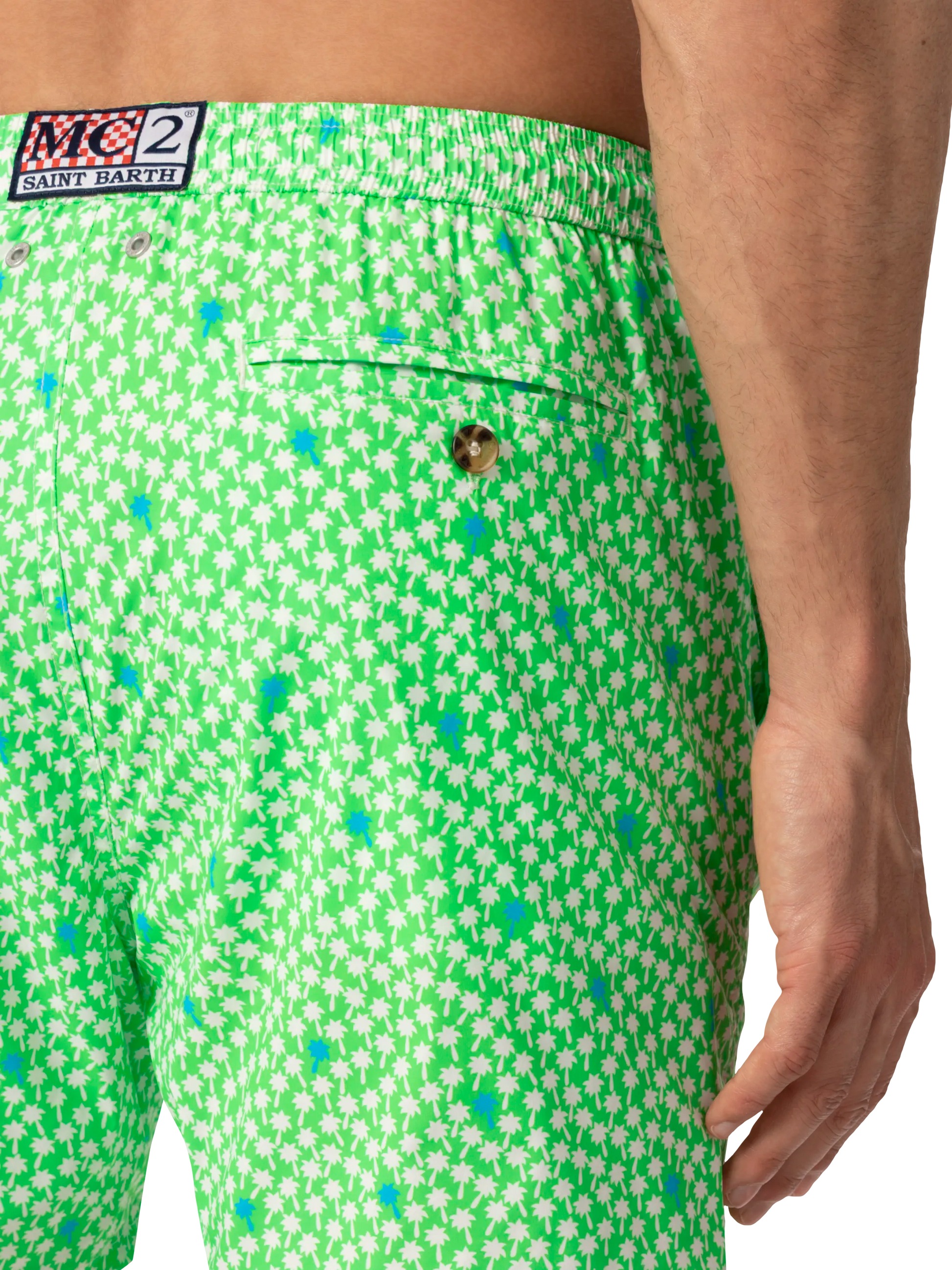 Man Comfort swim shorts Palms all over print on fluo green backcloth Mechanical stretch fabric Relaxed fit Side on-seam pockets Back right velcro pocket Signature embroidered MC2 Saint Barth on the left hem MC2 Saint Barth label on the back Mesh inner briefs for additional support Branded back eyelets to drain water Composition: 100% polyestere Size large has a 55 cm half waist, a 42,5 cm total length (belt included) and a 31,5 cm of inseam width Elastic drawstring waistband Model is 185 cm and wears a size large Care Instructions: cold wash by running water and neutral soap. Hang to dry. Do not leave to soak and do not dry in contact with other clothing. Do not leave the garment wet in contact with other clothing.