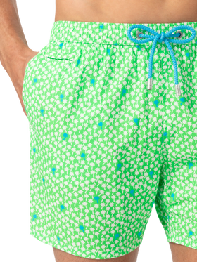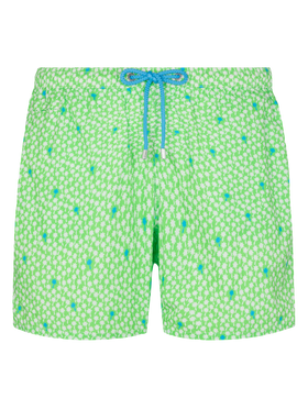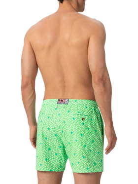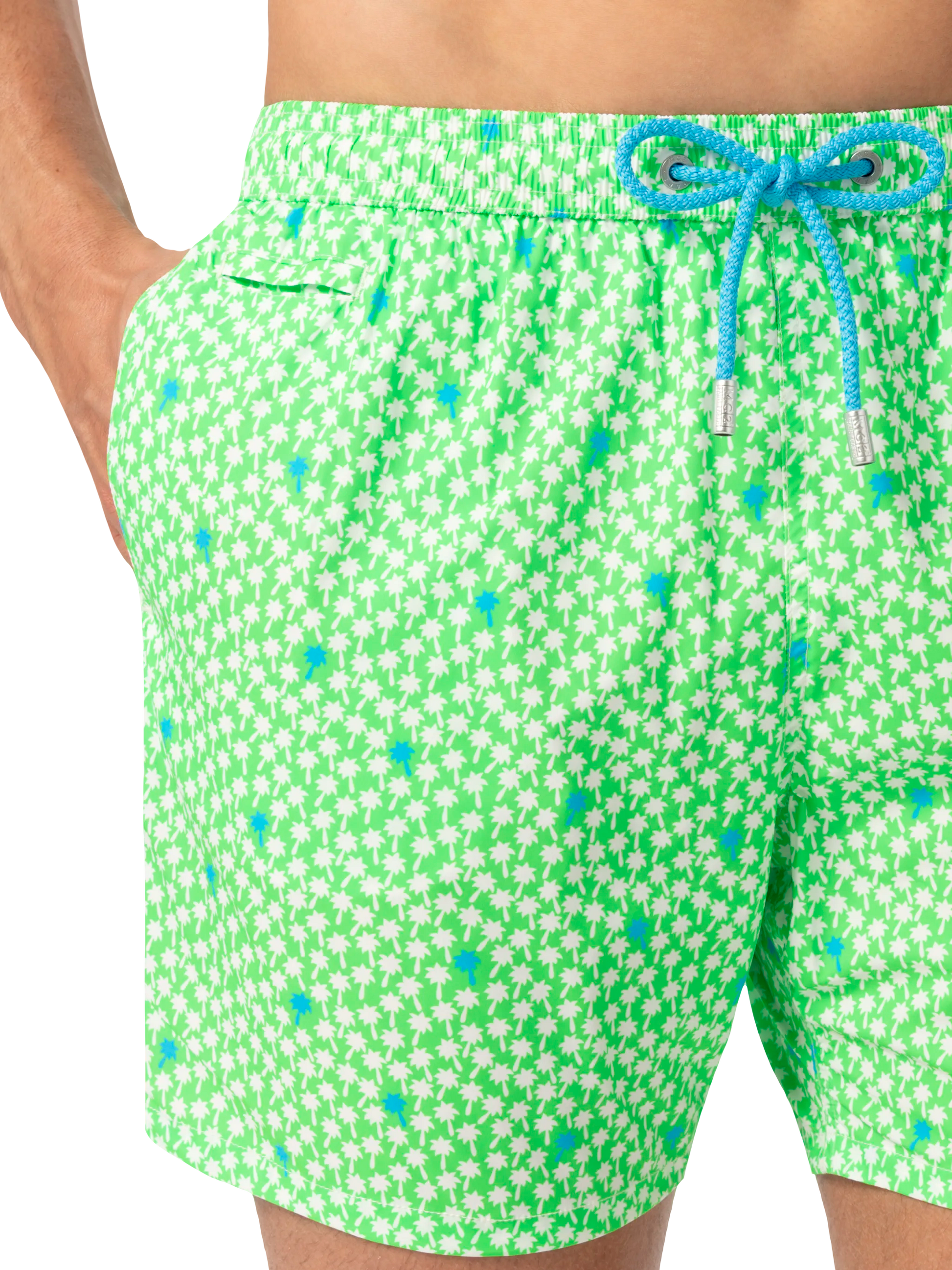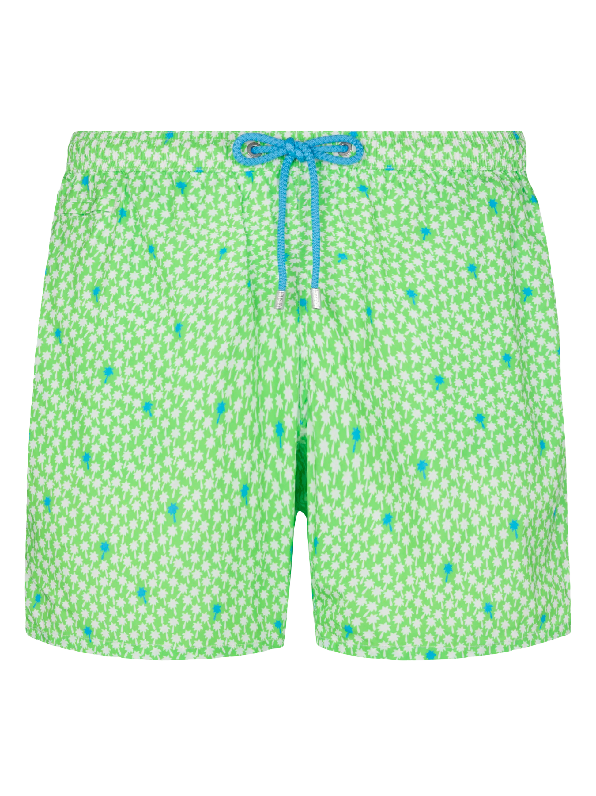 Man Comfort swim shorts Palms all over print on fluo green backcloth Mechanical stretch fabric Relaxed fit Side on-seam pockets Back right velcro pocket Signature embroidered MC2 Saint Barth on the left hem MC2 Saint Barth label on the back Mesh inner briefs for additional support Branded back eyelets to drain water Composition: 100% polyestere Size large has a 55 cm half waist, a 42,5 cm total length (belt included) and a 31,5 cm of inseam width Elastic drawstring waistband Model is 185 cm and wears a size large Care Instructions: cold wash by running water and neutral soap. Hang to dry. Do not leave to soak and do not dry in contact with other clothing. Do not leave the garment wet in contact with other clothing.