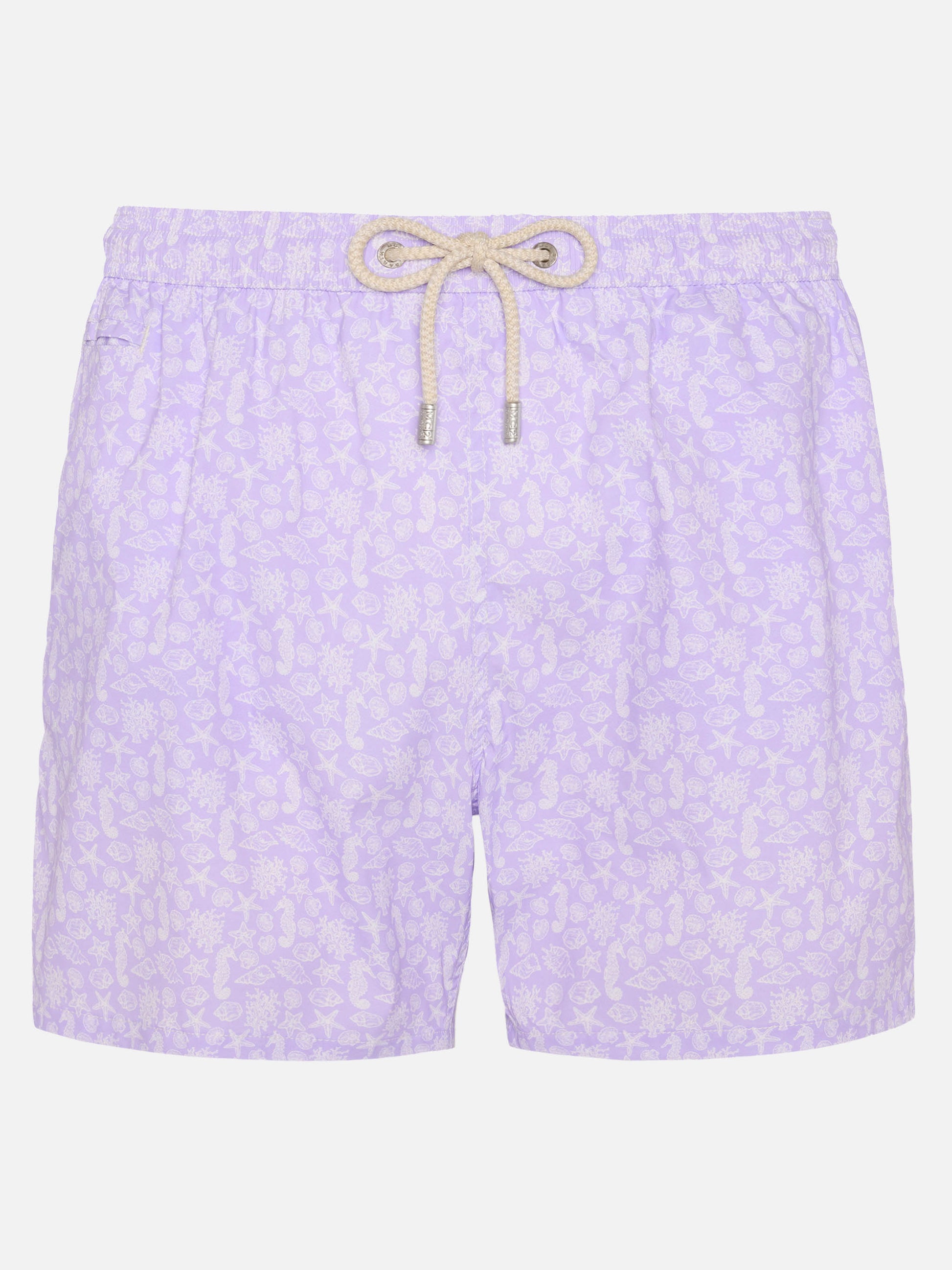 Man Comfort swim shorts Sea animals all-over print on lilac backcloth Mechanical stretch fabric Relaxed fit Side on-seam pockets Back right velcro pocket Signature embroidered MC2 Saint Barth on the left hem MC2 Saint Barth label on the back Mesh inner briefs for additional support Branded back eyelets to drain water Composition: 100% polyestere Size large has a 55 cm half waist, a 42,5 cm total length (belt included) and a 31,5 cm of inseam width Elastic drawstring waistband Model is 185 cm and wears a size large Care Instructions: cold wash by running water and neutral soap. Hang to dry. Do not leave to soak and do not dry in contact with other clothing. Do not leave the garment wet in contact with other clothing.