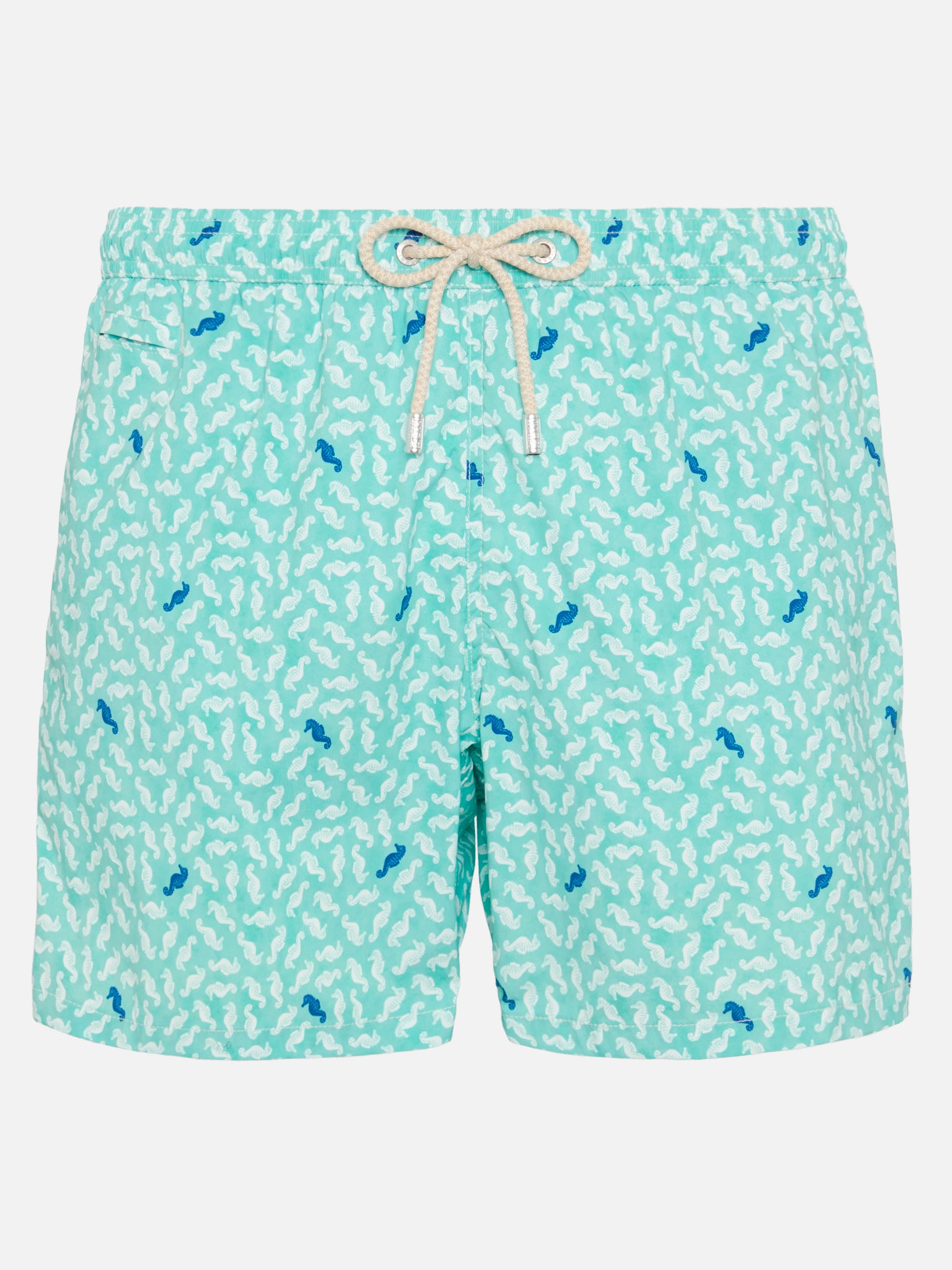 Man Comfort swim shorts Sea horse all over print on sage green backcloth Mechanical stretch fabric Relaxed fit Side on-seam pockets Back right velcro pocket Signature embroidered MC2 Saint Barth on the left hem MC2 Saint Barth label on the back Mesh inner briefs for additional support Branded back eyelets to drain water Composition: 100% polyestere Size large has a 55 cm half waist, a 42,5 cm total length (belt included) and a 31,5 cm of inseam width Elastic drawstring waistband Model is 185 cm and wears a size large Care Instructions: cold wash by running water and neutral soap. Hang to dry. Do not leave to soak and do not dry in contact with other clothing. Do not leave the garment wet in contact with other clothing.