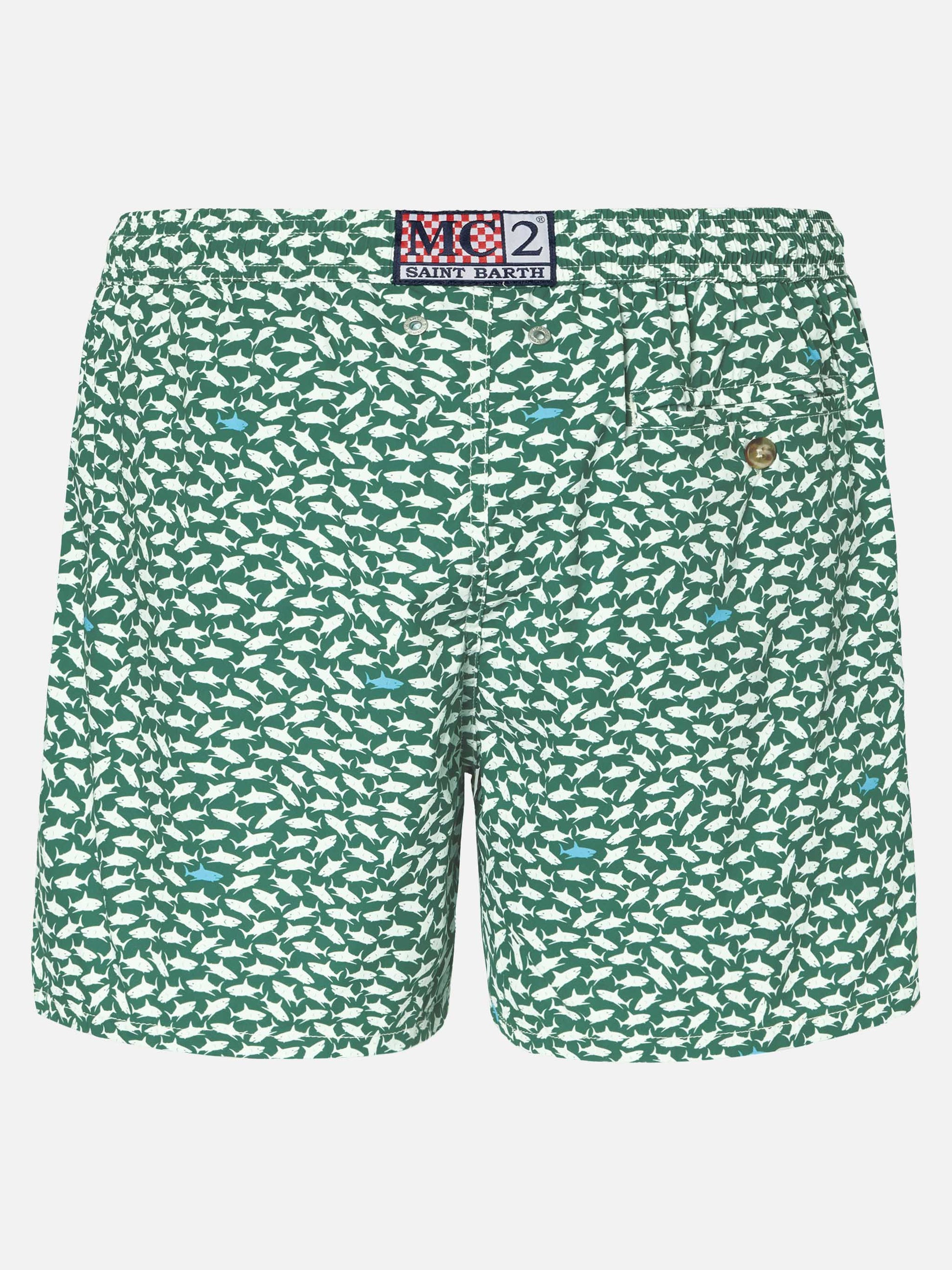 Man Comfort swim shorts Sharks all-over print on military green backcloth Mechanical stretch fabric Relaxed fit Side on-seam pockets Back right velcro pocket Signature embroidered MC2 Saint Barth on the left hem MC2 Saint Barth label on the back Mesh inner briefs for additional support Branded back eyelets to drain water Composition: 100% polyestere Size large has a 55 cm half waist, a 42,5 cm total length (belt included) and a 31,5 cm of inseam width Elastic drawstring waistband Model is 185 cm and wears a size large Care Instructions: cold wash by running water and neutral soap. Hang to dry. Do not leave to soak and do not dry in contact with other clothing. Do not leave the garment wet in contact with other clothing.