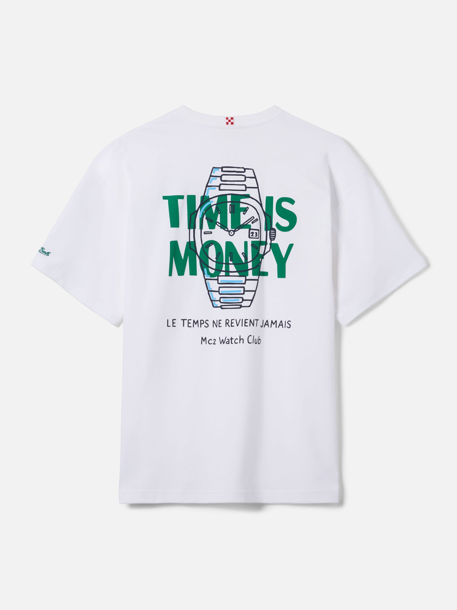 https://it.mc2saintbarth.com/en/products/delmar-t-shirt-with-time-is-money-print-and-maxi-graphic-on-the-back10775856742746Delmar t-shirt with Time Is Money print and maxi graphic on the back89,00https:files/UID_DLR000101605L-MAN-T-SHIRT-WHITE-MC2-MC2_5.jpghttps:files/UID_DLR000101605L-MAN-T-SHIRT-WHITE-MC2-MC2_5.jpgEURInStockT-SHIRT650948215130All Products - Only Man649134276954AVADA - Best Sellers288164774072Man T-shirts647472087386Printed T-Shirts654690484570UpSelling_Man_T-shirts621710016858Watches passionatesThe Delmar t-shirt is crafted from pure cotton, designed to provide comfort and a natural feel against the skin. The white solid-color design highlights the essential construction of the garment. The style features a Time Is Money in St. Barth print on the chest, while the back is enriched with a large graphic print featuring a watch and the Time Is Money lettering, completed by the phrases Le temps ne revient jamais and MC2 Watch Club. The garment is finished with a crew neck, short sleeves and a straight silhouette with a relaxed fit.