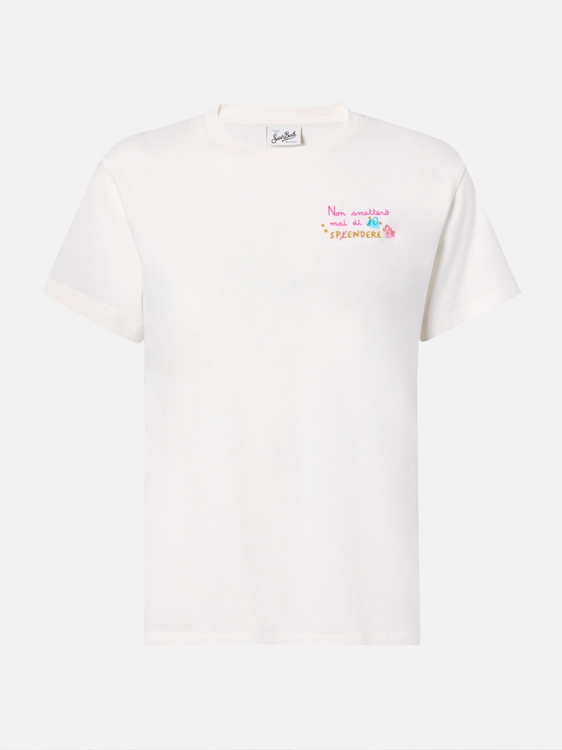 Emilie organic cotton T-shirt in white with Non smetterò mai di Sp(l)endere embroidery
