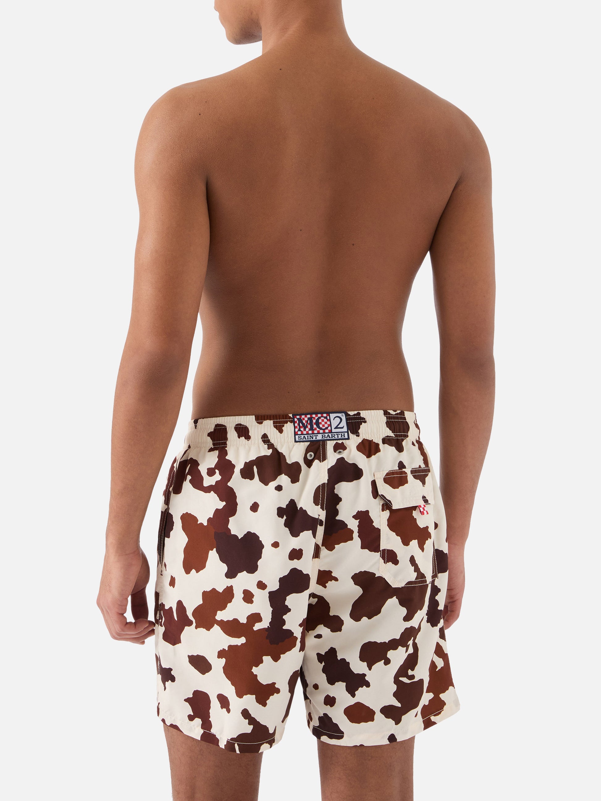 Gustavia swim shorts are crafted from lightweight fabric with a soft peach-touch finish that ensures comfort and a pleasant feel on the skin. The all-over cow print in shades of brown and white gives the style an original and distinctive character. The elasticated waistband with drawstring allows the fit to be easily adjusted, while the construction with side pockets, back pocket and stretch antibacterial inner mesh ensures practicality and comfort. Part of the Family capsule.