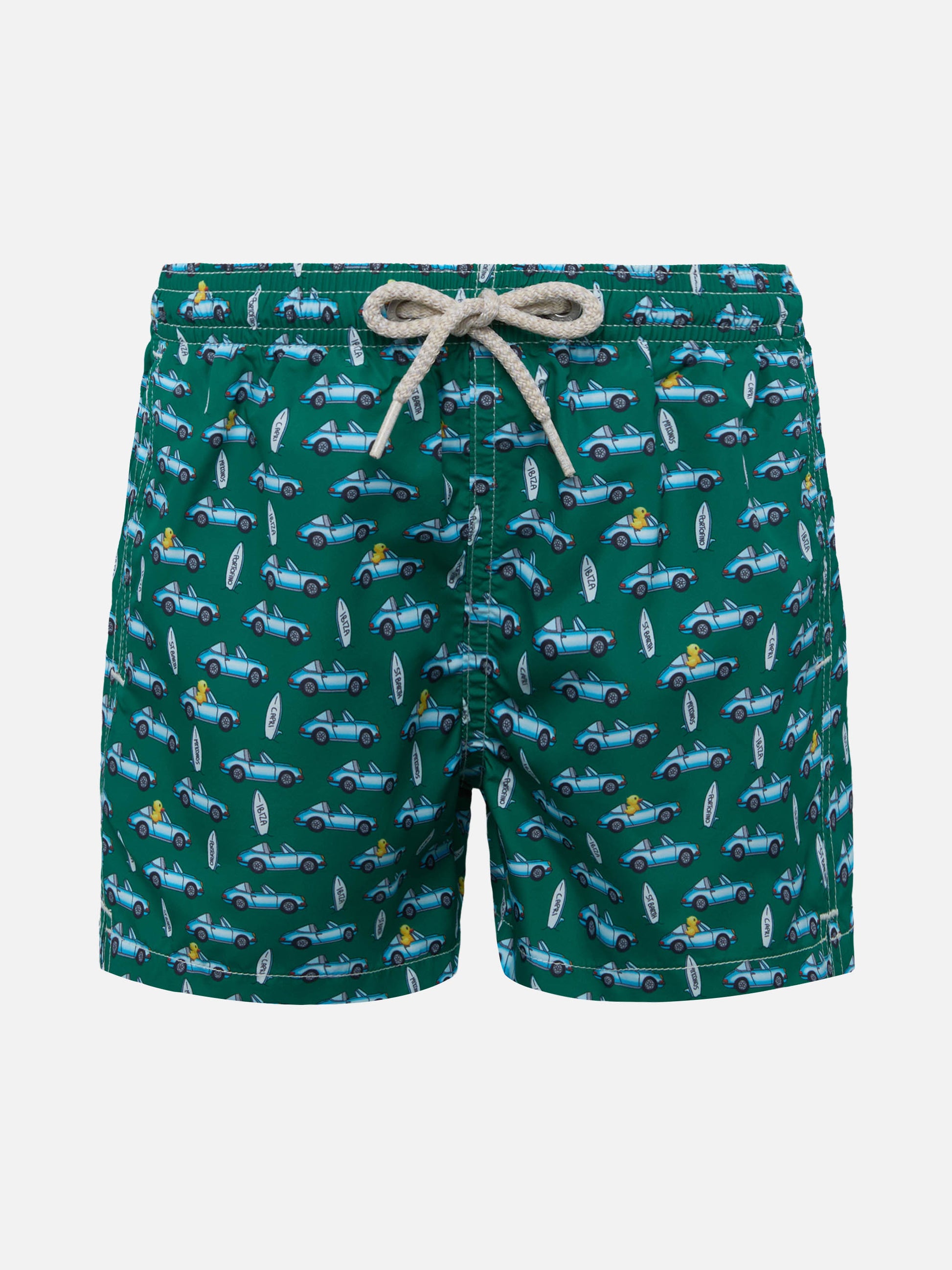 Jean Lighting mid-length swim shorts are the mini-me version of the Lighting model, designed for comfort and quick drying. Featuring an elasticized waistband, branded eyelets for water drainage, and practical pockets, they combine style and functionality. Made from 100% recycled polyester, they reflect MC2 Saint Barth's commitment to sustainability. Boy Jean Lighting mid-length swim shorts Lightweight fabric Quick drying Porsche all-over print Green backcloth Comfortable elasticized waistband Adjustable drawcord with branded terminals Inner mesh lining Side pockets with French seams Back patch pocket with magnetic closure Branded eyelets designed to drain water and prevent ballooning effect MC2 Saint Barth exclusive label on the back Classic fit Composition: 100% recycled polyester Size 6 yrs has a half waistband width of 36 cm (stretched) and varies by 1,5/3 cm for each size, depending on the size; side length including waistband 23 cm and varies by 1,5/3 cm for each size, depending on the size Please note that all measurements provided are approximate and subject to a tolerance of 1-2 cm due to manual measurement. This tolerance range is normal and should be expected. Care Instructions: cold wash by running water and neutral soap. Hang to dry .Do not leave to soak and do not dry in contact with other clothing. Do not leave the garment wet in contact with other clothing.