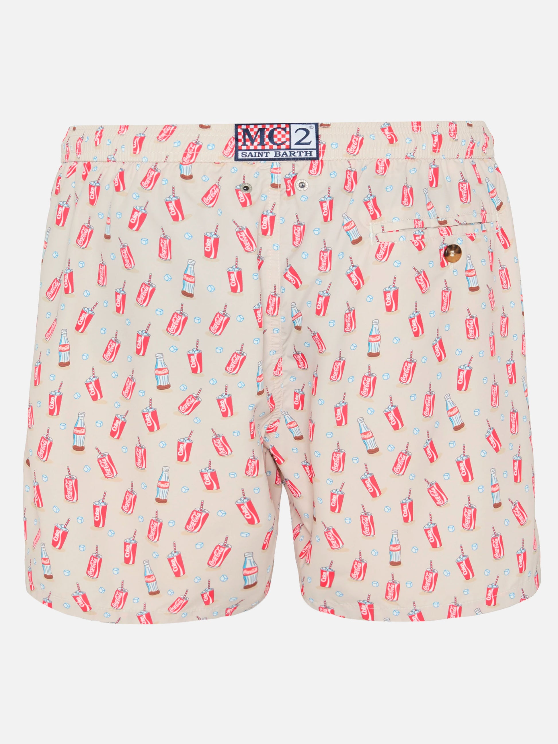 Man Lighting mid-length swim shorts are designed with a lightweight fabric that dries quickly, earning their name Lighting. Crafted from 100% recycled polyester, these shorts reflect our commitment to sustainability. Man Lighting mid-length swim shorts Lightweight Quick drying Coca Cola logo all-over print Beige backcloth Comfortable elasticized waistband Adjustable drawcord with branded terminals Inner mesh lining Side pockets with French seams Back patch pocket with button closure Branded eyelets designed to drain water and prevent ballooning effect MC2 Saint Barth exclusive label on the back Classic fit Composition: 100% recycled polyester Size L has a half waistband width of 52,5 cm (stretched) and varies by 2 cm for each size; side length including waistband 39,5 cm and varies by 1 or 1,5 cm for each size, depending on the size Please note that all measurements provided are approximate and subject to a tolerance of 1-2 cm due to manual measurement. This tolerance range is normal and should be expected. Model is 185 cm and wears a size large Care Instructions: cold wash by running water and neutral soap. Hang to dry. Do not leave to soak and do not dry in contact with other clothing. Do not leave the garment wet in contact with other clothing.