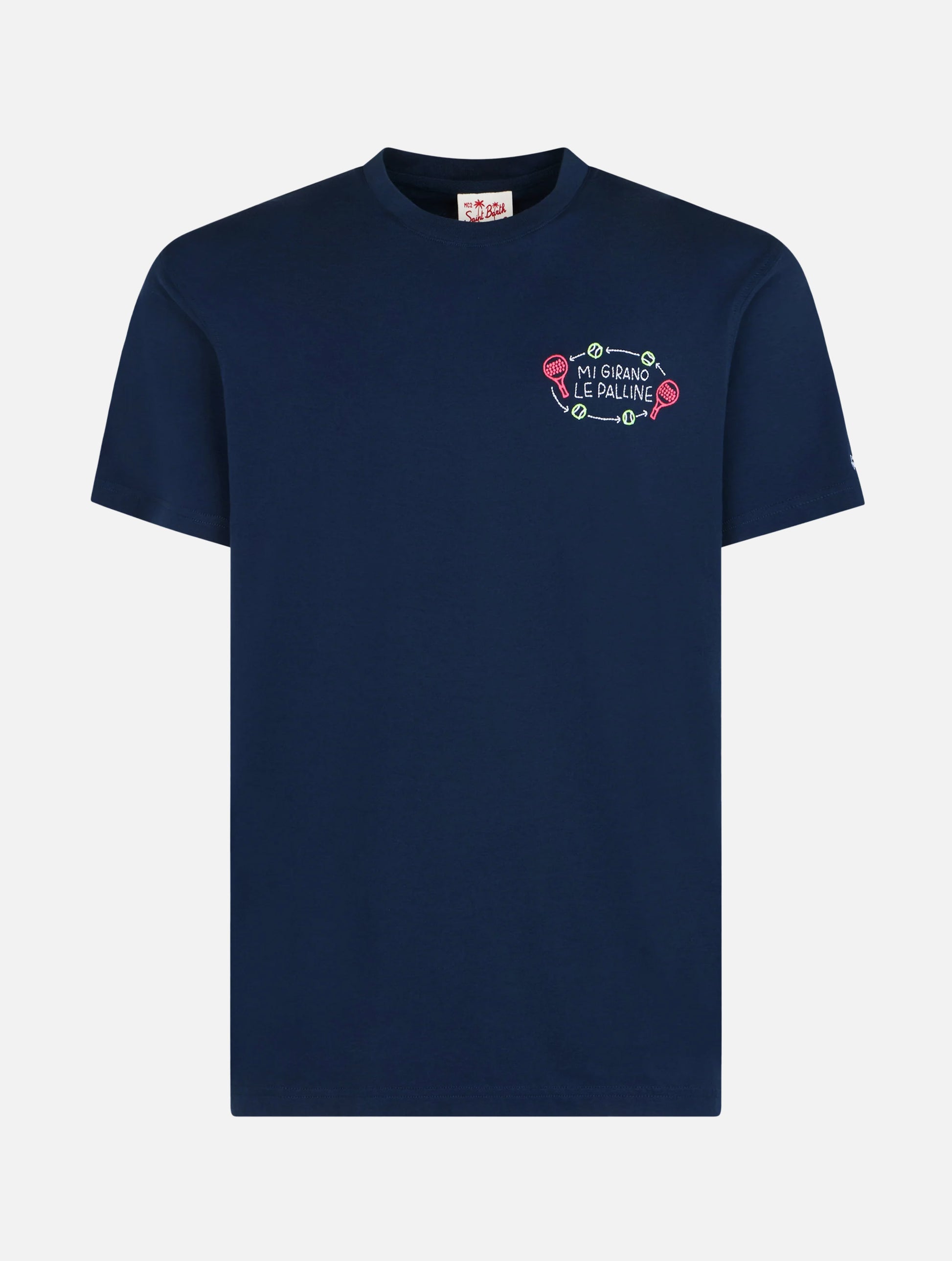 Introducing the Portofino t-shirt by MC2 Saint Barth. This men's half-sleeve tee is crafted from 100% ORGANIC COTTON jersey fabric, piece-dyed for a unique look. With a weight of 180g, it offers a comfortable regular fit. The standout feature is the collaboration with Insulti Luminosi and the embroideries placed on the heart spot, complemented by the Saint Barth embroidery on the bottom of the left sleeve. Insulti Luminosi is an Italian brand known for pioneering LED phrases with irreverent sarcasm, later expanding into other realms and gadgets. Thanks to this collaboration, Insulti Luminosi aren't just luminous; they've now been transformed into embroidered designs for t-shirts and other accessories. Man organic cotton t-shirt Portofino Blue plain color fabric Multicolor embroidery on the left chest Mi girano le palline Piece-dyed Crewneck Short sleeves Signature embroidered MC2 Saint Barth on the left sleeve Composition: 100% organic cotton. Classic Fit Size large has a 72 cm body length with a 2 cm increment per size; a 48 cm shoulder width with a 2 cm increment per size; and a 56 cm half chest measurement with a 2.5 cm increment per size Model is 185 cm and wears a size large