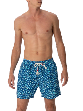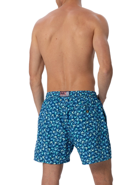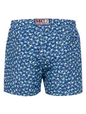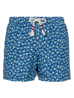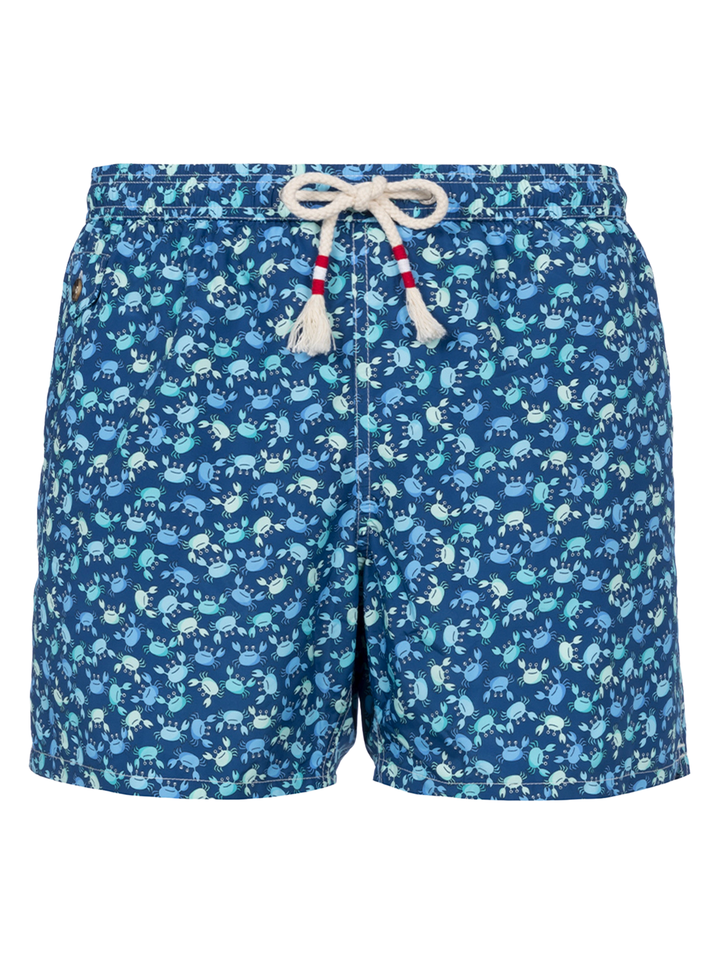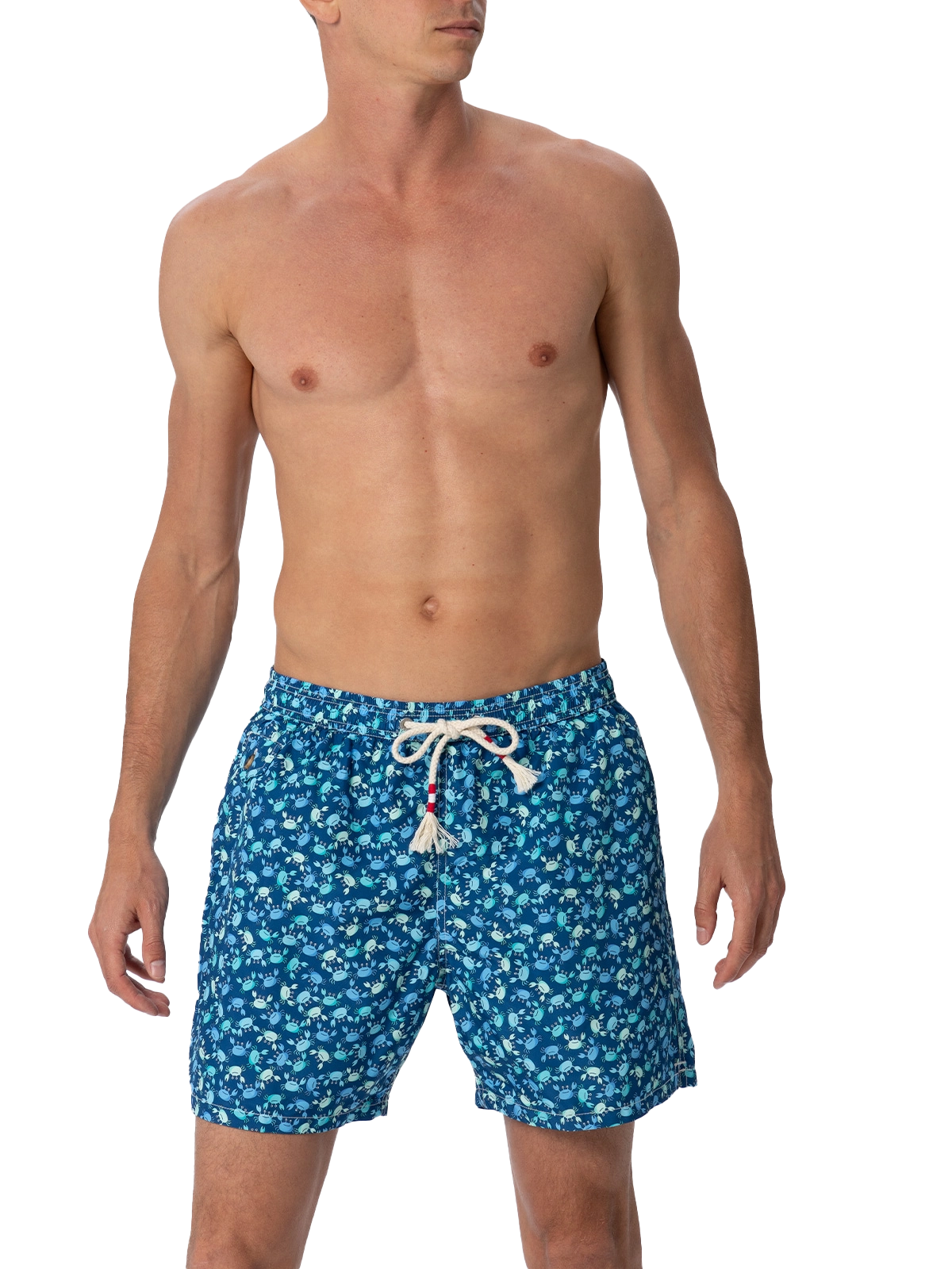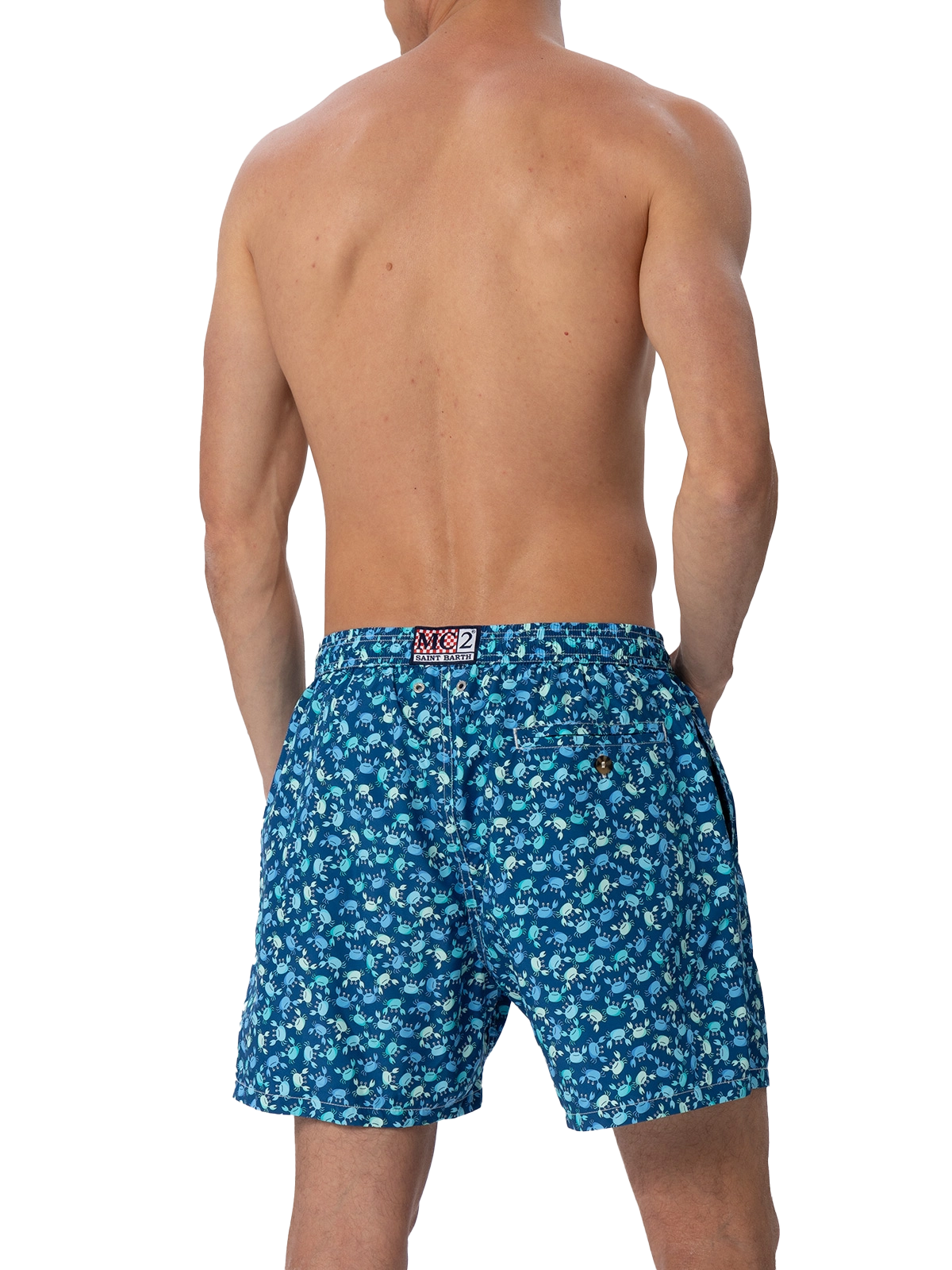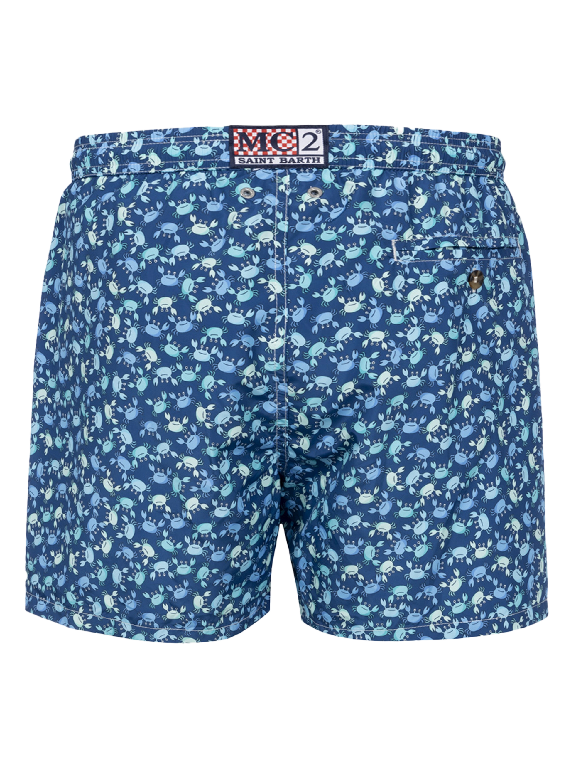 Man Lighting 70 mid-length swim shorts are designed with a lightweight fabric that dries quickly, earning their name Lighting. 70 is because the patterns chosen for this model evoke the elegance of those years, even on the beach, like maiolica and gipsy prints. The elasticized waistband ensures a comfortable fit, while the branded eyelets are strategically placed to drain water and prevent the shorts from ballooning. The white rope drawstring with red thread tip and the absence of metal components give it a retro touch. Featuring side pockets with French seams and a back patch pocket with a button closure, these swim shorts are both practical and stylish. Additionally, there's a small internal coin pocket for added convenience. The all-over print adds a touch of flair to this versatile swimwear option. Crafted from 100% recycled polyester, these shorts reflect our commitment to sustainability. Man Lighting mid-length swim shorts Lightweight fabric Quick drying Crabs all-over print Blue backcloth Comfortable elasticized waistband Adjustable drawcord Inner mesh lining Side pockets with French seams Back patch pocket with button closure Branded eyelets designed to drain water and prevent ballooning effect MC2 Saint Barth exclusive label on the back Classic fit Composition: 100% recycled polyester Size L has a half waistband width of 52,5 cm (stretched) and varies by 2 cm for each size; side length including waistband 39,5 cm and varies by 1 or 1,5 cm for each size, depending on the size Please note that all measurements provided are approximate and subject to a tolerance of 1-2 cm due to manual measurement. This tolerance range is normal and should be expected. Model is 185 cm and wears a size large Care Instructions: cold wash by running water and neutral soap. Hang to dry. Do not leave to soak and do not dry in contact with other clothing. Do not leave the garment wet in contact with other clothing.
