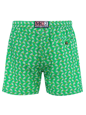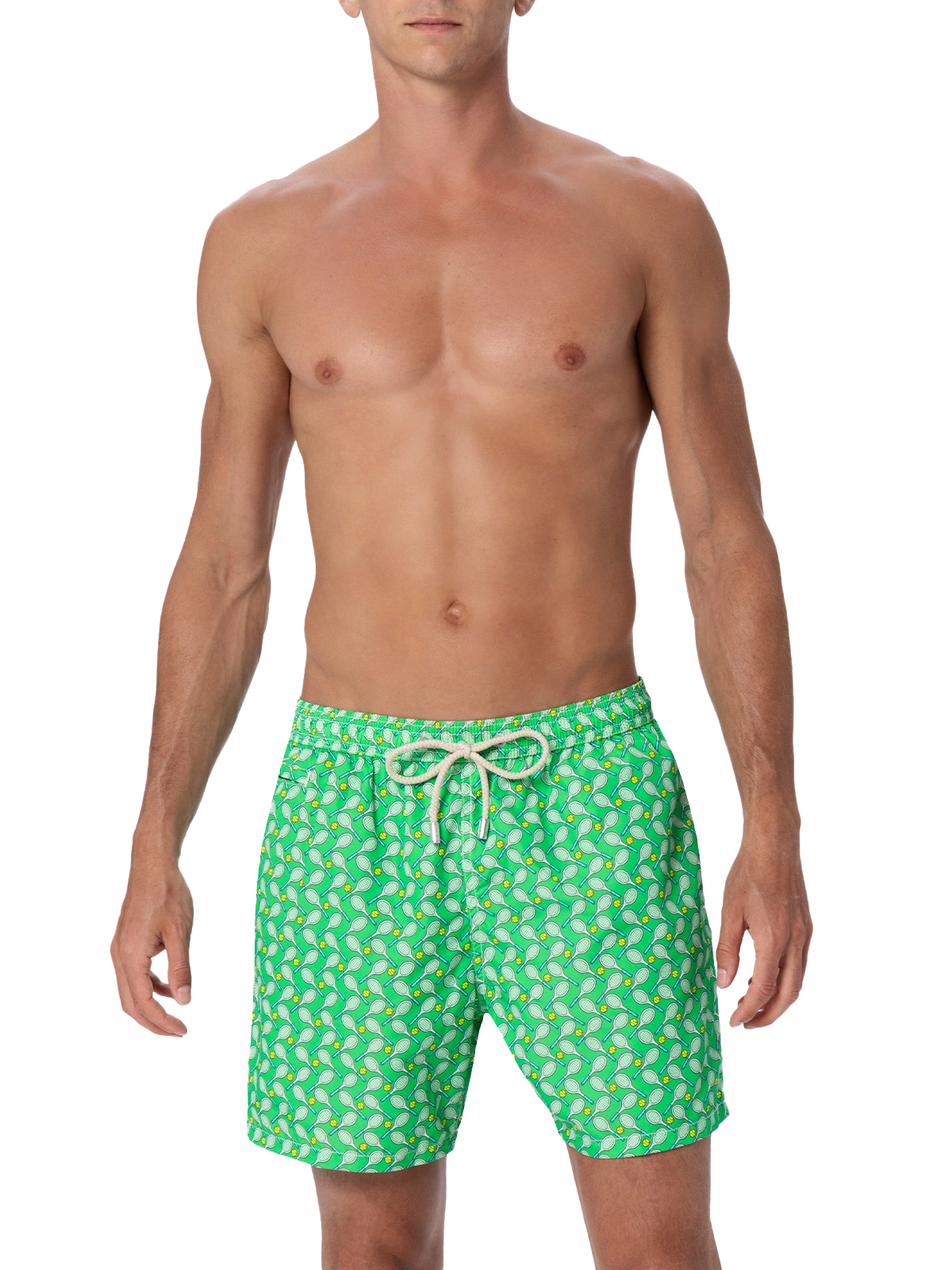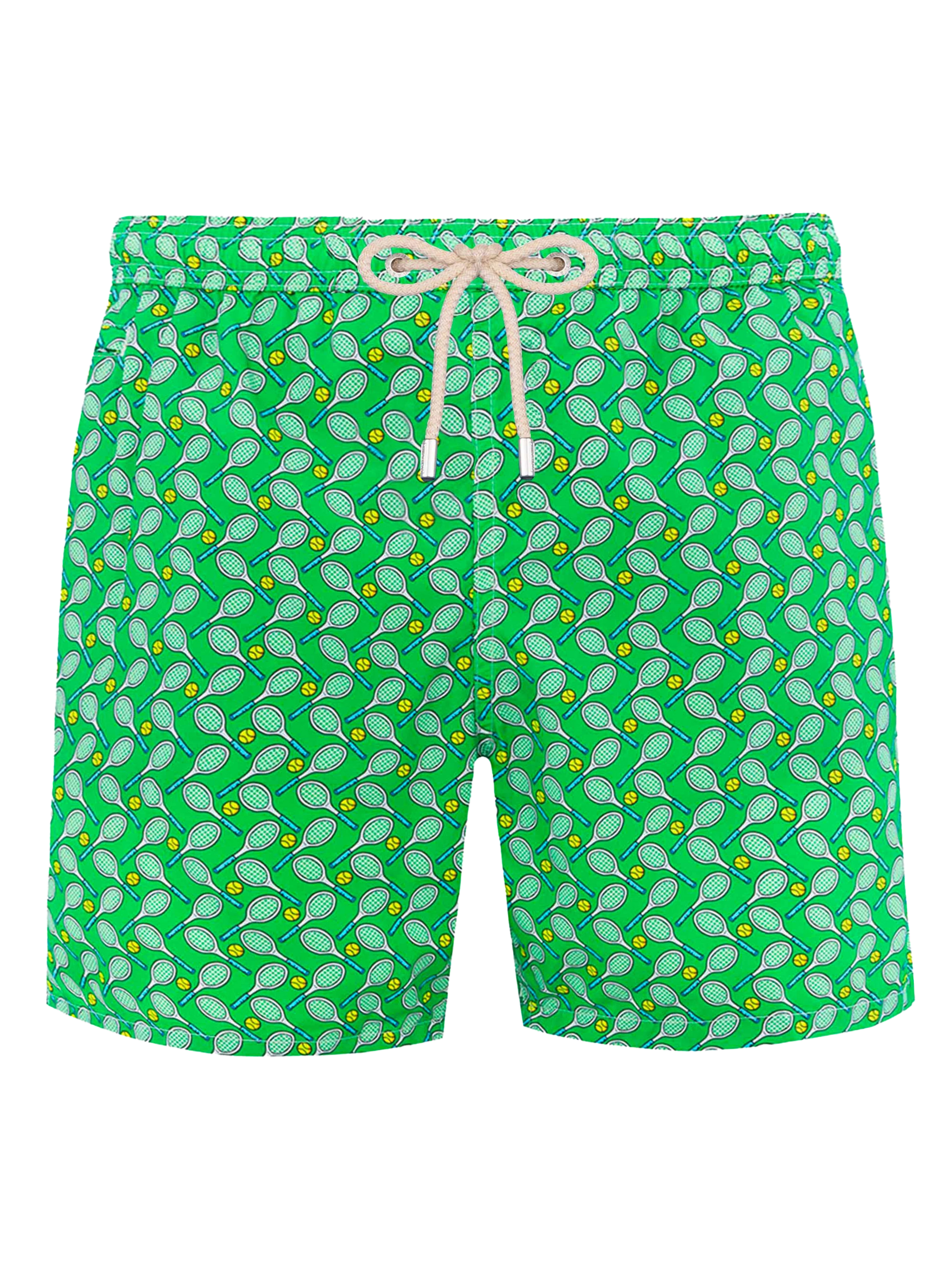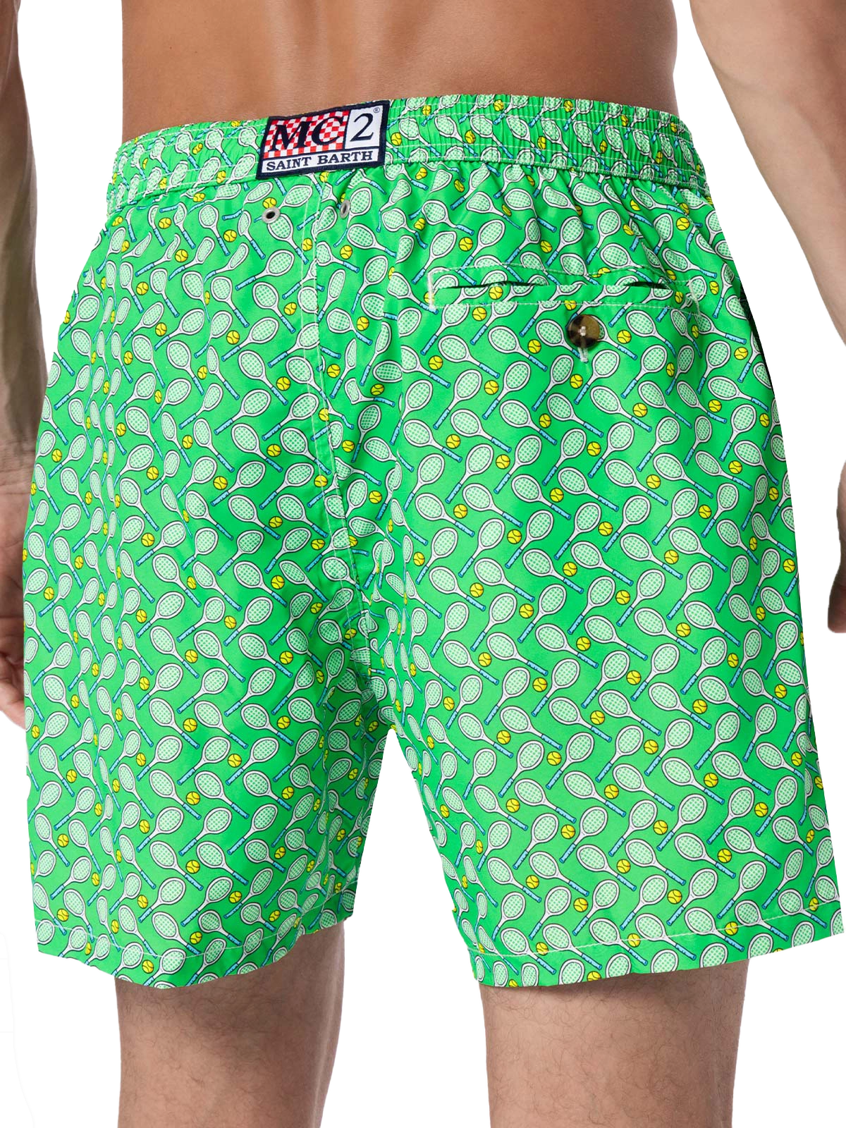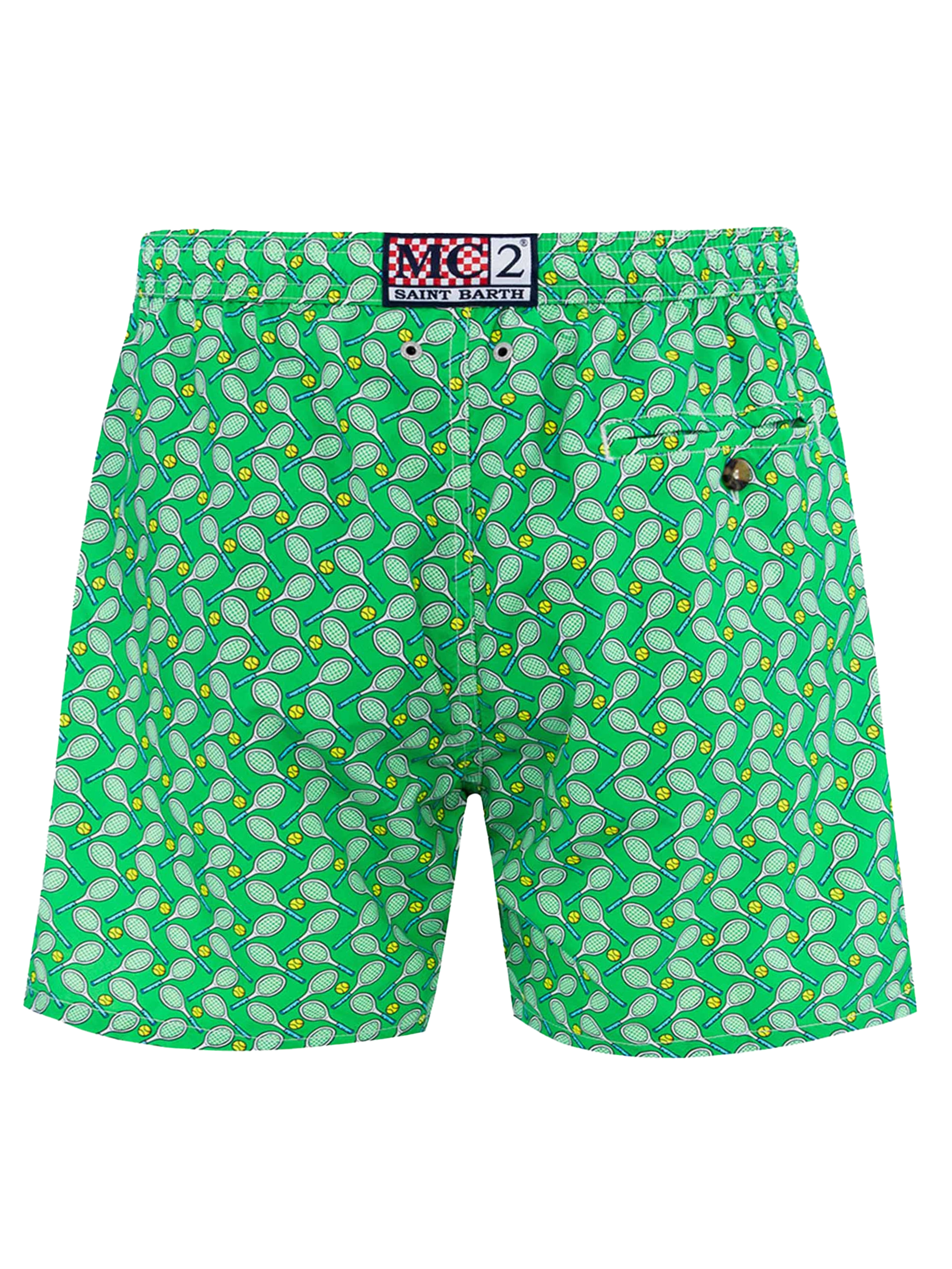 Man Lighting mid-length swim shorts are designed with a lightweight fabric that dries quickly, earning their name Lighting. The elasticized waistband and drawstring closure with branded terminals ensure a comfortable fit, while the branded eyelets are strategically placed to drain water and prevent the shorts from ballooning. Featuring side pockets with French seams and a back patch pocket with button closure, these swim shorts are both practical and stylish. Additionally, there's a small internal coin pocket for added convenience. The all-over print adds a touch of flair to this versatile swimwear option. Crafted from 100% recycled polyester, these shorts reflect our commitment to sustainability. Man Lighting mid-length swim shorts Lightweight fabric Quick drying Tennis rackets all-over print Green backcloth Comfortable elasticized waistband Adjustable drawcord with branded terminals Inner mesh lining Side pockets with French seams Back patch pocket with button closure Branded eyelets designed to drain water and prevent ballooning effect MC2 Saint Barth exclusive label on the back Classic fit Composition: 100% recycled polyester Size L has a half waistband width of 52,5 cm (stretched) and varies by 2 cm for each size; side length including waistband 39,5 cm and varies by 1 or 1,5 cm for each size, depending on the size Please note that all measurements provided are approximate and subject to a tolerance of 1-2 cm due to manual measurement. This tolerance range is normal and should be expected. Model is 185 cm and wears a size large Care Instructions: cold wash by running water and neutral soap. Hang to dry. Do not leave to soak and do not dry in contact with other clothing. Do not leave the garment wet in contact with other clothing.