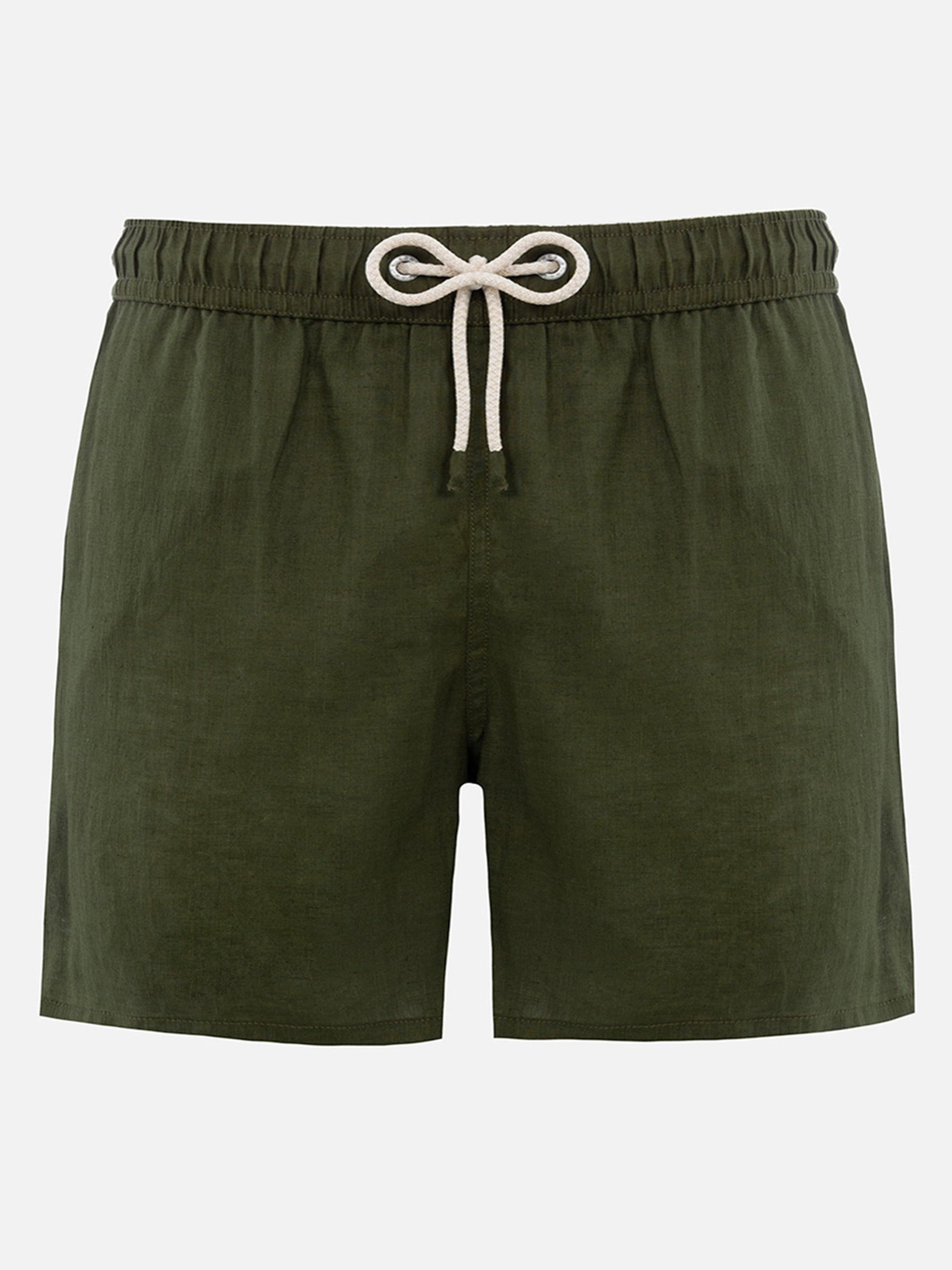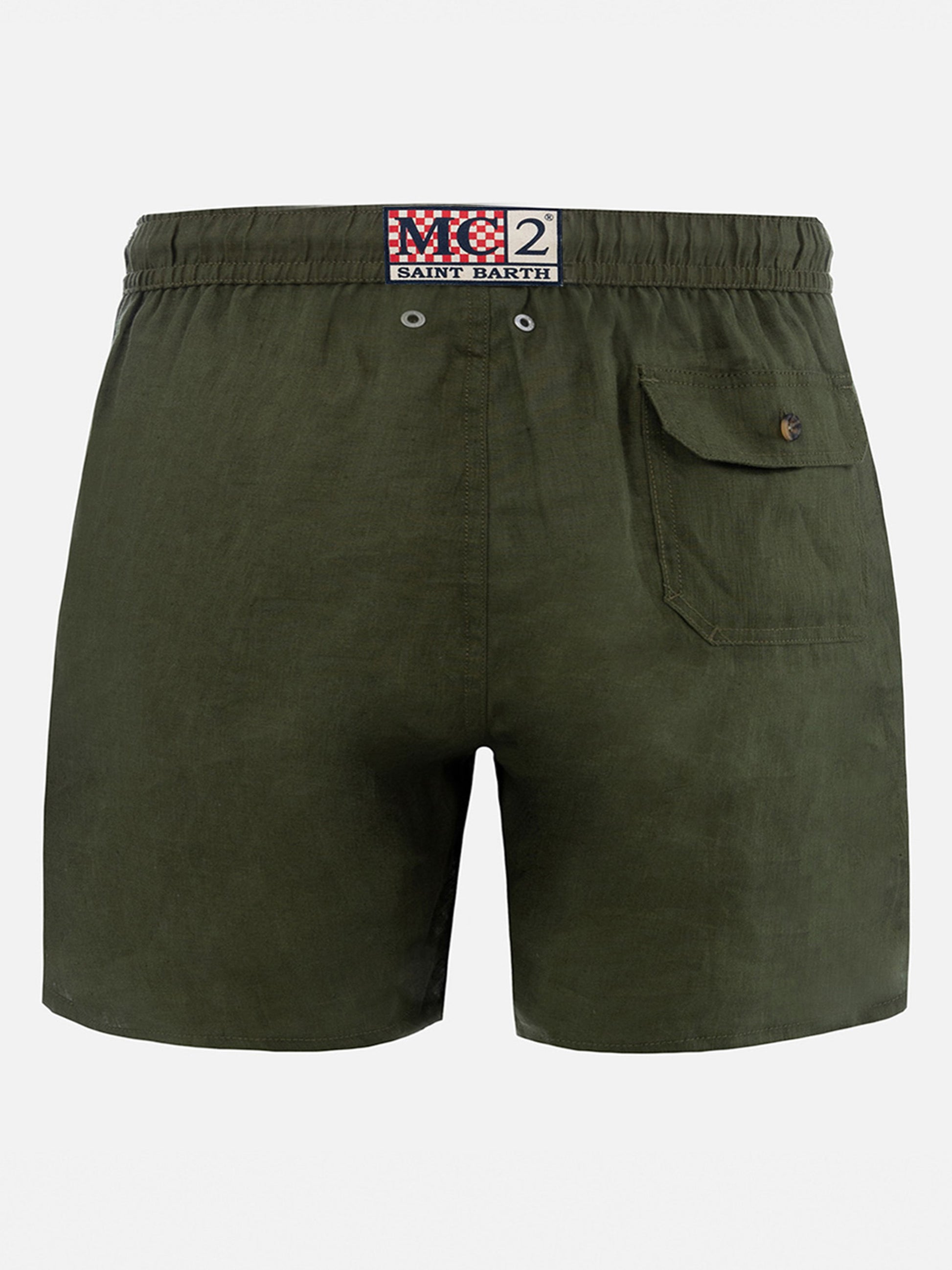 Gustavia is one of the earliest designs conceived by MC2 Saint Barth, quickly establishing itself as a timeless beachwear essential for the male summer wardrobe. Its classic fit and elasticized waist with drawstring closure ensure versatility and appeal to a wide audience. The inner mesh lining provides maximum comfort, while eyelets at the back are strategically designed to drain water and prevent ballooning. Crafted from luxurious linen fabric, Gustavia Linen offers a premium feel and is available in a diverse range of colors and patterns. Our commitment to sustainability is evident as Gustavia Linen is exclusively crafted from 100% linen material, reflecting our dedication to environmental responsibility. Man linen mid-length swim shorts Military green plain color Elasticated waistband for comfort Adjustable drawcord with linen terminals Inner net lining Side pockets with French seams Back patch pocket with button closure Branded eyelets designed to drain water and avoid the ballooning effect MC2 Saint Barth exclusive label on the back Classic fit Composition: 100% linen Size L has a half waistband width of 58 cm (stretched) and varies by 2 cm for each size; side length including waistband 41,5 cm Please note that all measurements provided are approximate and subject to a tolerance of 1-2 cm due to manual measurement. This tolerance range is normal and should be expected. Model is 185 cm and wears a size large Care Instructions: this garment has been treated using special handcrafted procedures; please, follow the label instructions on the internal label to extend the life of the garment. Do not use in chlorine water; do not rub and do not leave the garment exposed to the sun. Cold wash by running water and neutral soap. Do not leave to soak and do not dry in contact with other clothing.