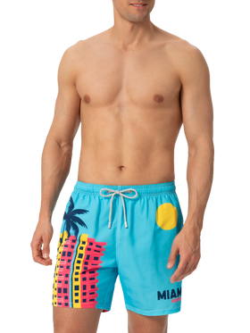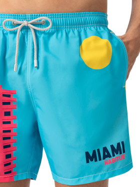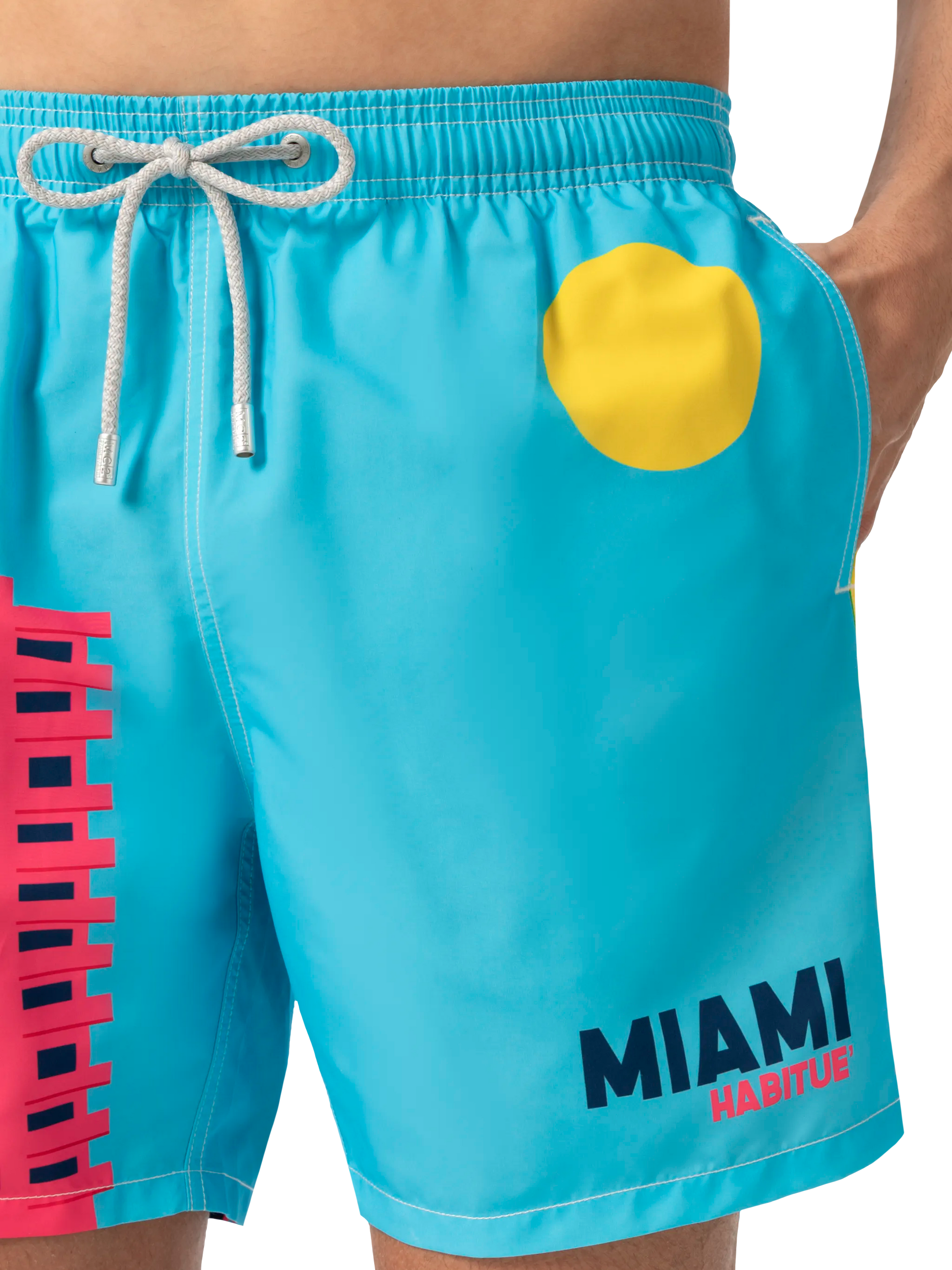 Mid-length Gustavia swim-shorts with Miami postcard placed print