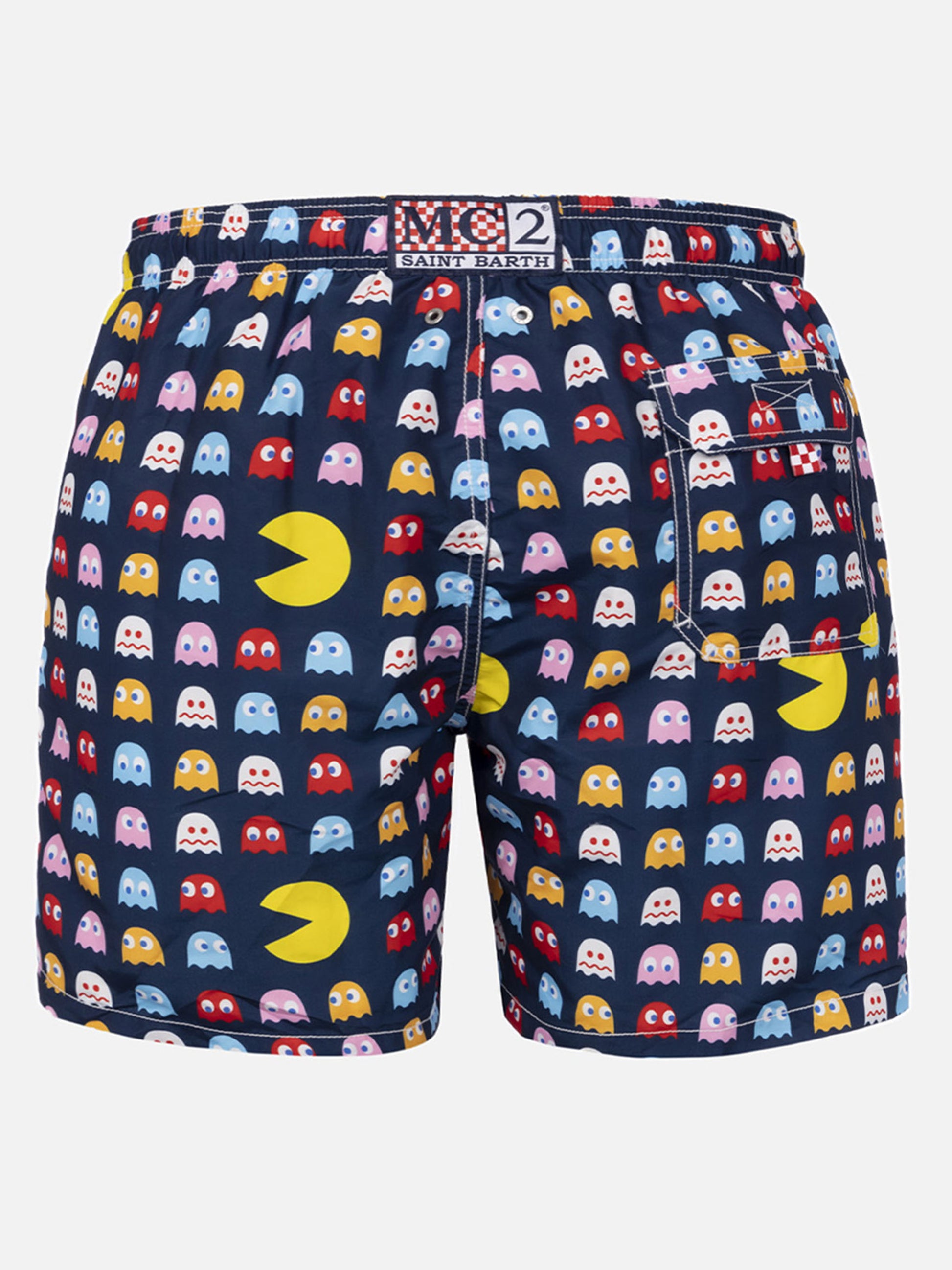 Man Gustavia mid-length swim shorts Peach touch effect fabric Pac-Man video game all over print Navy blue backcloth Elasticated waistband for comfort Adjustable drawcord with branded terminals Inner net lining Side pockets with French seams Back patch pocket with velcro closure Branded eyelets designed to drain water and avoid the ballooning effect MC2 Saint Barth exclusive label on the back Classic fit Composition: 100% recycled polyester Size L has a half waistband width of 52 cm (stretched) and varies by 2 cm for each size; side length including waistband 41.5 cm Please note that all measurements provided are approximate and subject to a tolerance of 1-2 cm due to manual measurement. This tolerance range is normal and should be expected. Model is 185 cm and wears a size large Care Instructions: cold wash by running water and neutral soap. Hang to dry. Do not leave to soak and do not dry in contact with other clothing. Do not leave the garment wet in contact with other clothing.