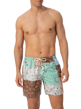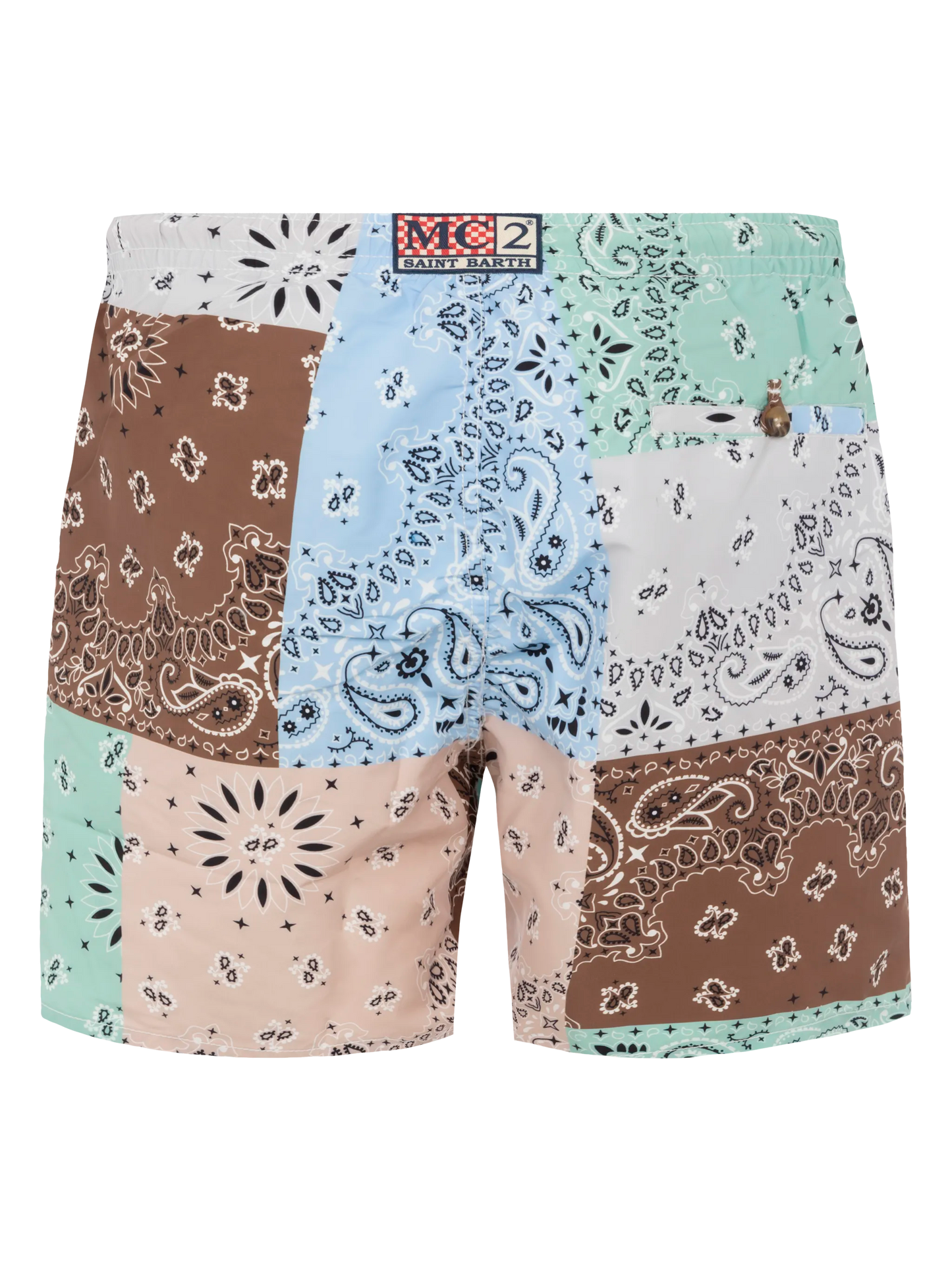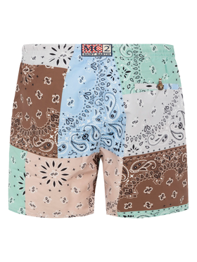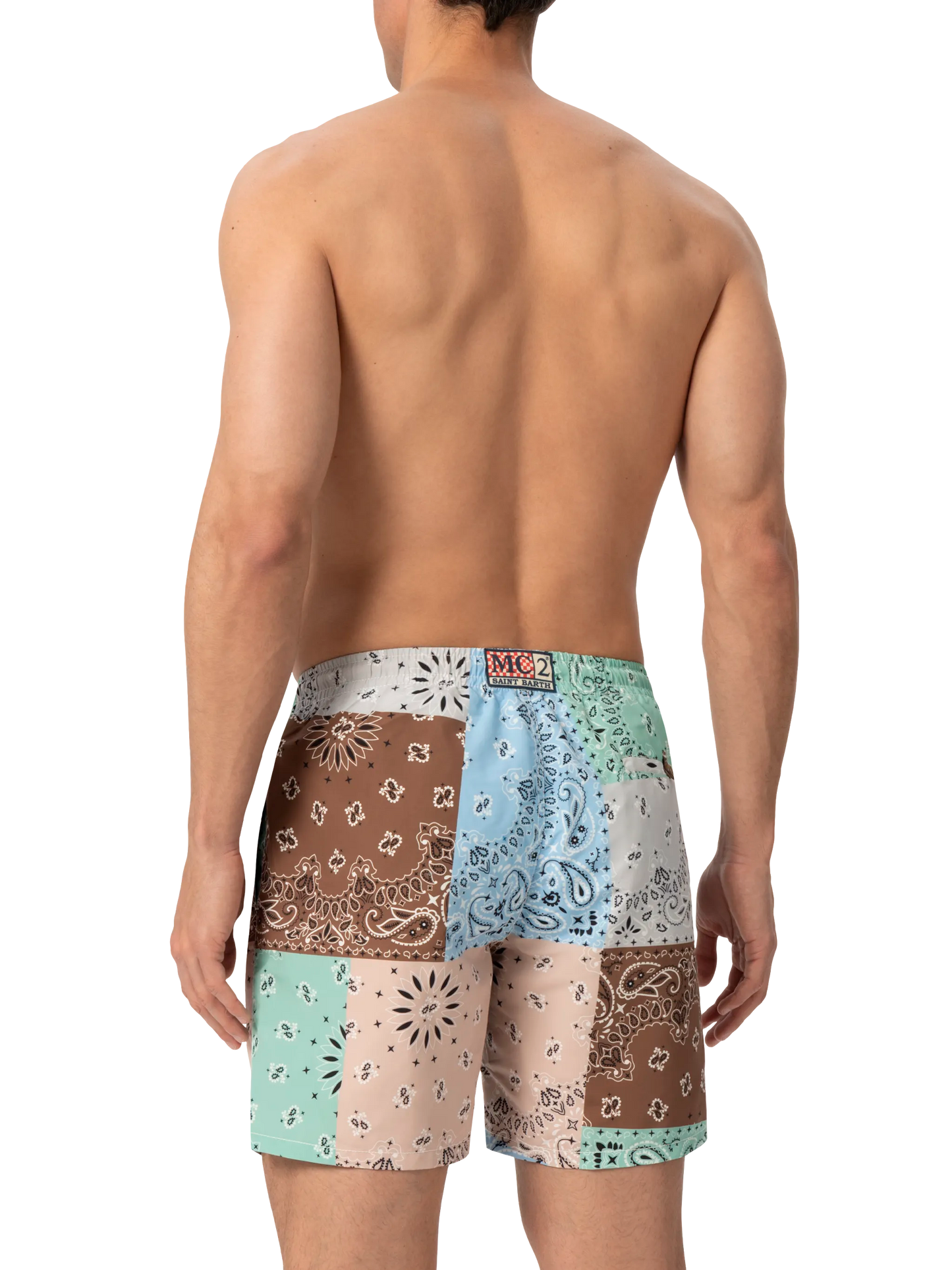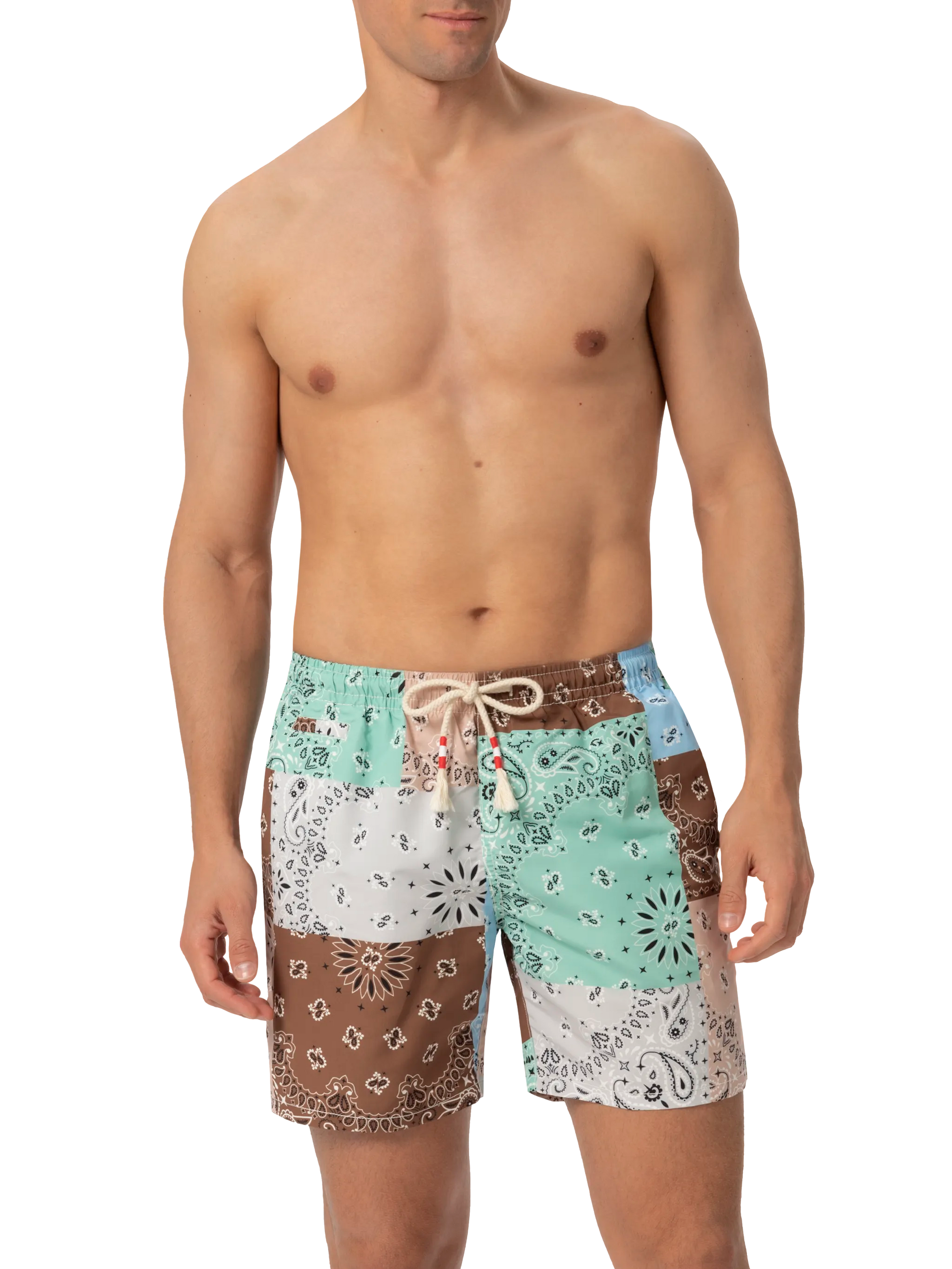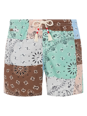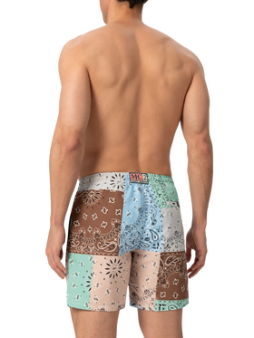 Man mid-length swim shorts Handwoven peach fabric Bandanna patch all over print Beige and natural color hues Elasticated waistband for comfort Adjustable rope-effect drawcord Inner net lining Side pockets with French seams Back pocket with button closure Front right welt micro pocket Regular fit Composition: 100% recycled polyester Size L has a half waistband width of 52 cm (stretched) and varies by 2 cm for each size; side length including waistband 42 cm and varies by 1 cm for each size Please note that all measurements provided are approximate and subject to a tolerance of 1-2 cm due to manual measurement. This tolerance range is normal and should be expected. Model is 185 cm and wears a size large